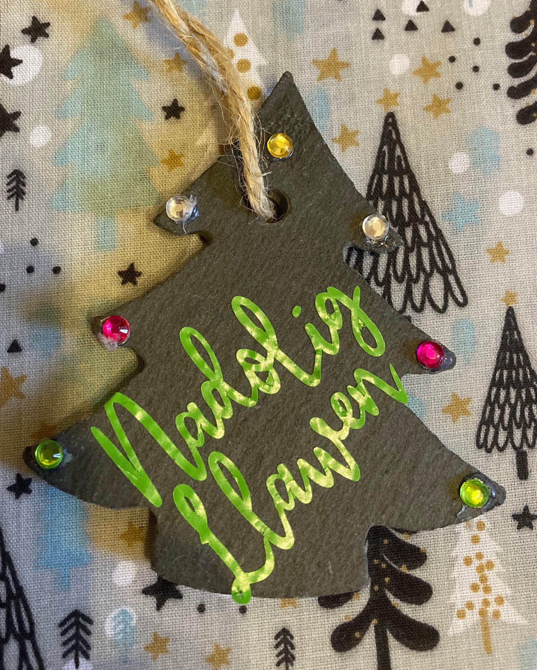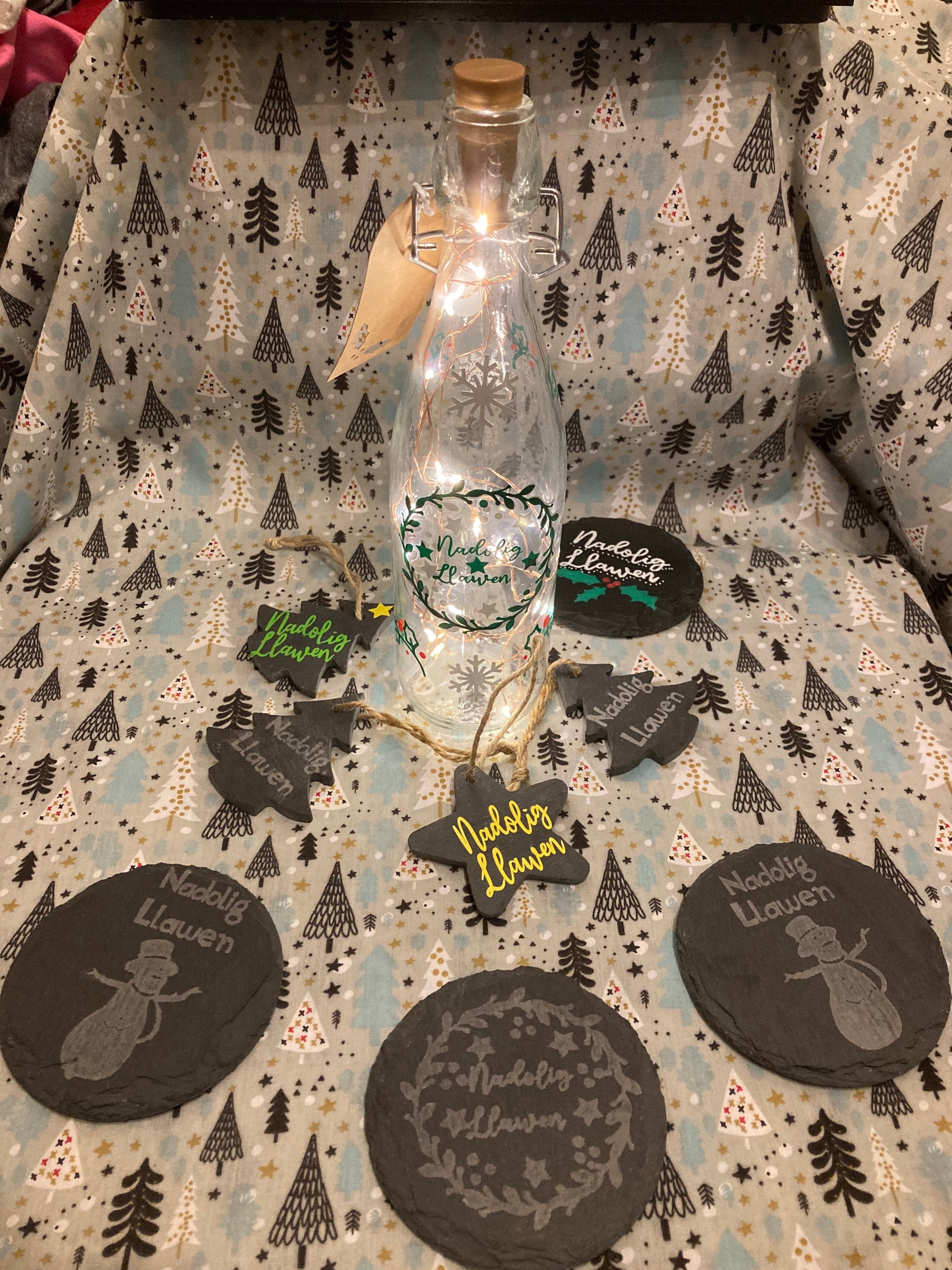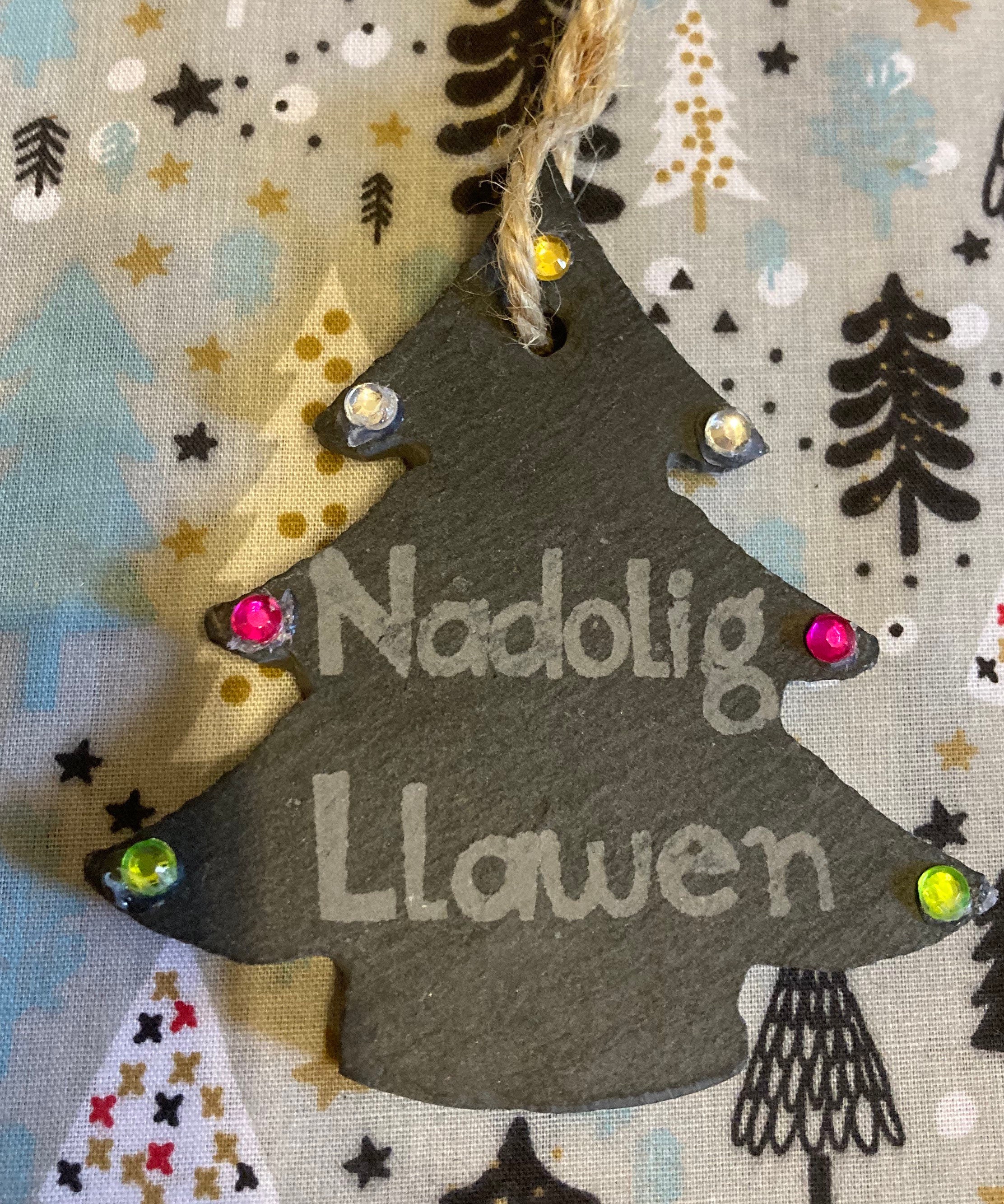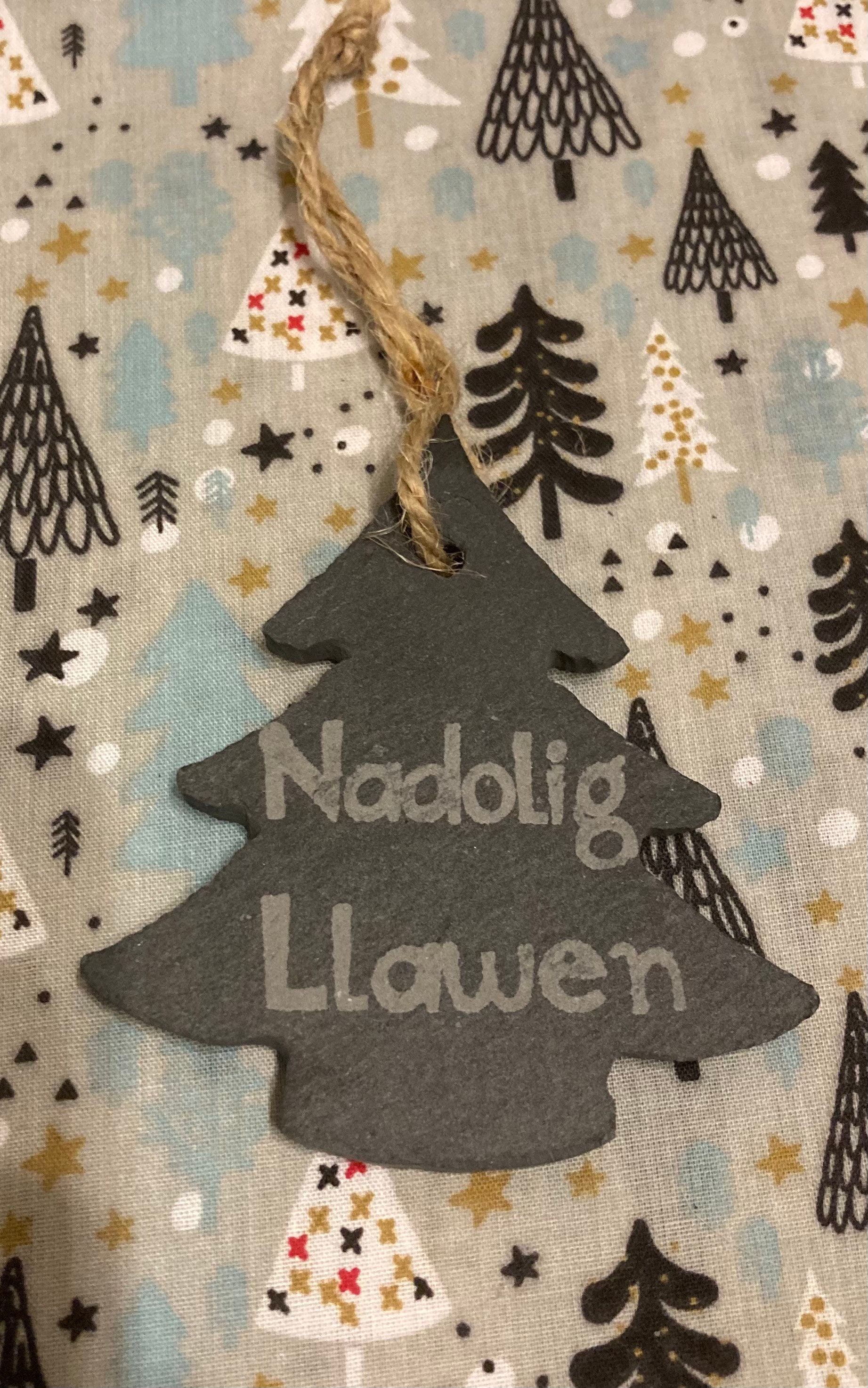 Llechen bach siap Seren neu Coeden Nadolig, yn barod i’w hongian efo’r geiriau ‘Nadolig Llawen’/