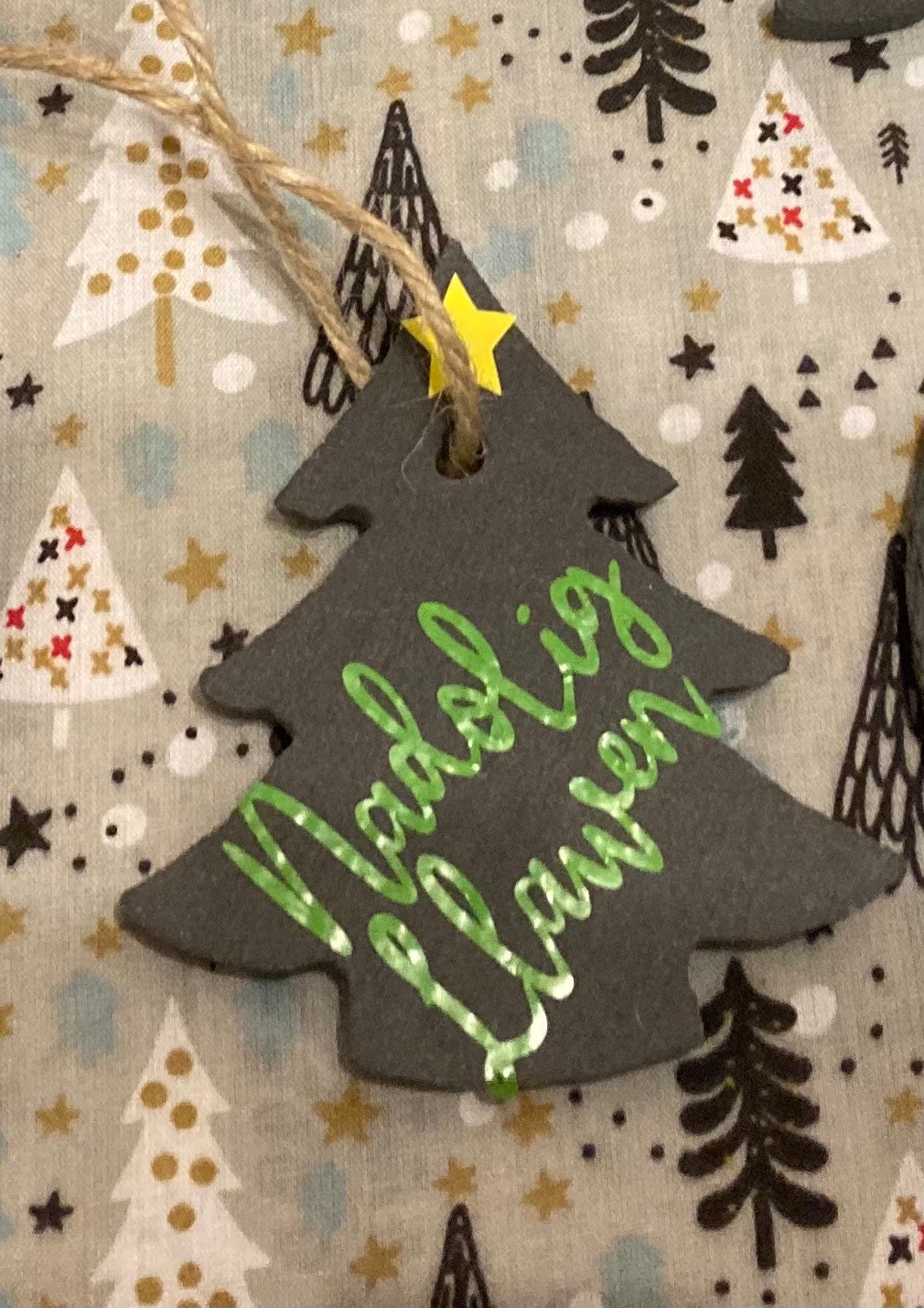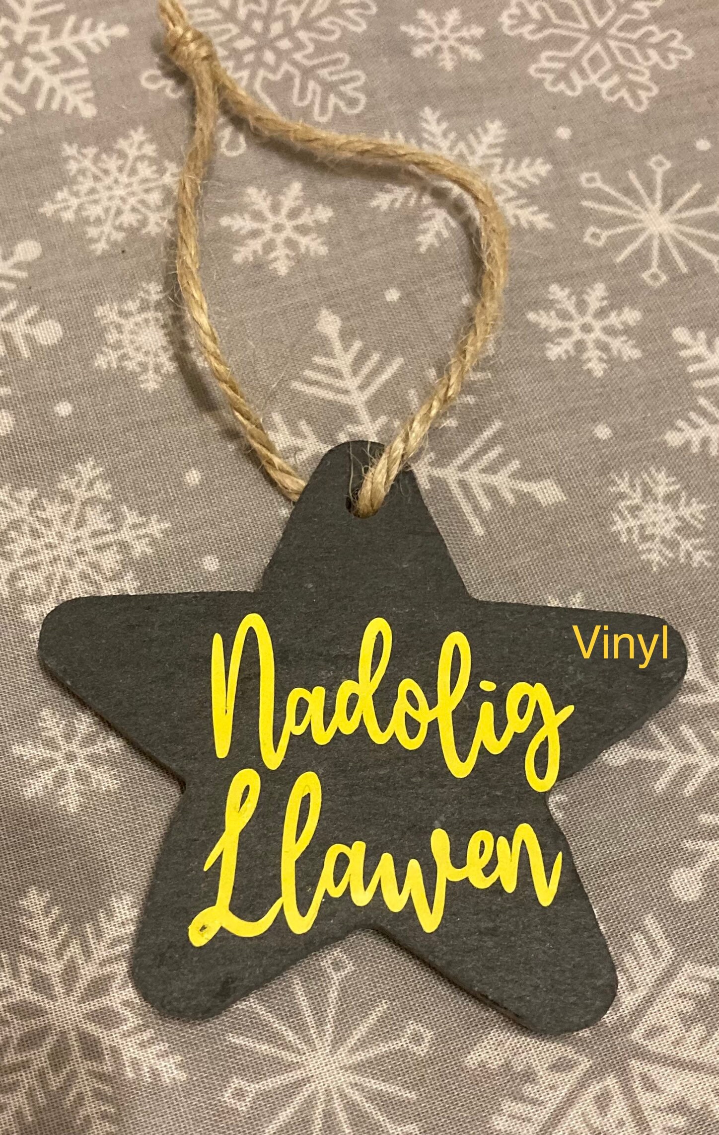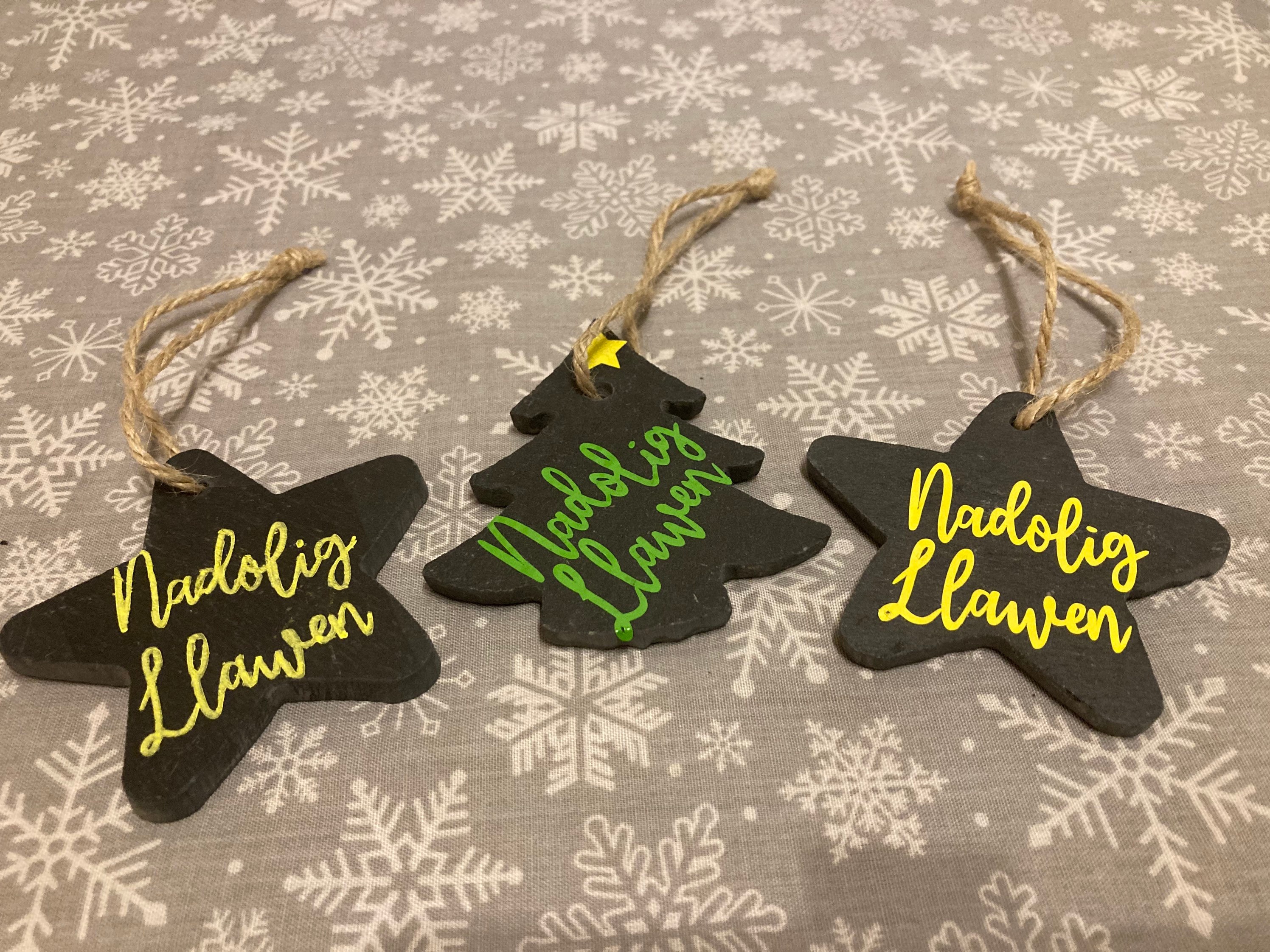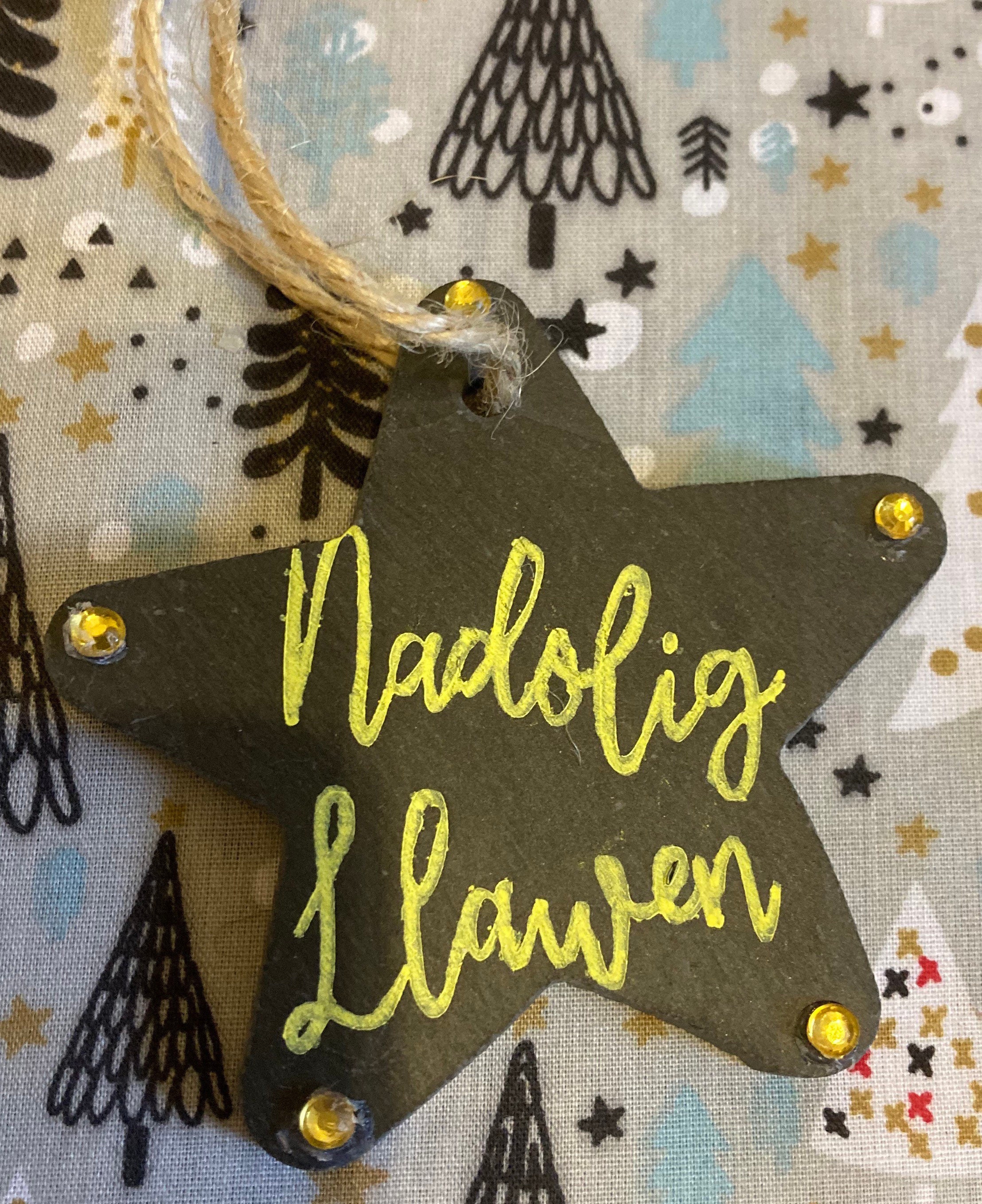 Small Star or Christmas tree slate hanging decoration, with the words Merry Christmas in Welsh (if you’d rather it in English please send a message with your purchase )