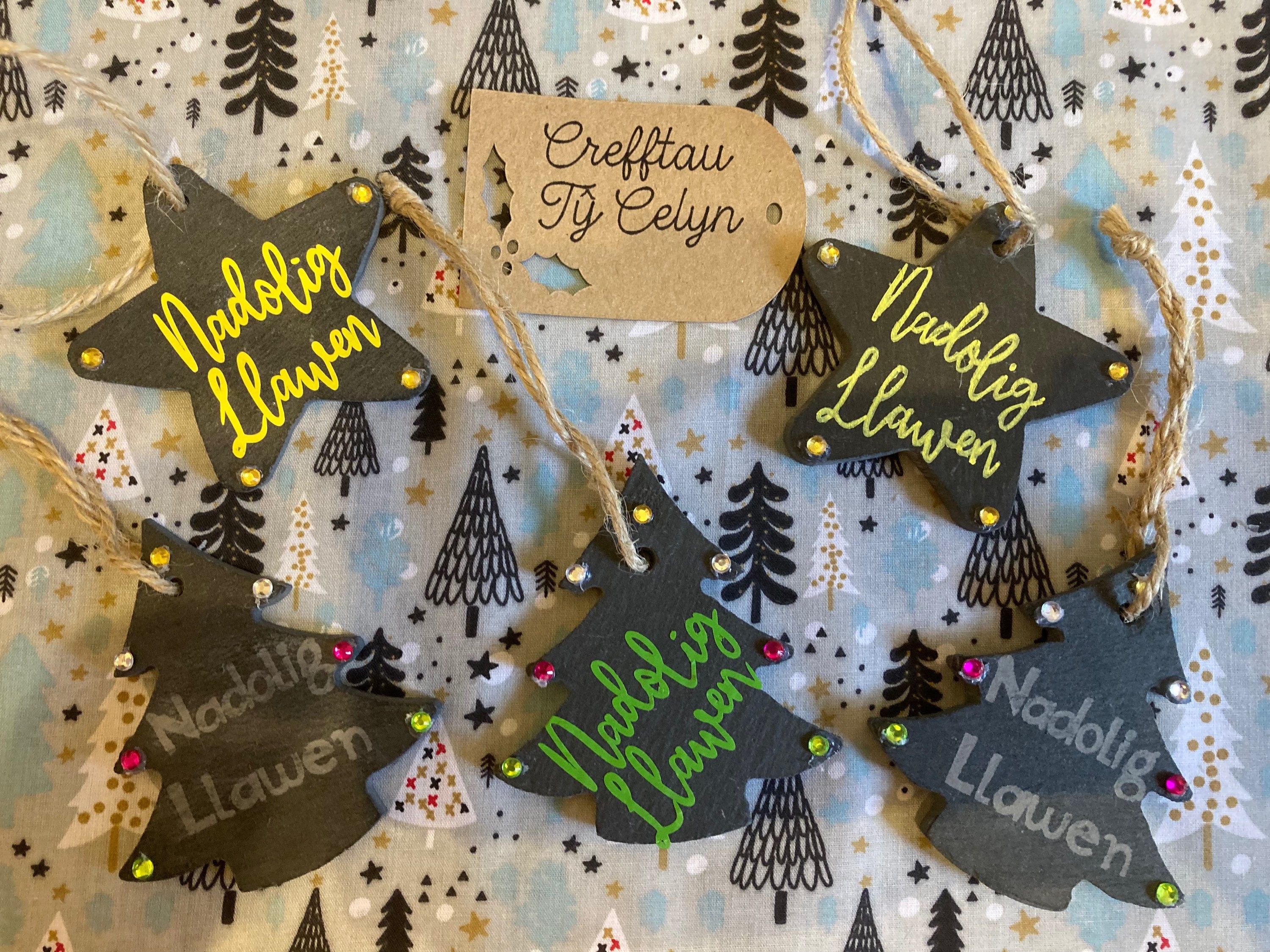 Addurn Llechen Nadolig Llawen i’w hongian/ Christmas slate hanging decoration- tree or star . Coeden neu Seren