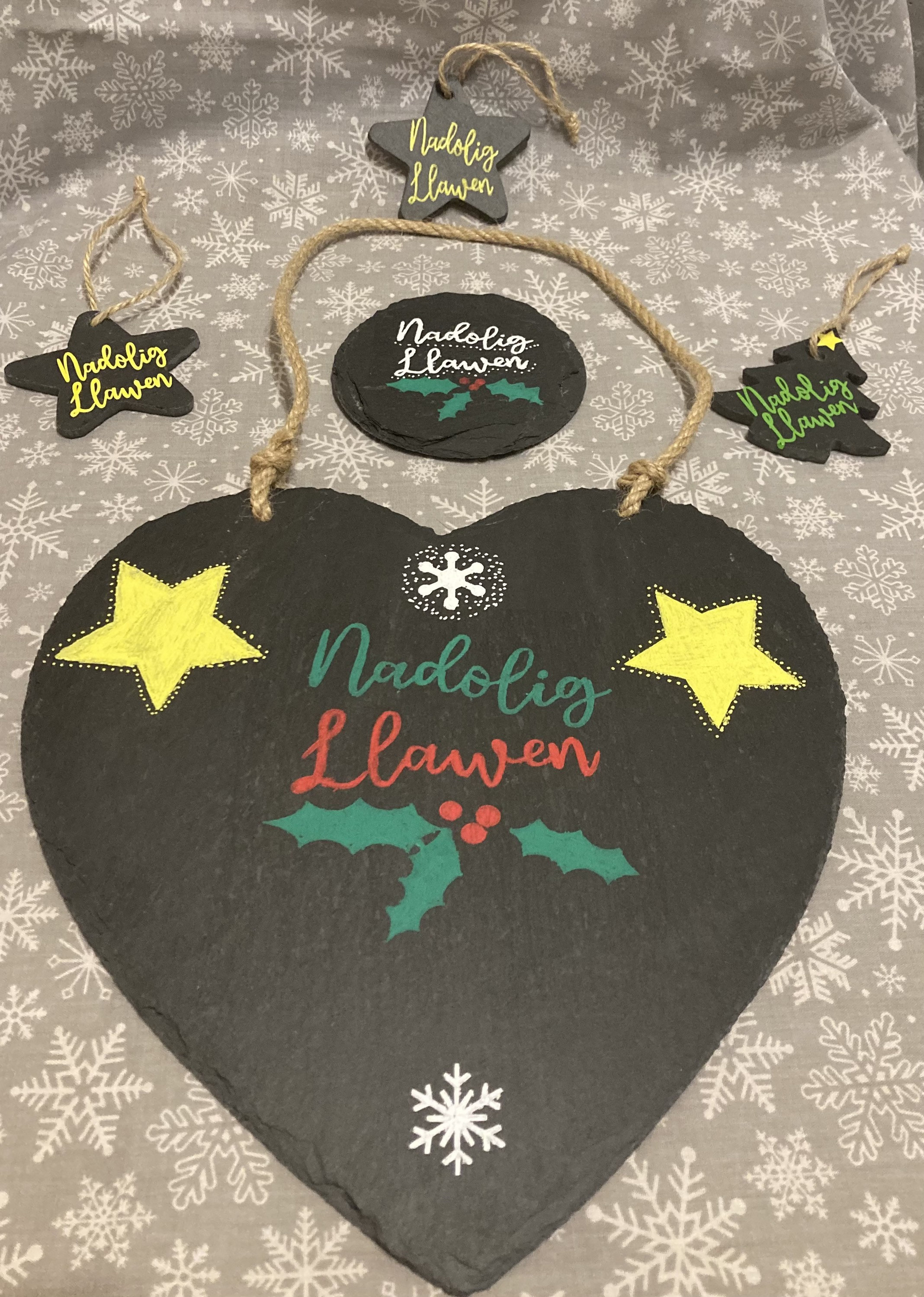 Addurniadau llechen arall ar gael yn y siop Etsy / Other slate decorations available in separate listings.