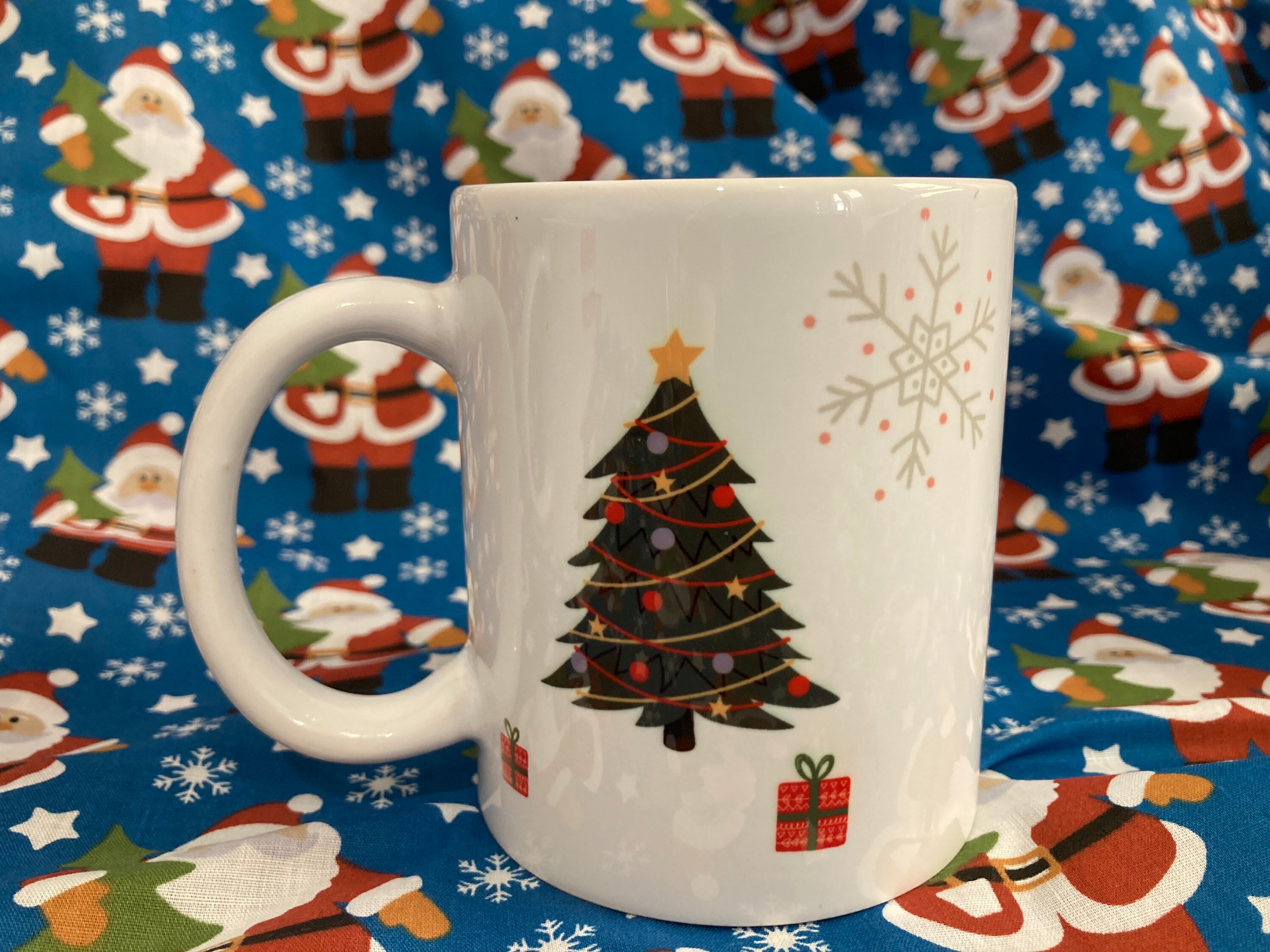 Myg Nadolig Llawen a dyluniad Nadoligaidd, a gellir personaleiddio cefn y myg os dymunir.