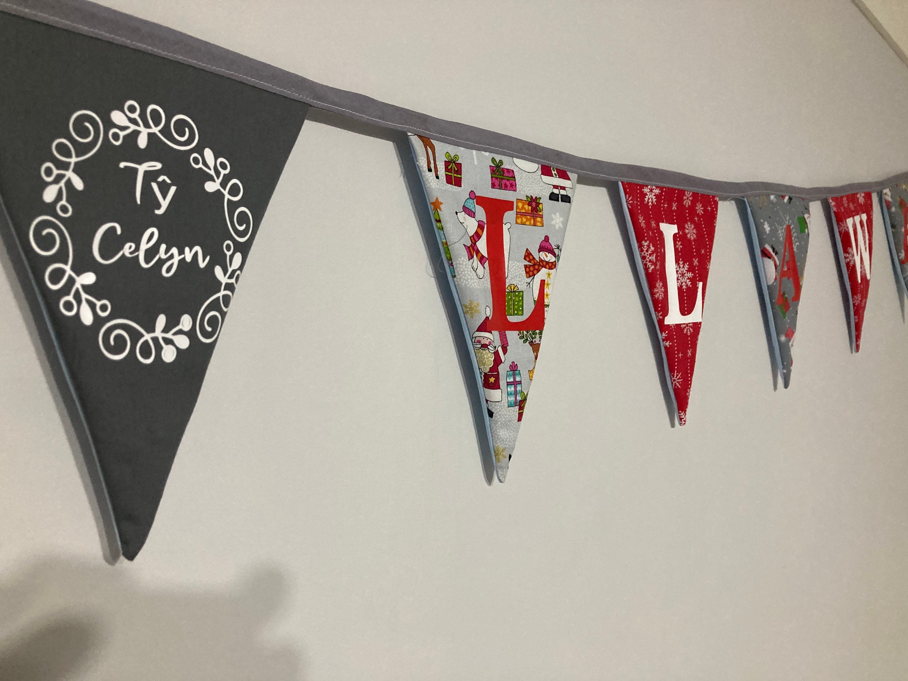 Gellir personaleiddio y fanner canol efo enw’ch teulu neu Cartref e.e “Tŷ Celyn”- mae hwn yn cael ei brintio efo “heat transfer vinyl” (fel y llythrennau)./ The middle flag can be personalised with your family or home name for no extra cost.
