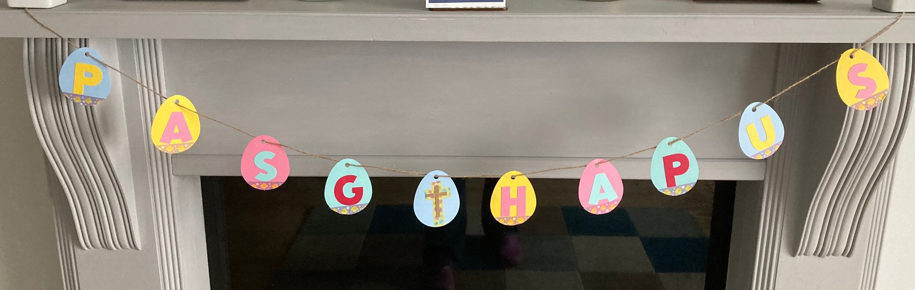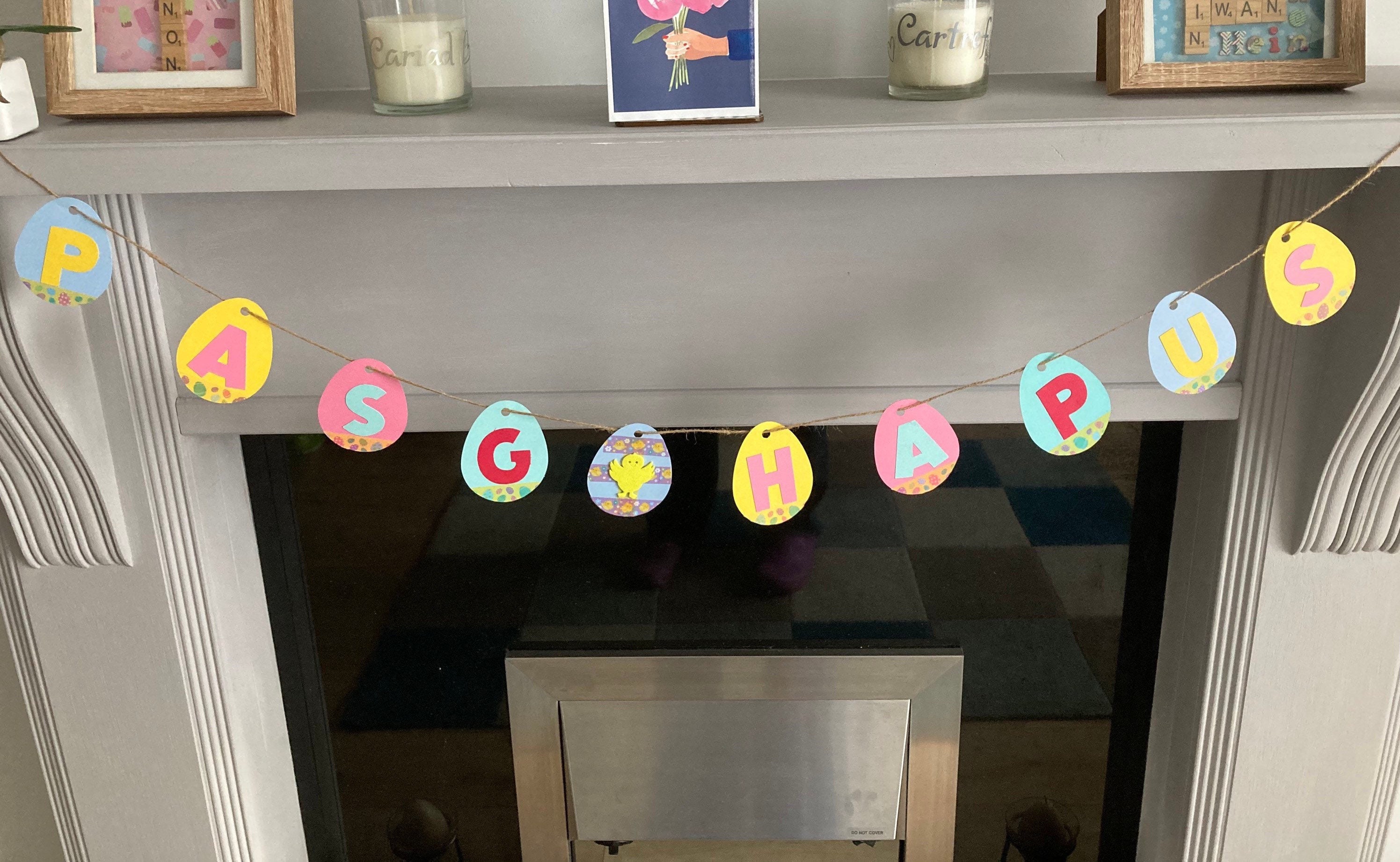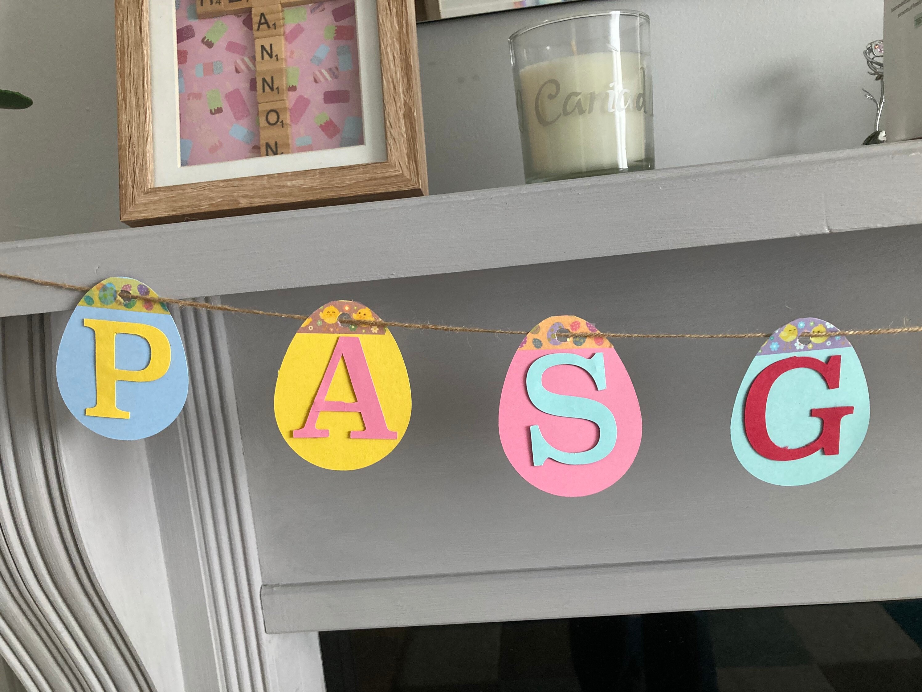 Baner PASG HAPUS wedi ei wneud a llaw. Wedi ei wneud allan o cerdyn, a llinyn naturiol ‘jute’ yn ei ddal at ei gilydd.