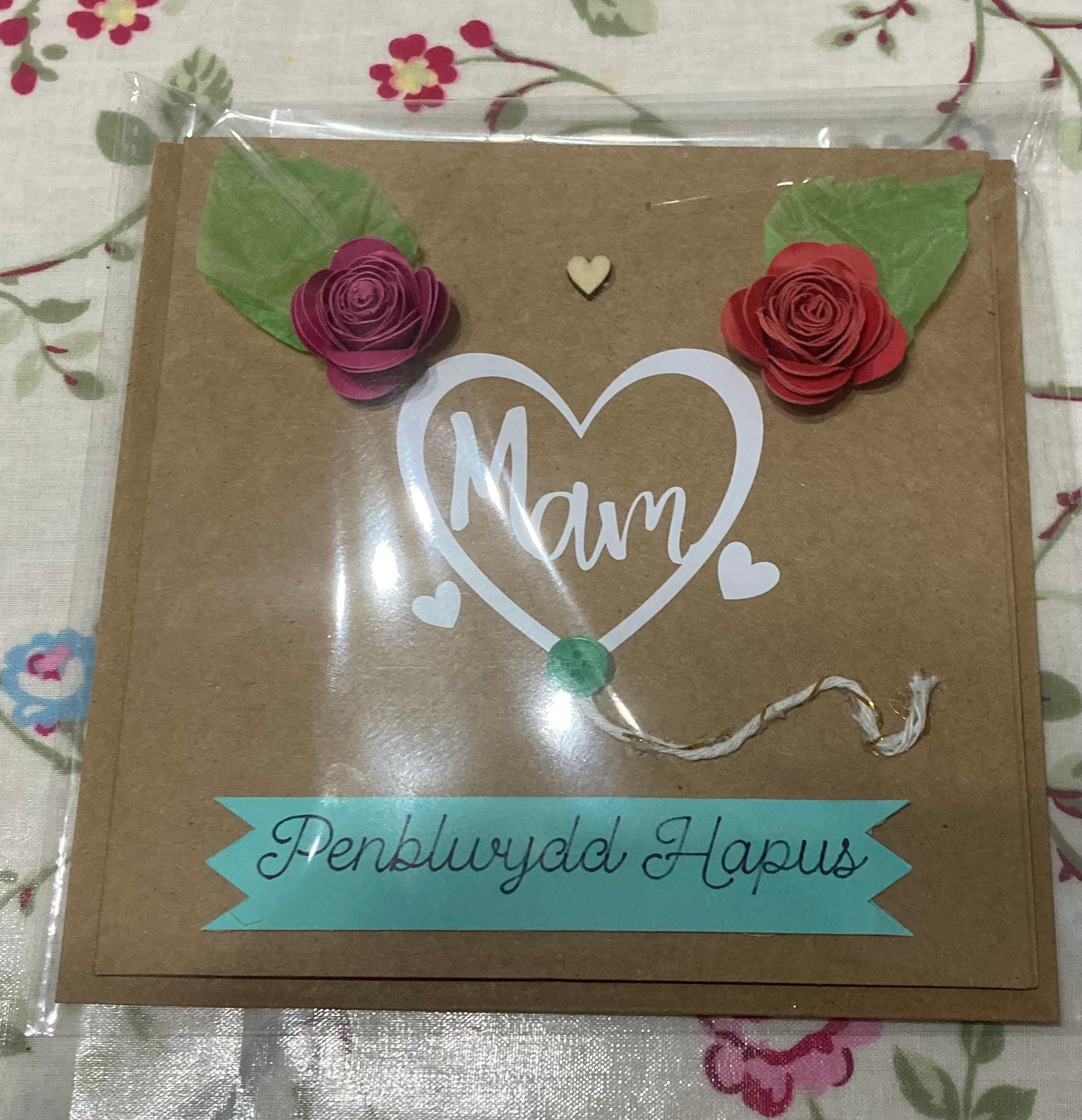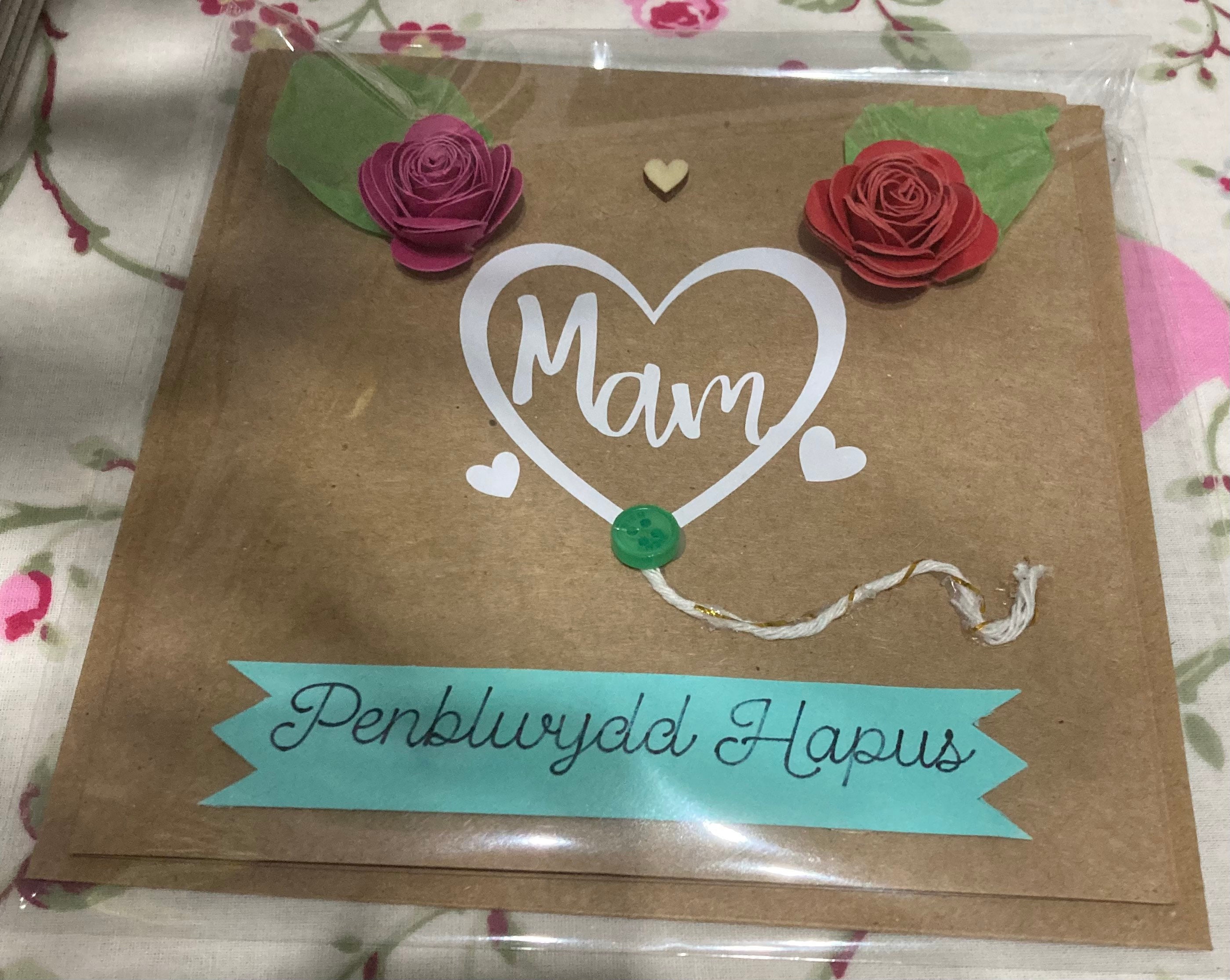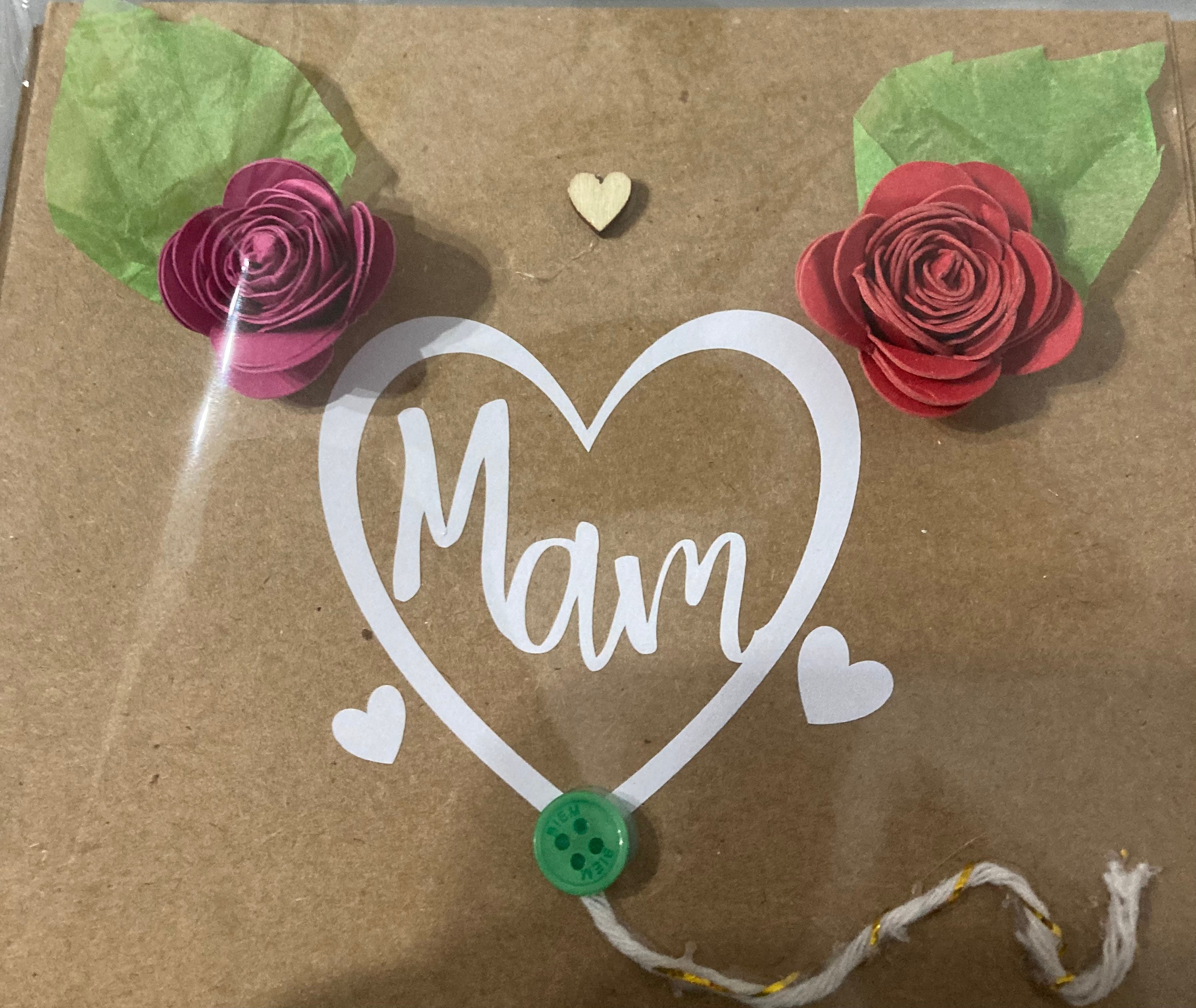 Cerdyn unigryw, efo calon a’r enw Mam, rhosod cerdyn yr wyf wedi neud a llaw,, a Calon bach pren.