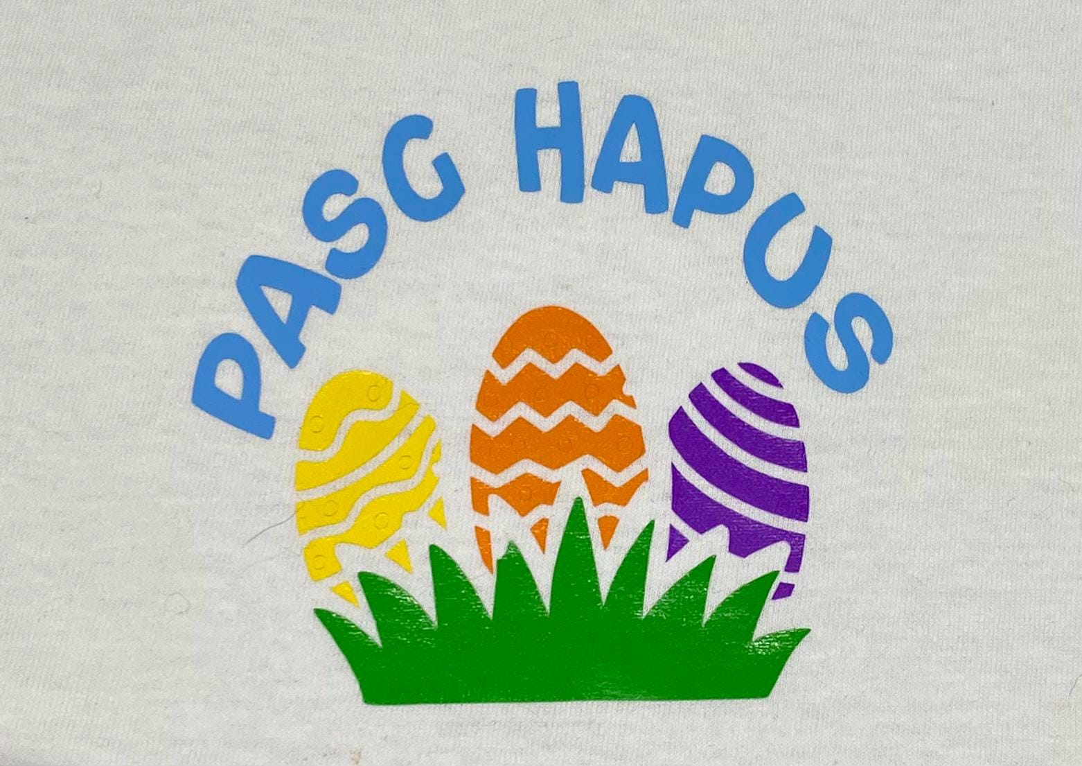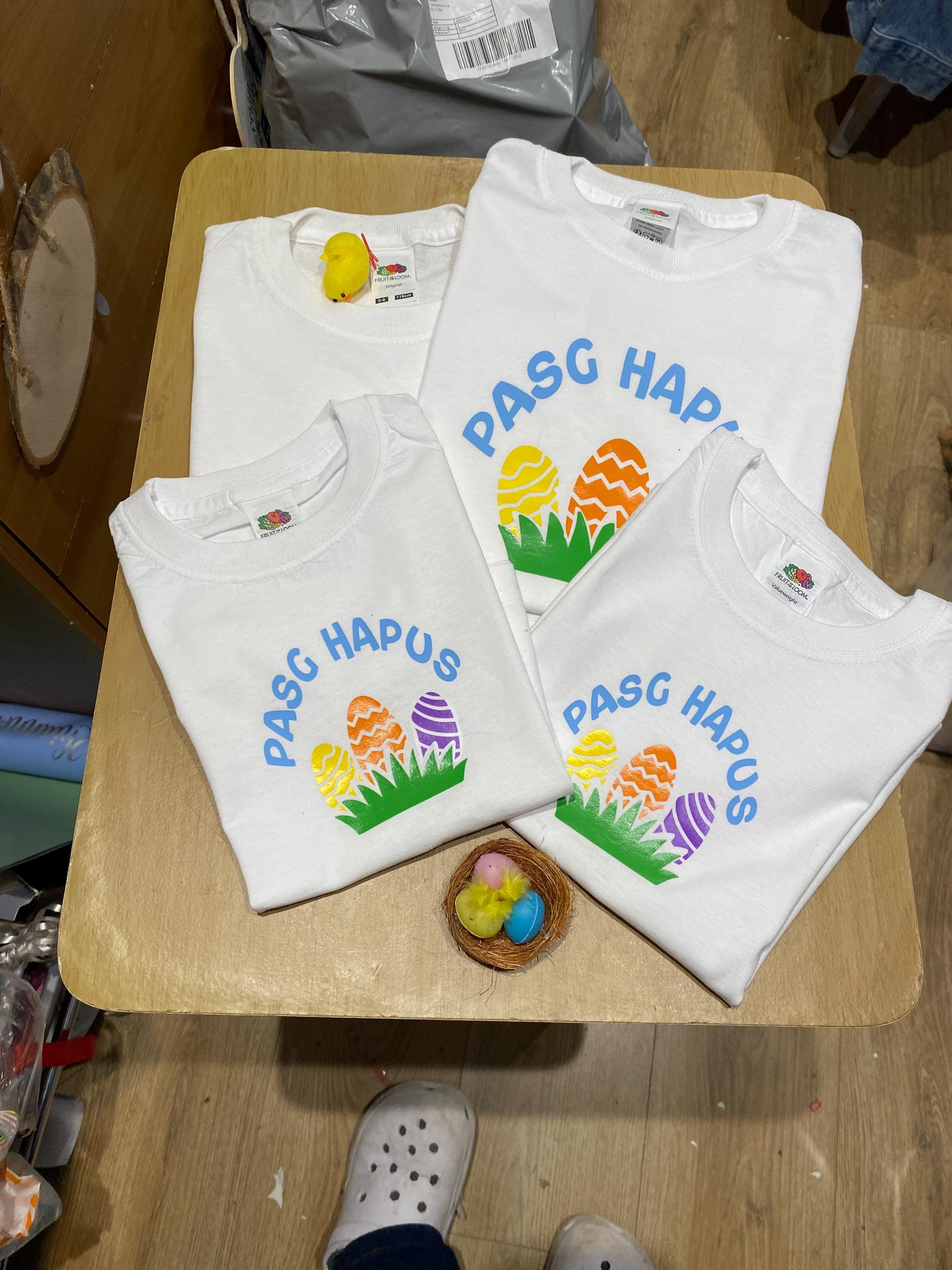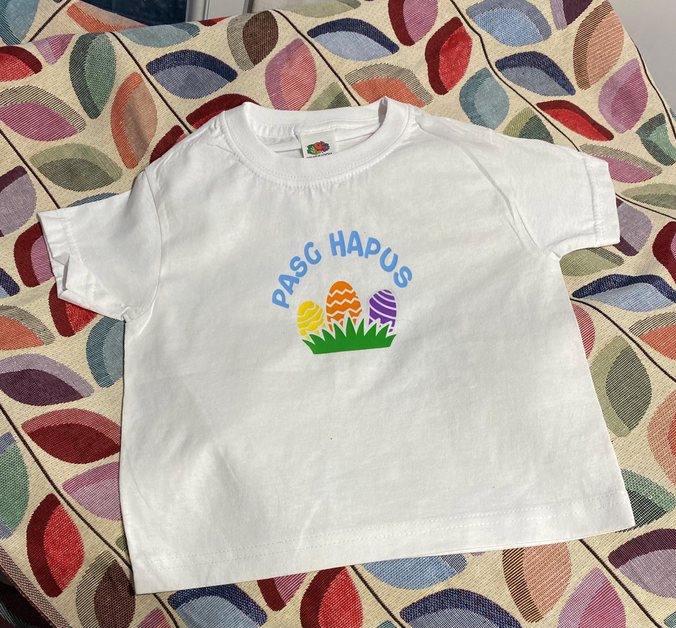 White cotton T-shirt with a Easter design, and a choice of the words Pasg Hapus (Welsh) or Happy Easter.
