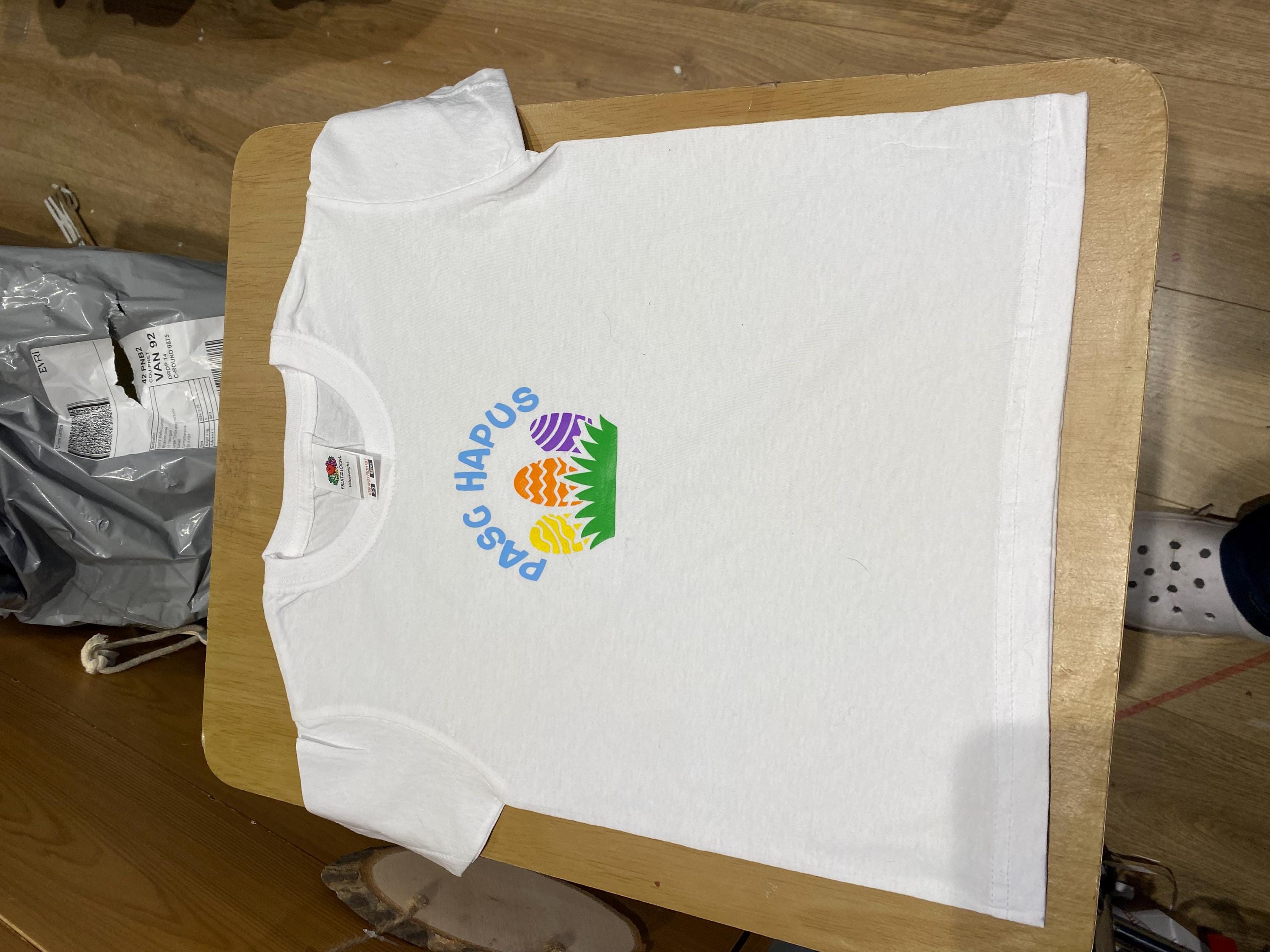 Crys T gwyn cottwm efo dyluniad Pasg, a’r geiriau ‘Pasg Hapus’.