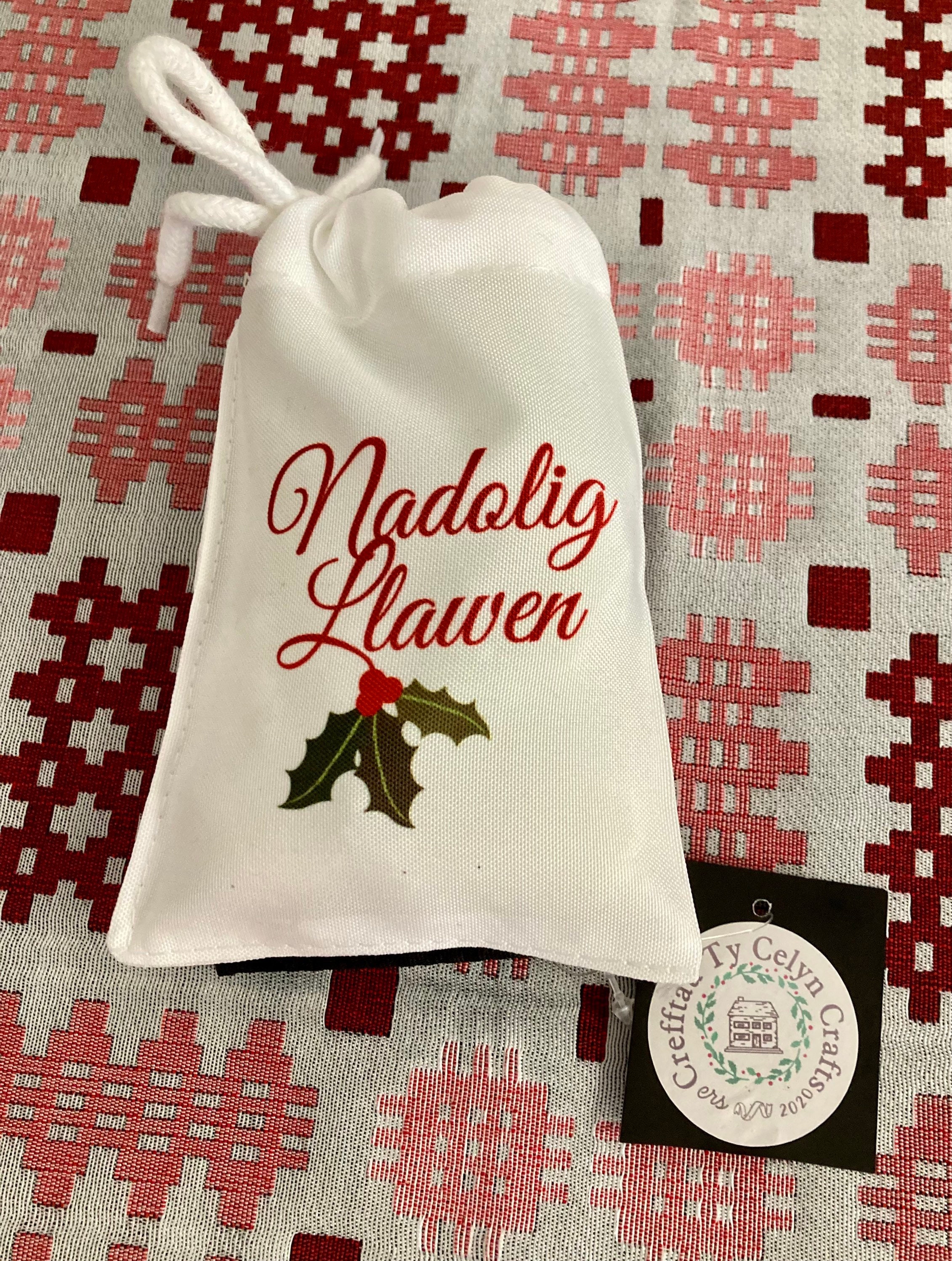Bydd 2 pecyn o doddion cwêr yn dod mewn bag bach efo’r geiriau ‘Nadolig Llawen’. Maint y bag tua 10cm x 10cm.