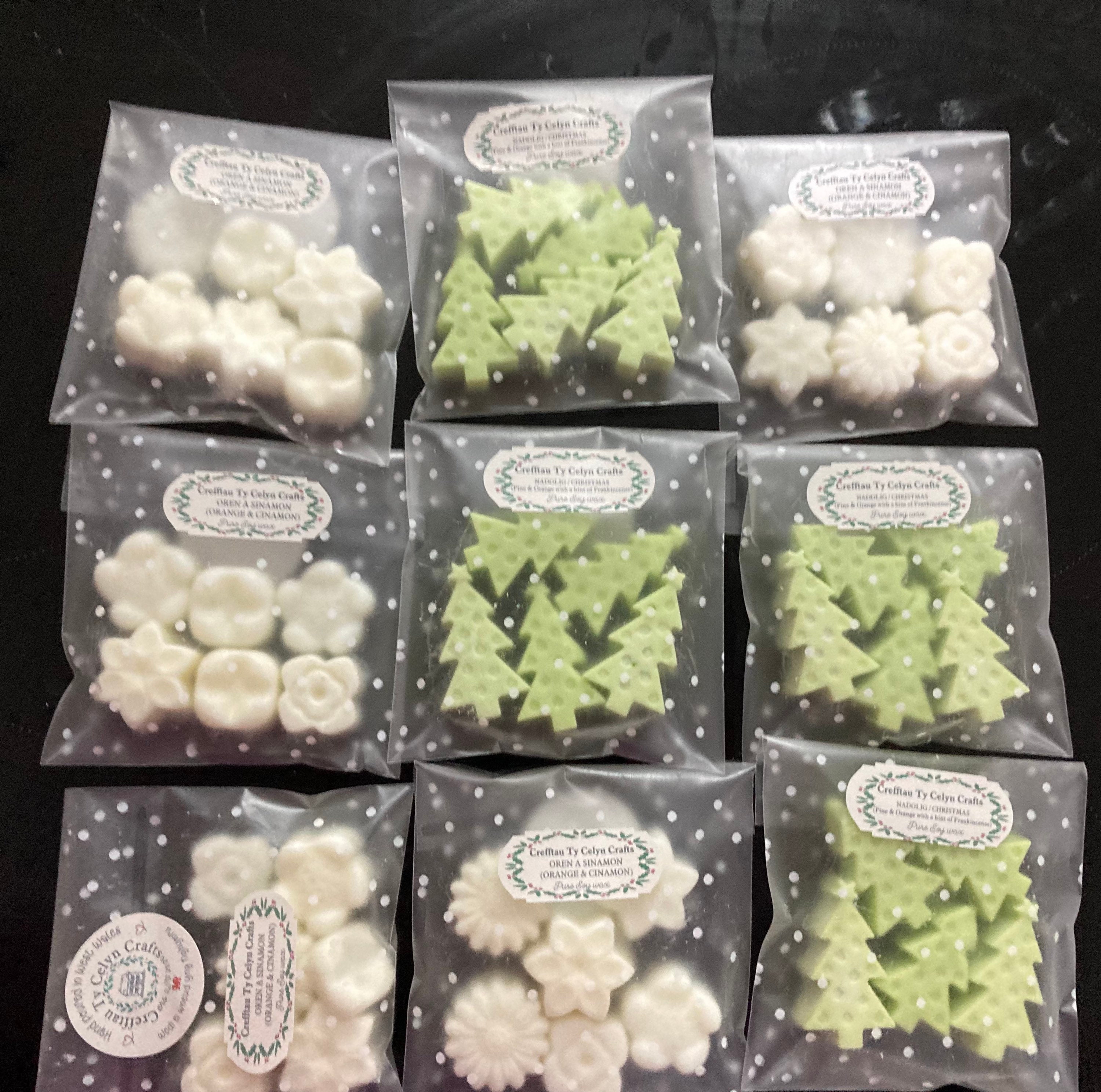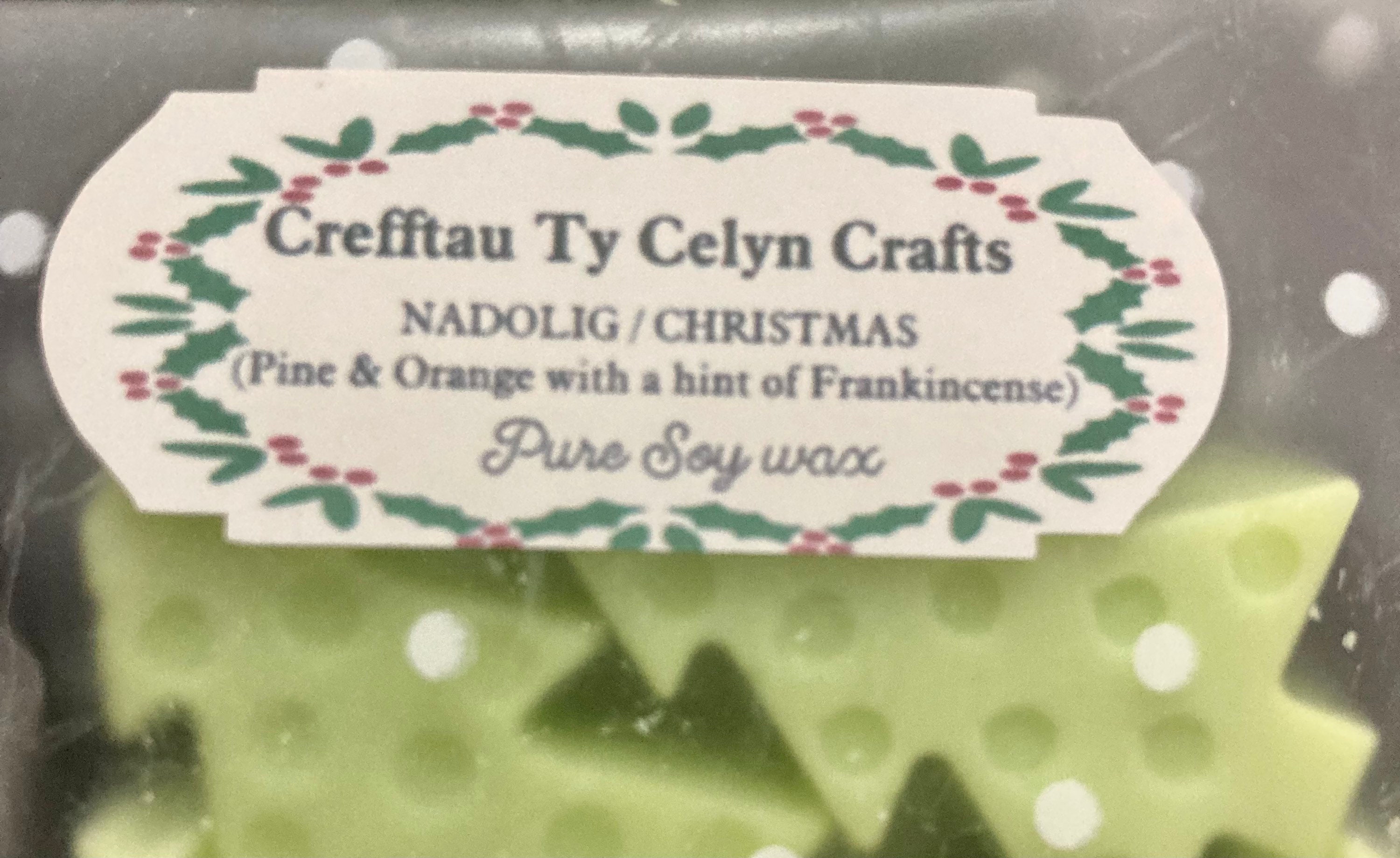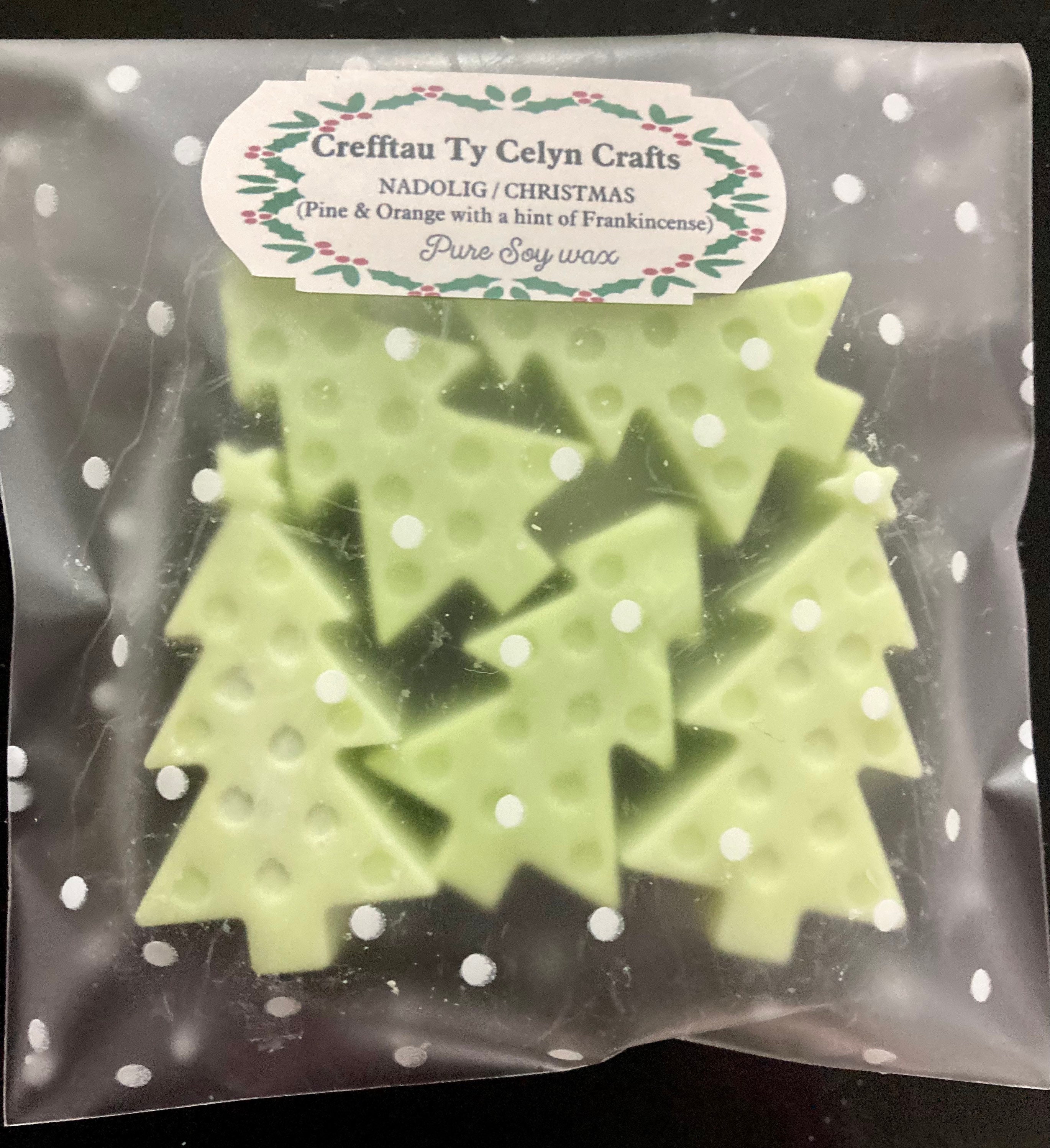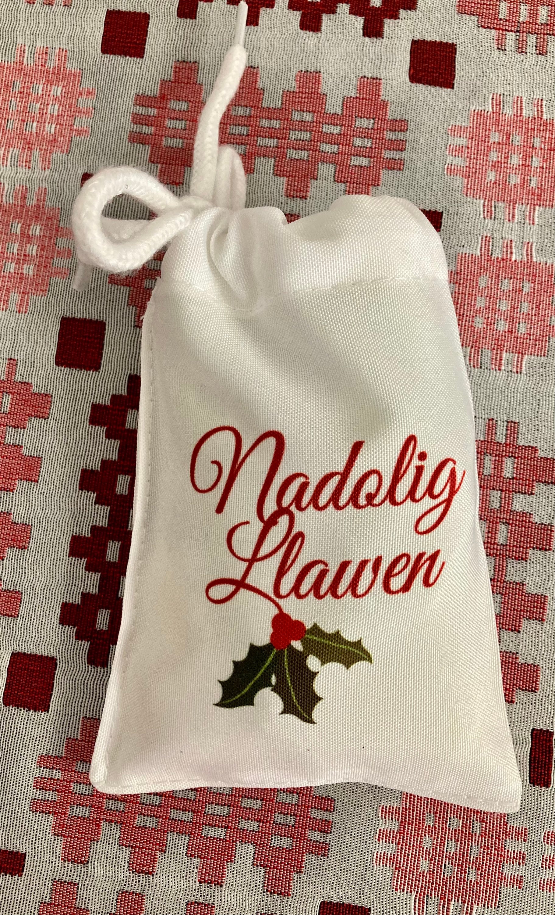 2 packs of 6 (or 5 Christmas trees as they are slightly larger than the others) wax melts come in a small drawstring bag with the wording ‘Nadolig Llawen’(Welsh for Merry Christmas).