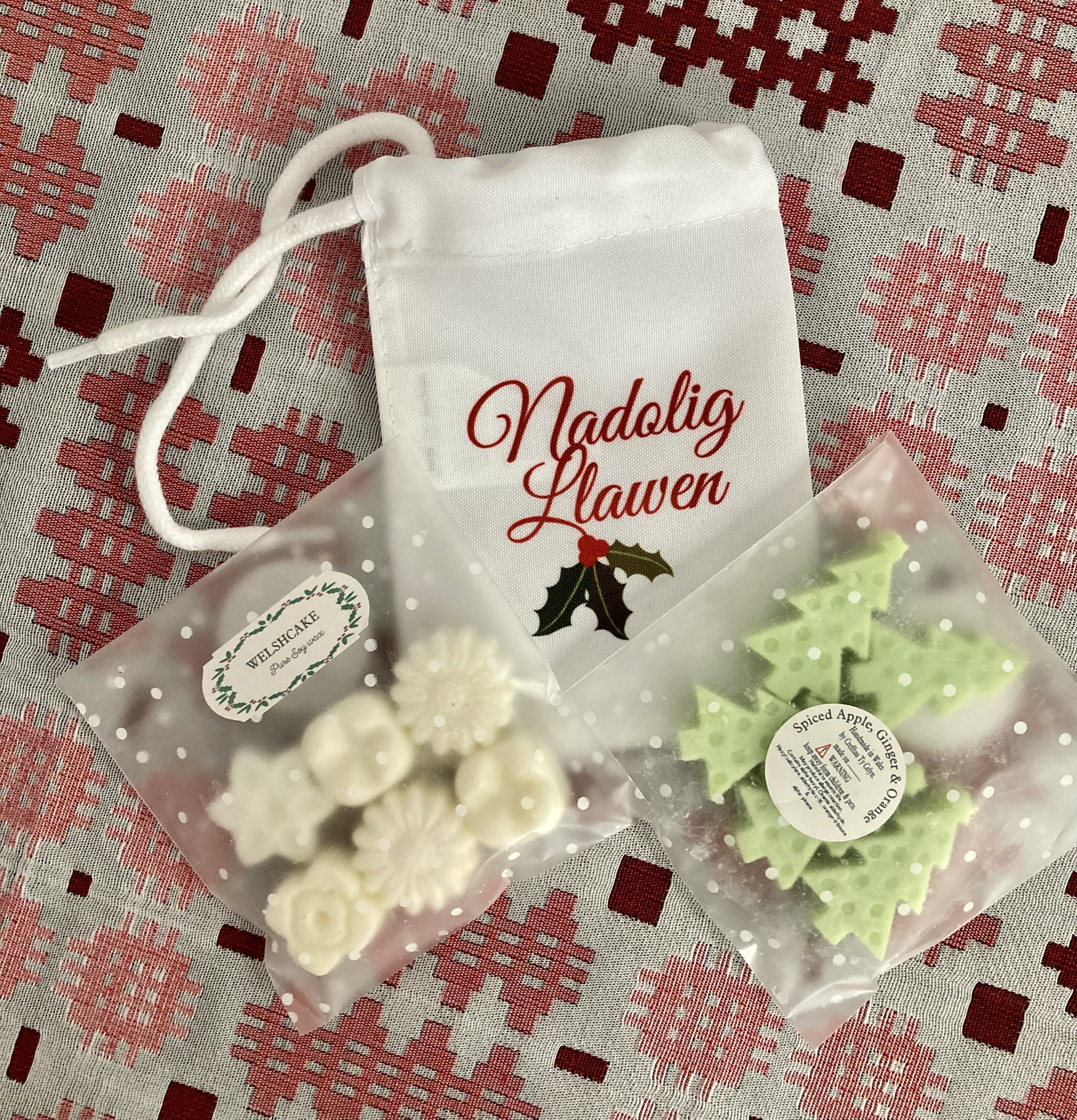 Welsh Wax melt gift set/ Bag bach Nadolig Llawen a 2 pecyn o Toddion cwêr wedi eu gwneud yn Nghymru.
