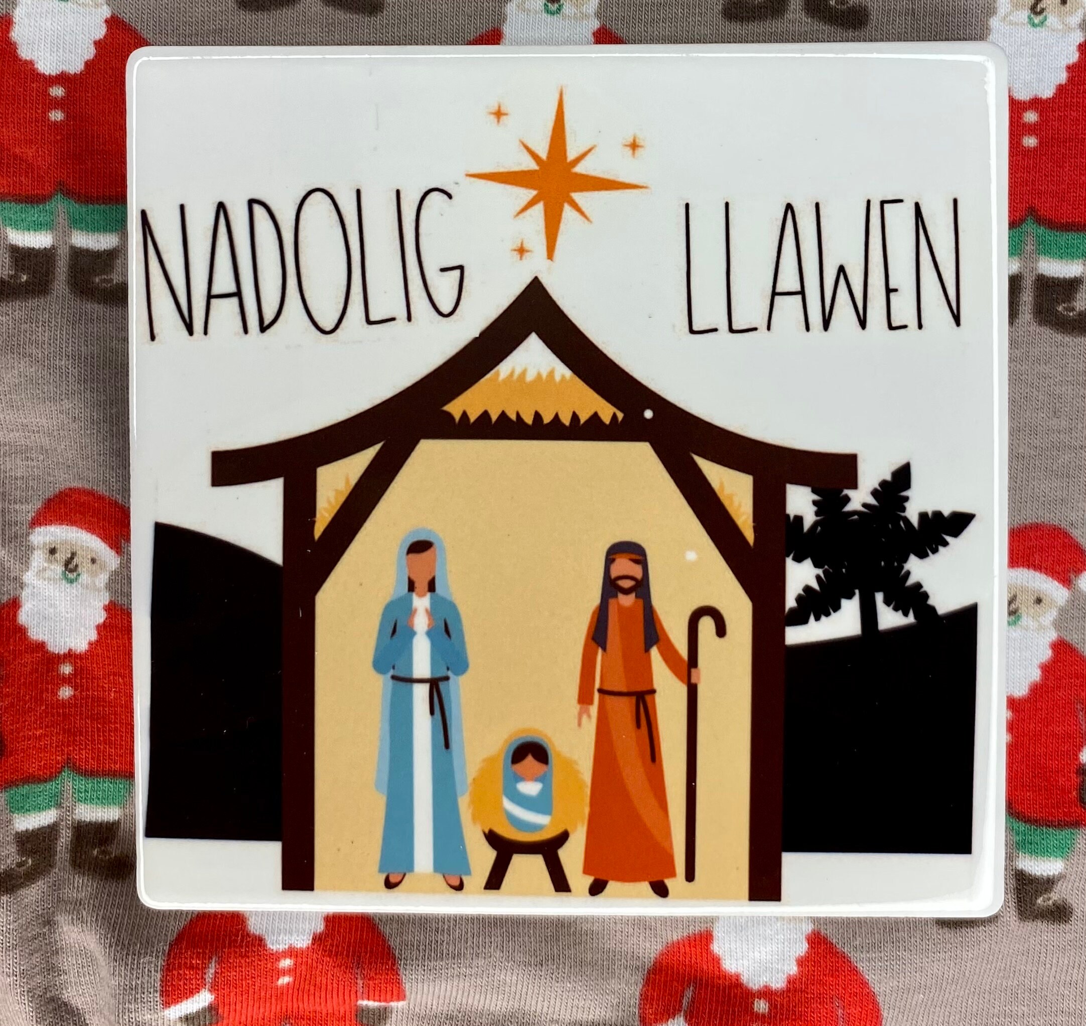 Coaster seramig efo dyluniad ‘Nadolig Llawen’ wedi syblimeiddio arno.