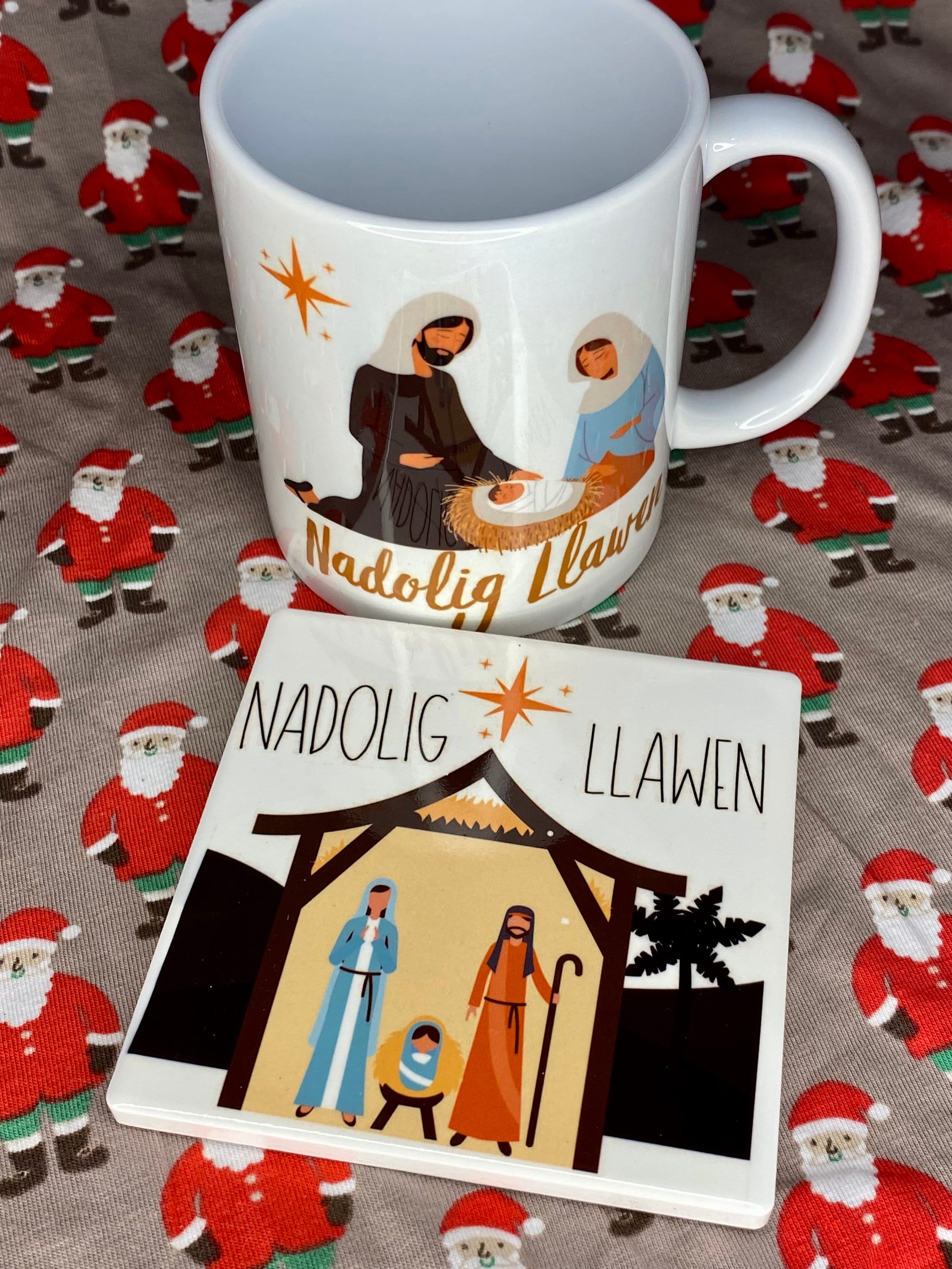 10cm x 10cm ceramic tile coaster with cork backing, with Nadolig Llawen (merry Christmas) design sublimated onto the surface.