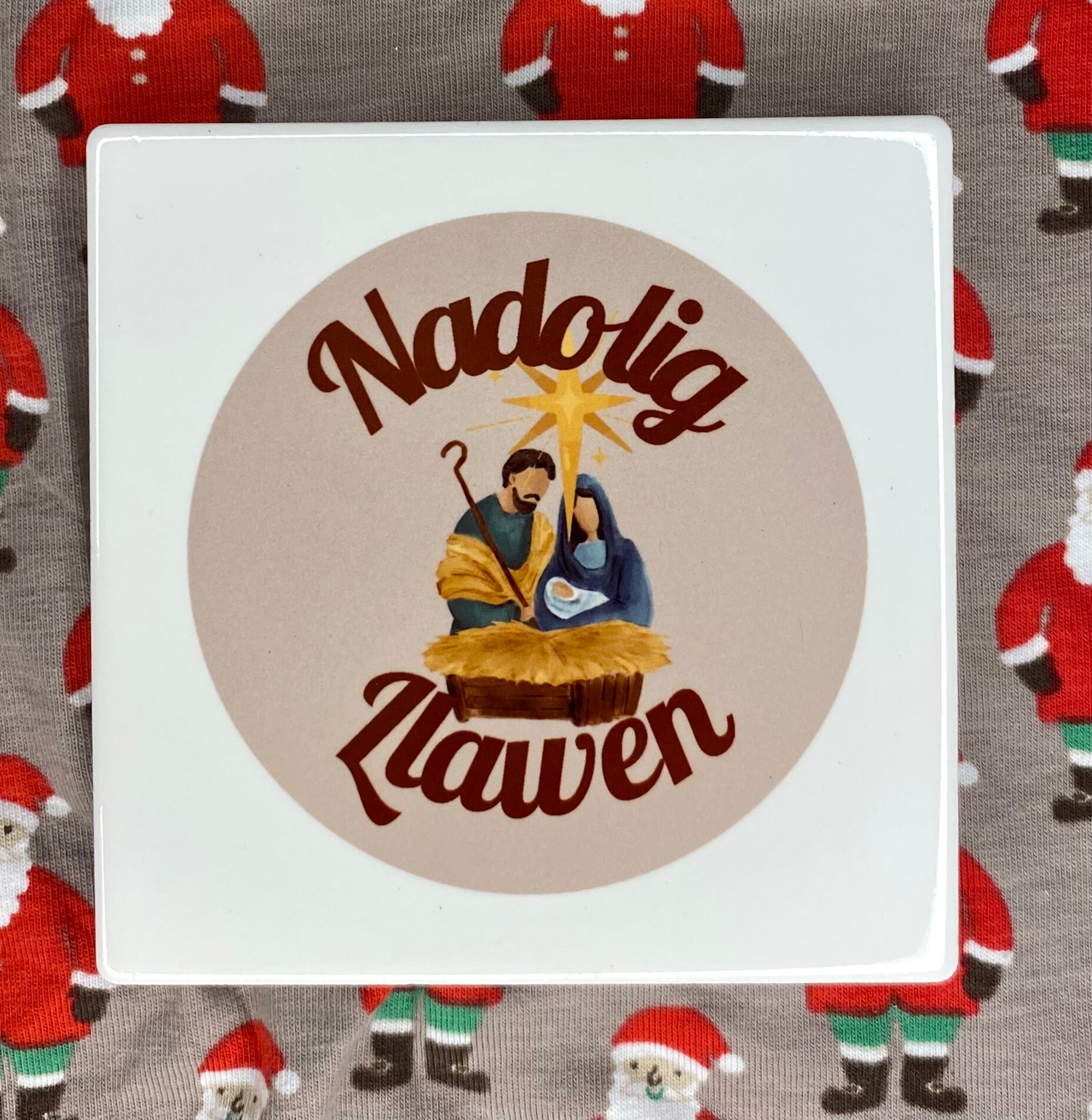 10cm x 10cm ceramic tile coaster with cork backing, with Nadolig Llawen (merry Christmas) design sublimated onto the surface.