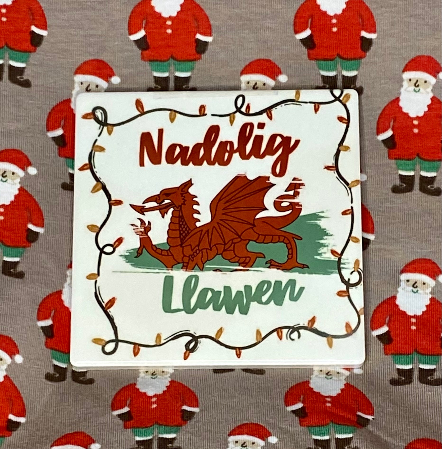 10cm x 10cm ceramic tile coaster with cork backing, with Nadolig Llawen (merry Christmas) design sublimated onto the surface.