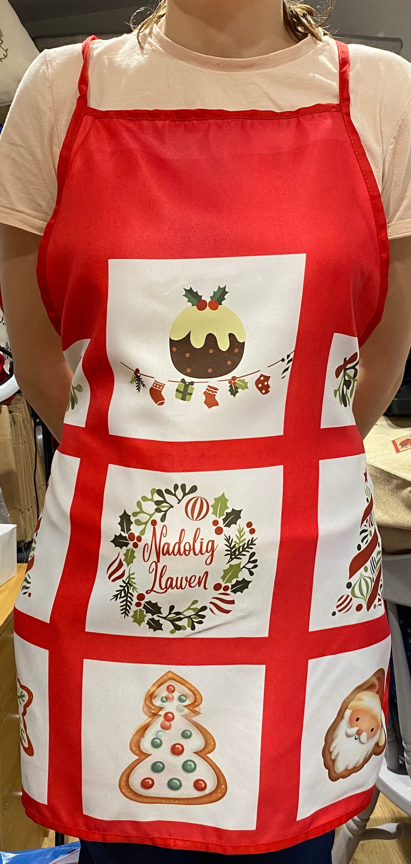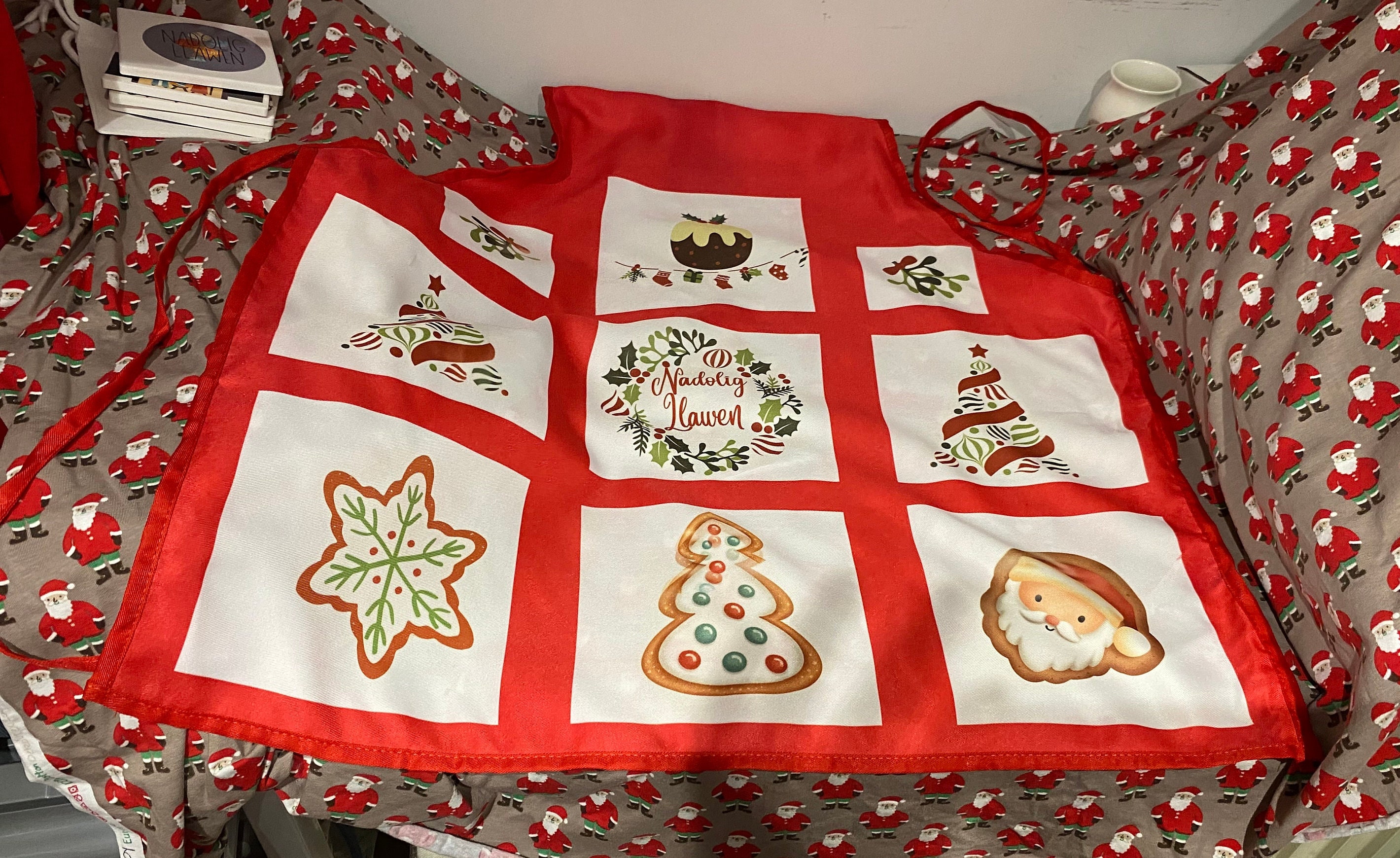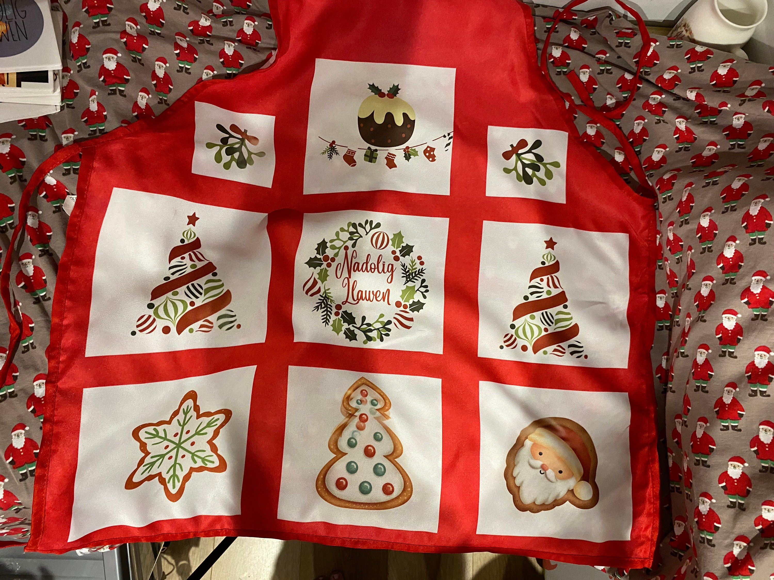 Ffedog efo dyluniadau nadolig / Apron with Christmas designs .