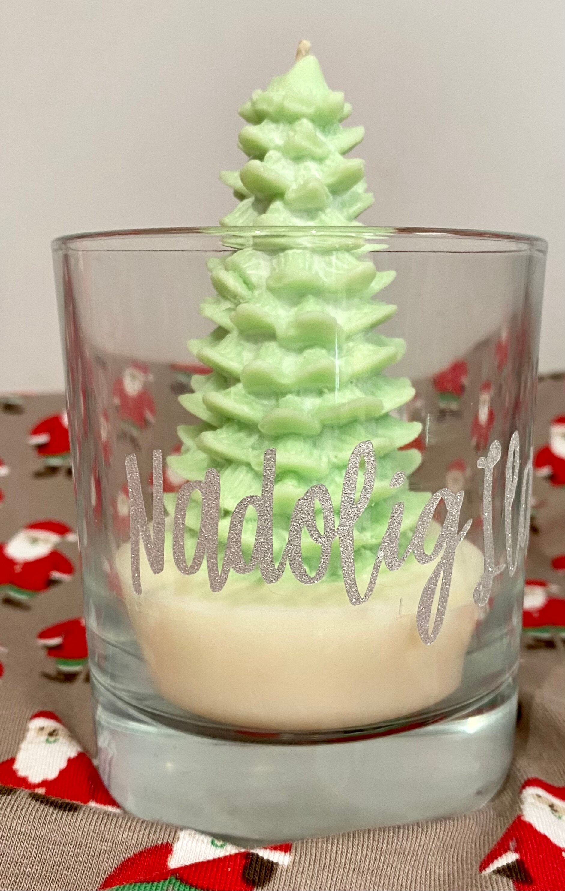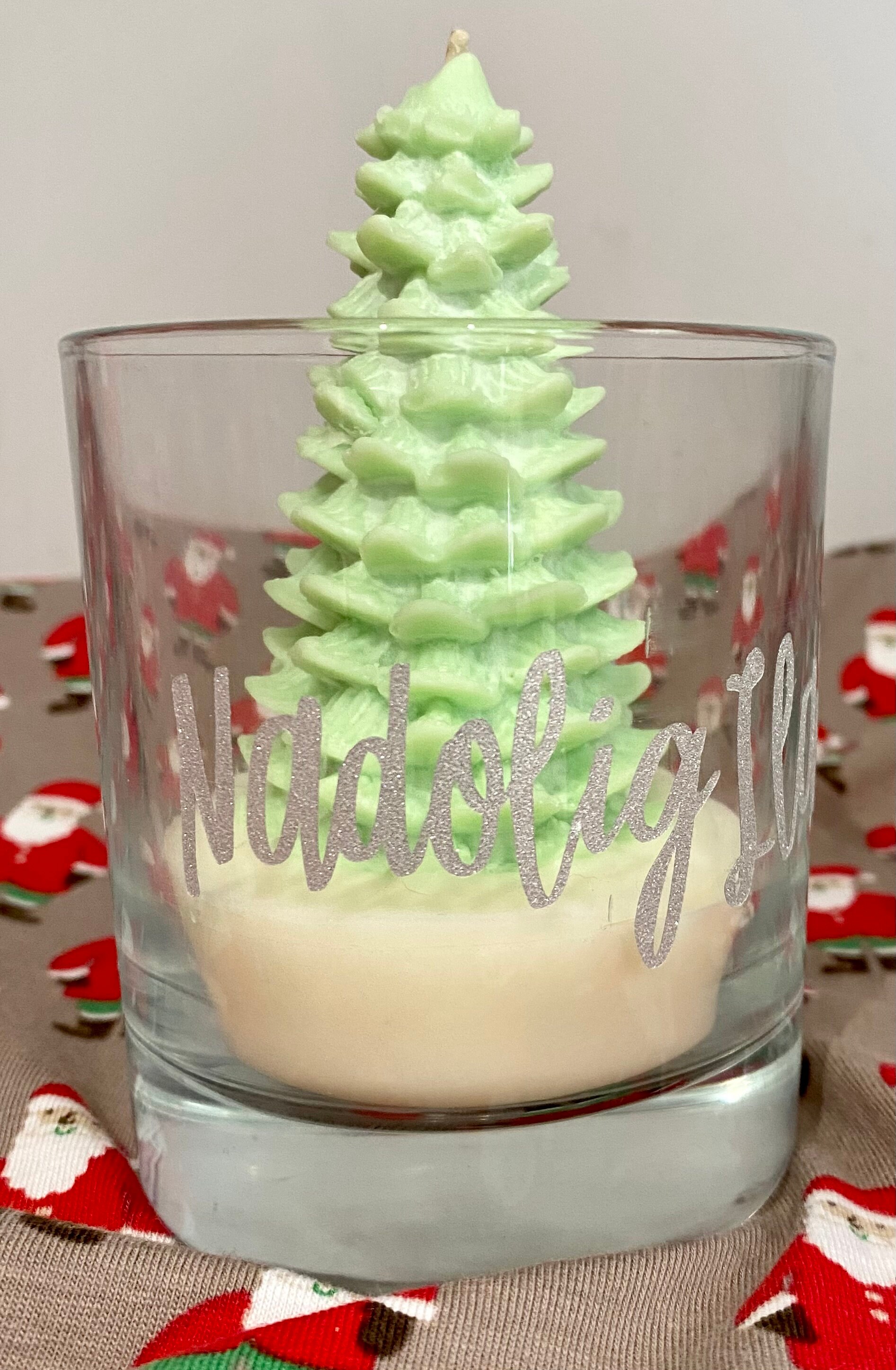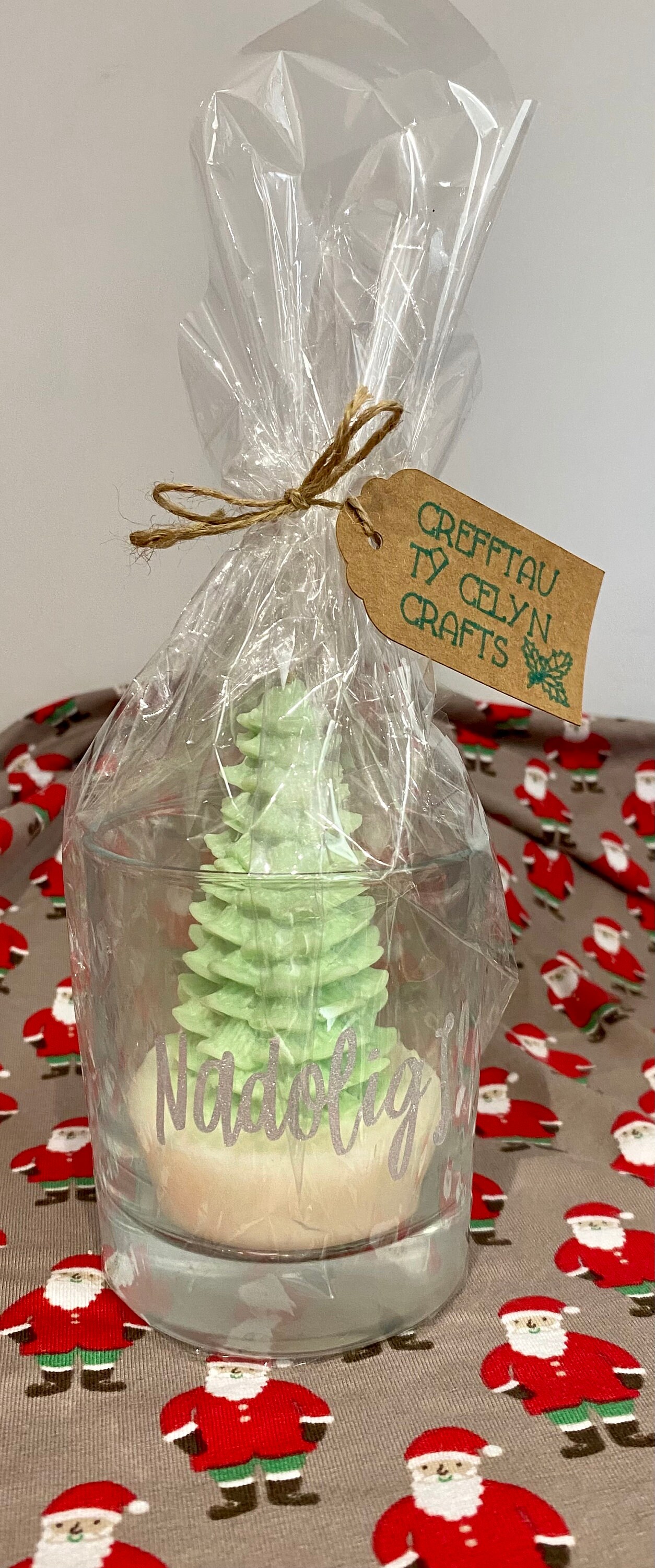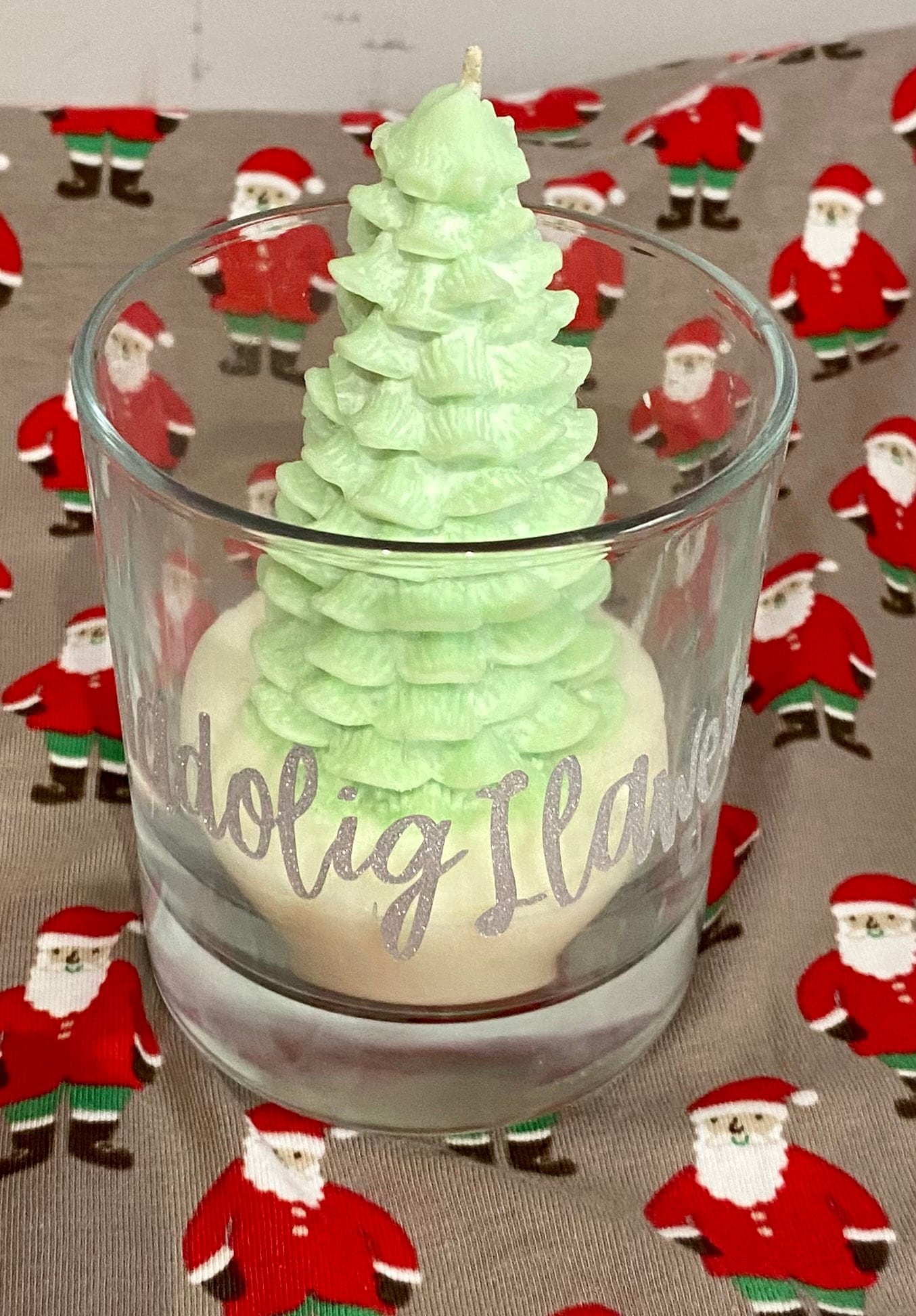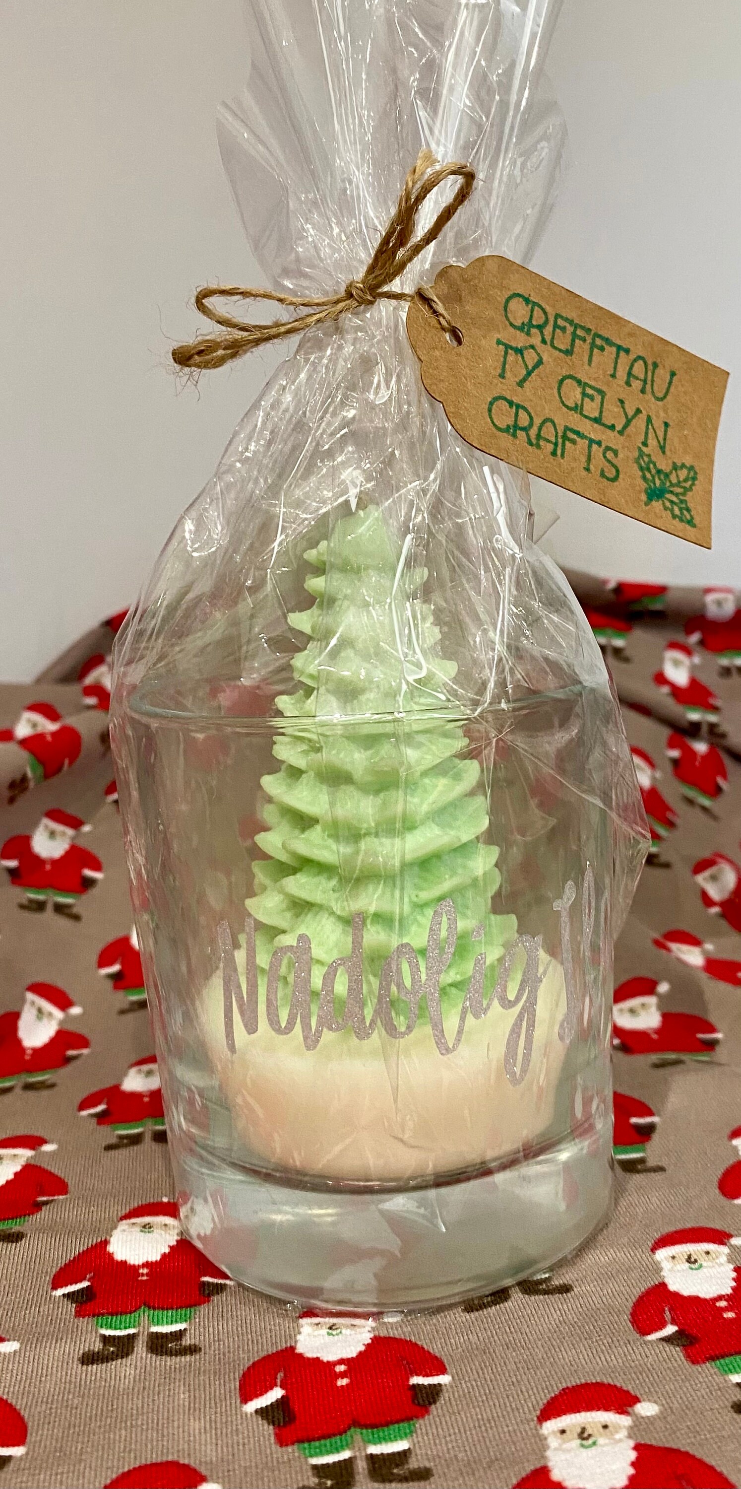 Cannwyll Coeden Nadolig wedi neud a llaw, cwêr naturiol soy ac arogl Nagoligaidd/ Hand poured Christmas tree 100% soy wax &Christmas scent