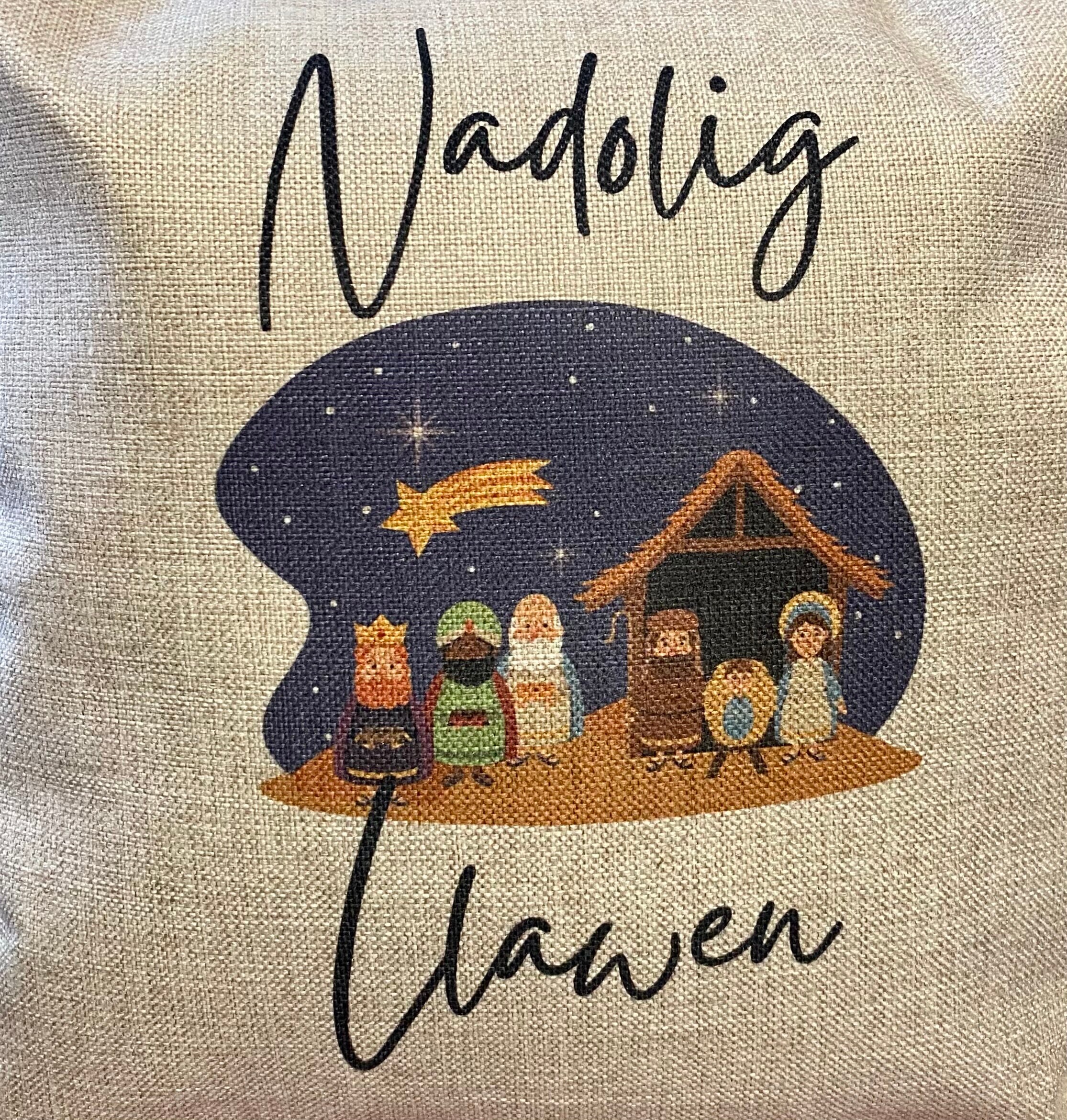 Clustog ‘linen’ efo dyluniad ‘Nadolig - y Geni’ (nativity) wedi syblimeiddio arno.