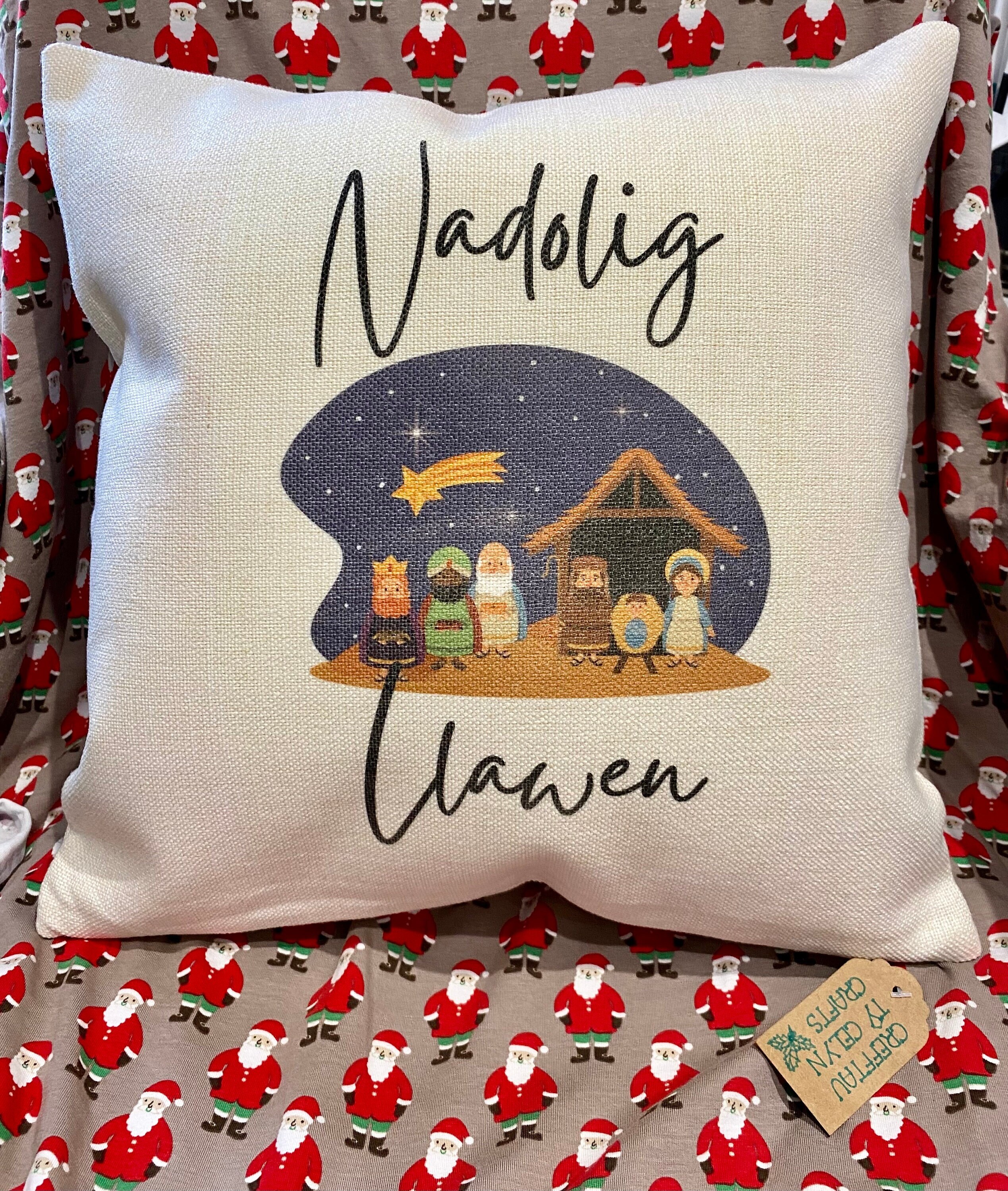Welsh Nadolig Llawen (Merry Christmas) burlap cushion.
