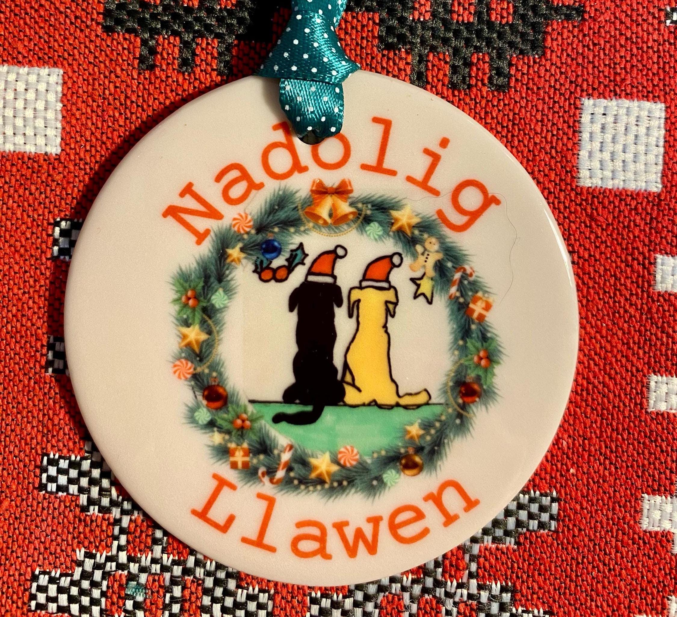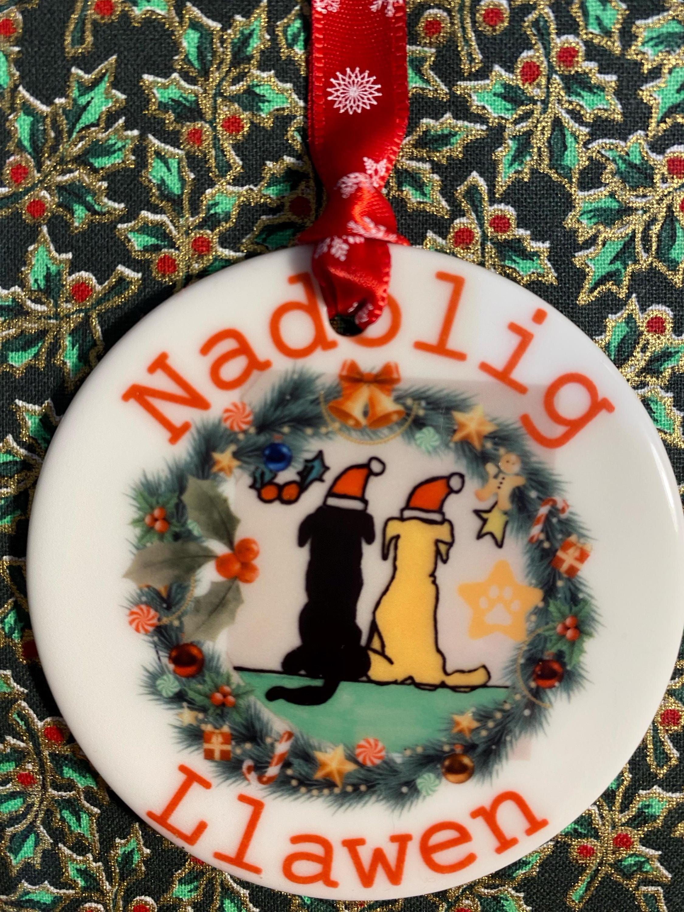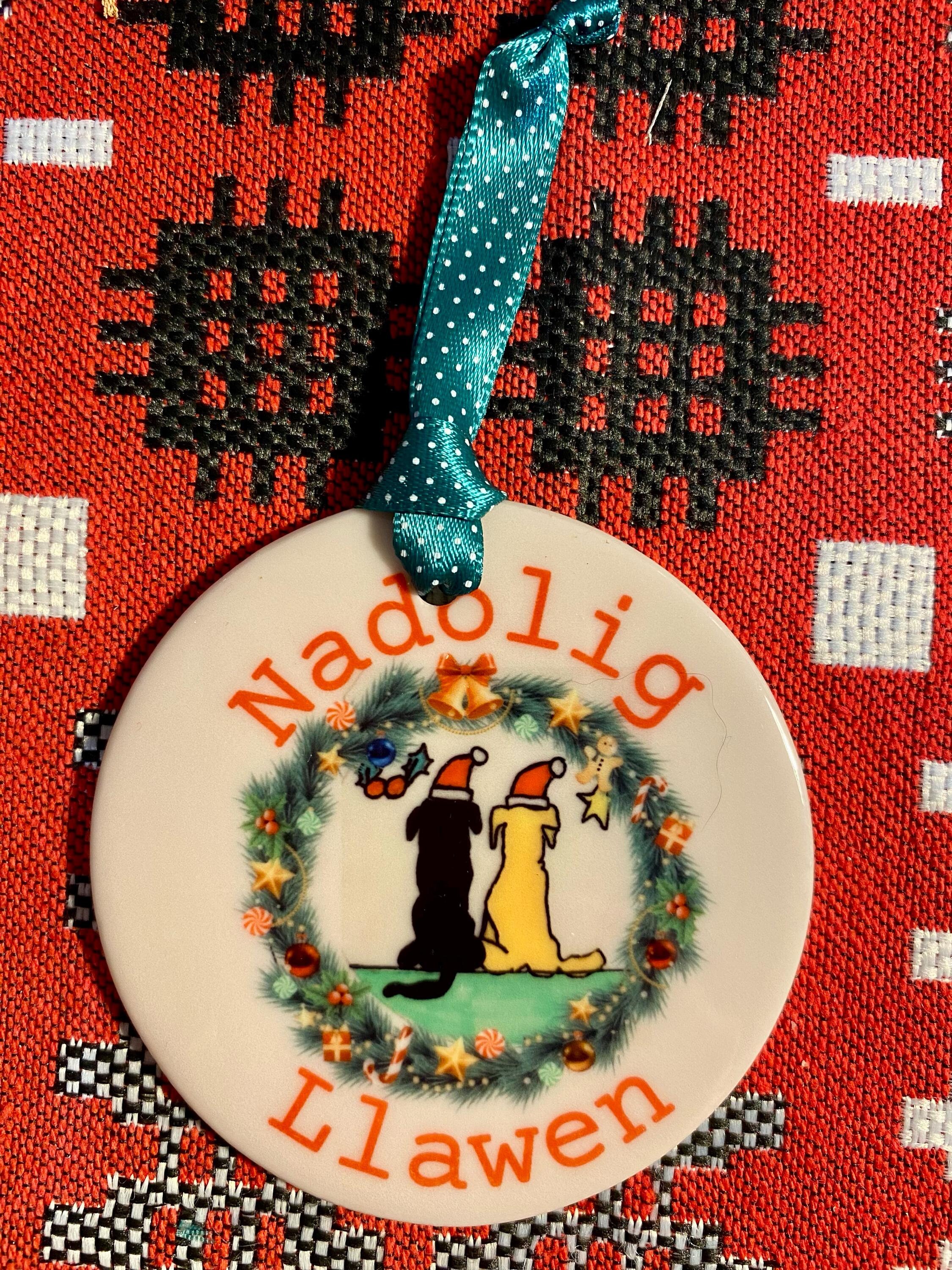 Addurn seramig i’w hongian ar goedenNadolig efo dyluniad ‘Nadolig Llawen’ / ceramic hanging tree decoration.
