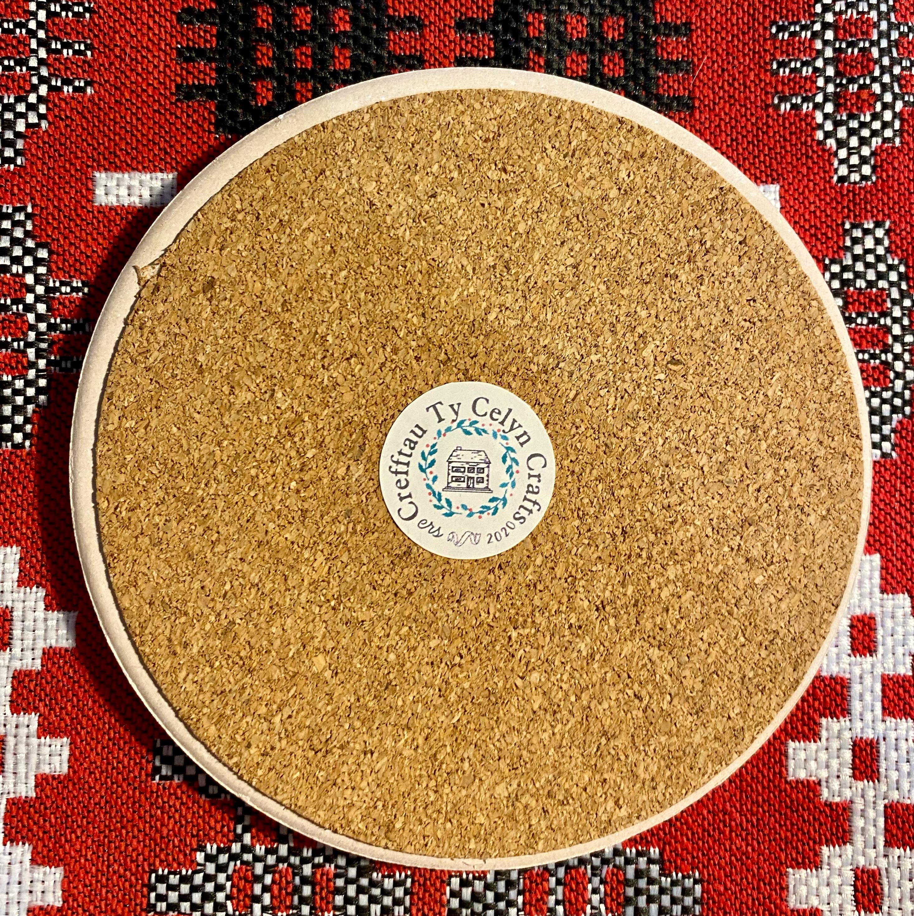 10cm x 10cm ceramic tile coaster with cork backing, with Nadolig Llawen (merry Christmas) design sublimated onto the surface.
