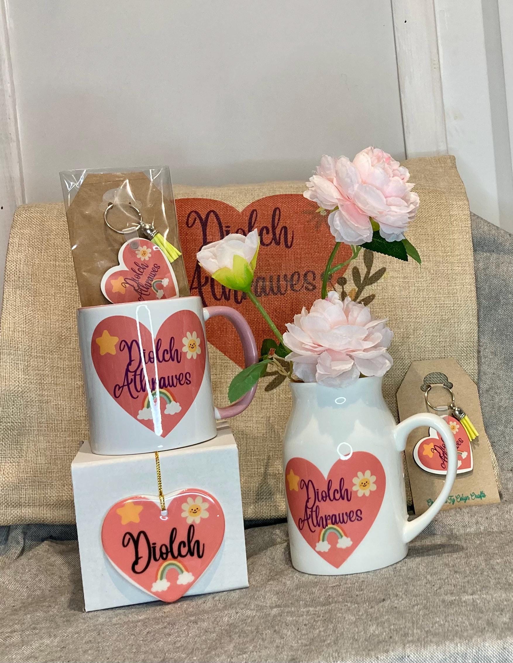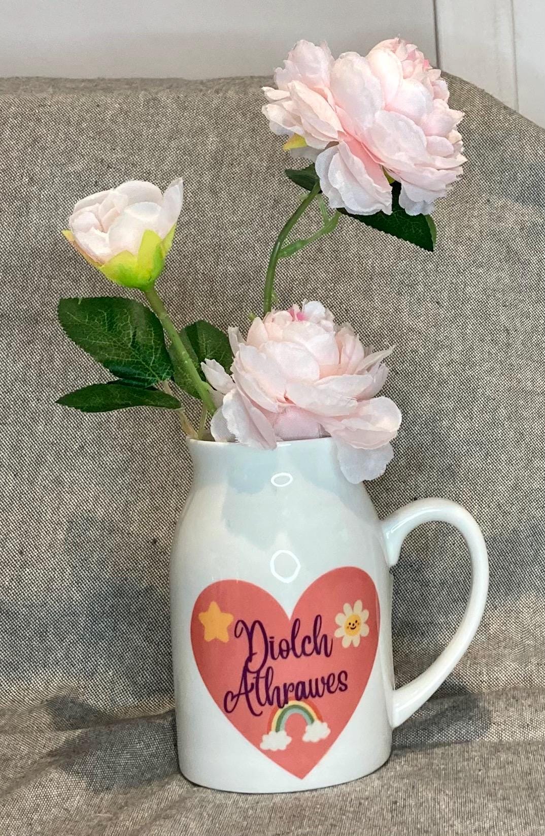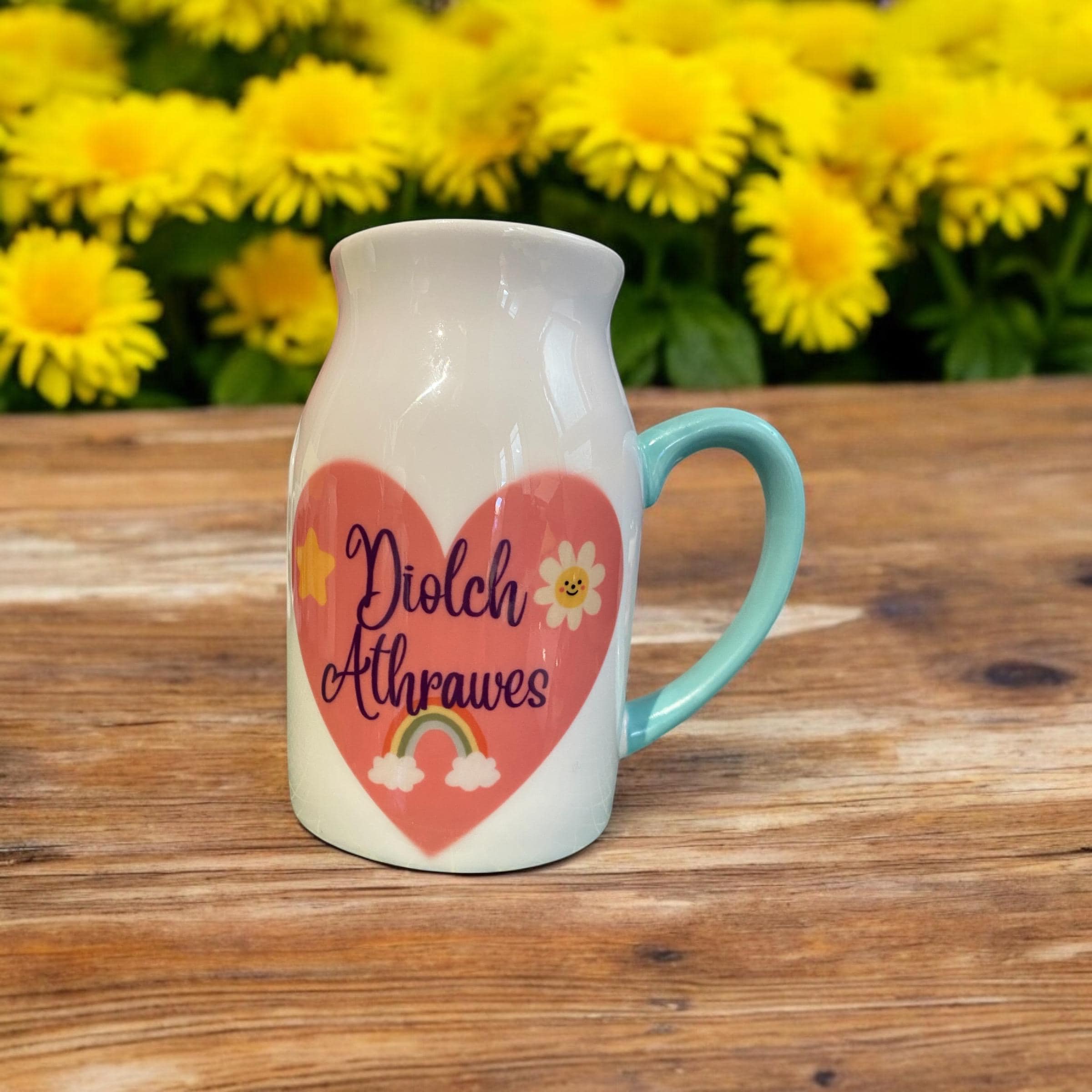 White porcelain jug with the Welsh words ‘Diolch athrawes’ (thank you teacher ) in a heart shape design sublimated onto it.