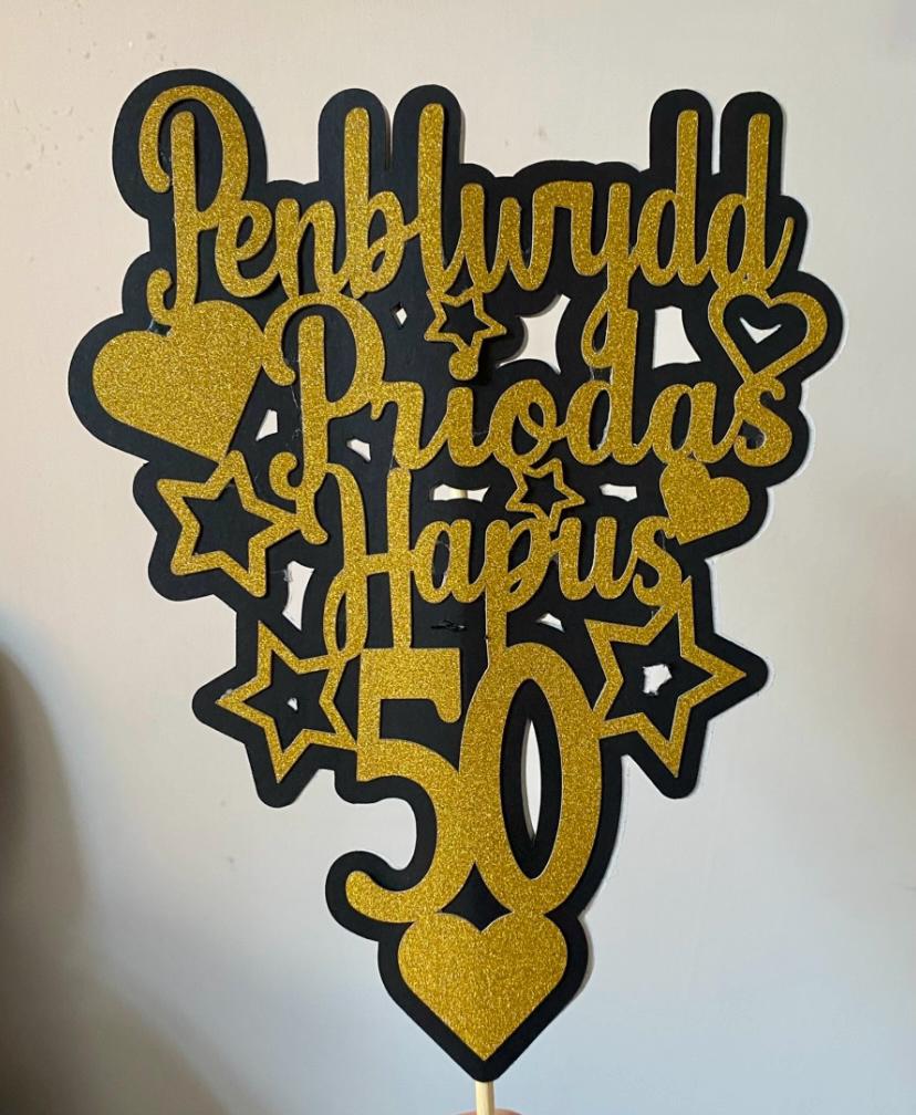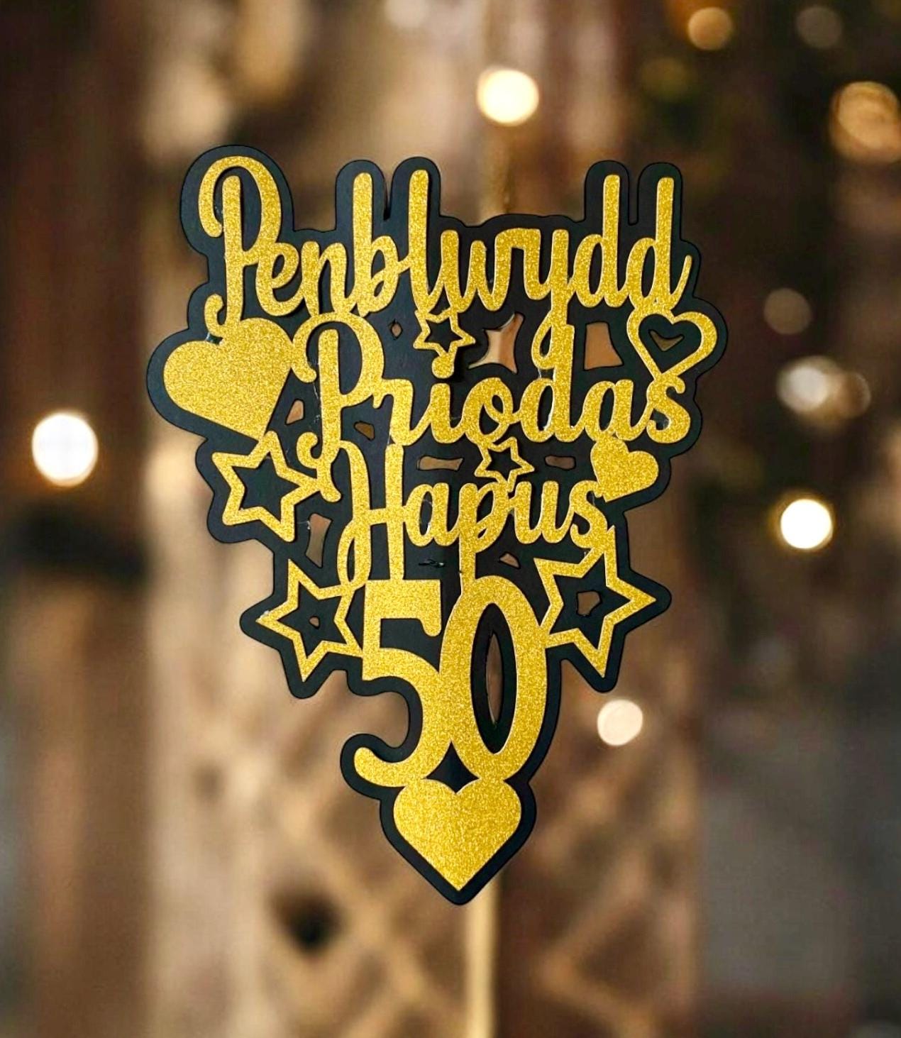 Topper’ cacen PENBLWYDD PRIODAS HAPUS / Wedding Anniversary Cake topper /Priodas Aur 50 /Arian 25