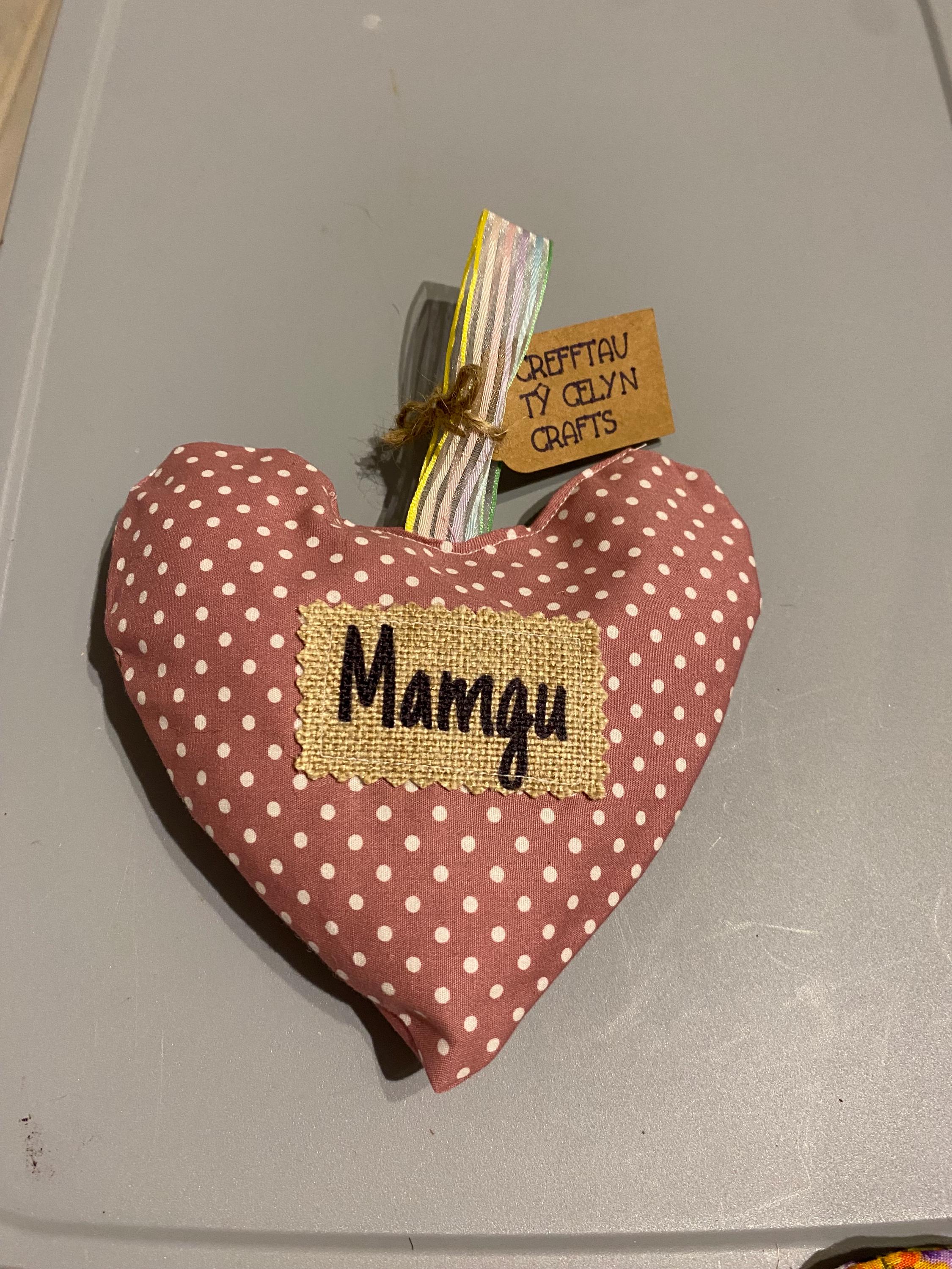 Fabric hanging heart with the name ‘Mamgu’ . The heart is filled with synthetic filling and is scented with fresh Lavender inside.