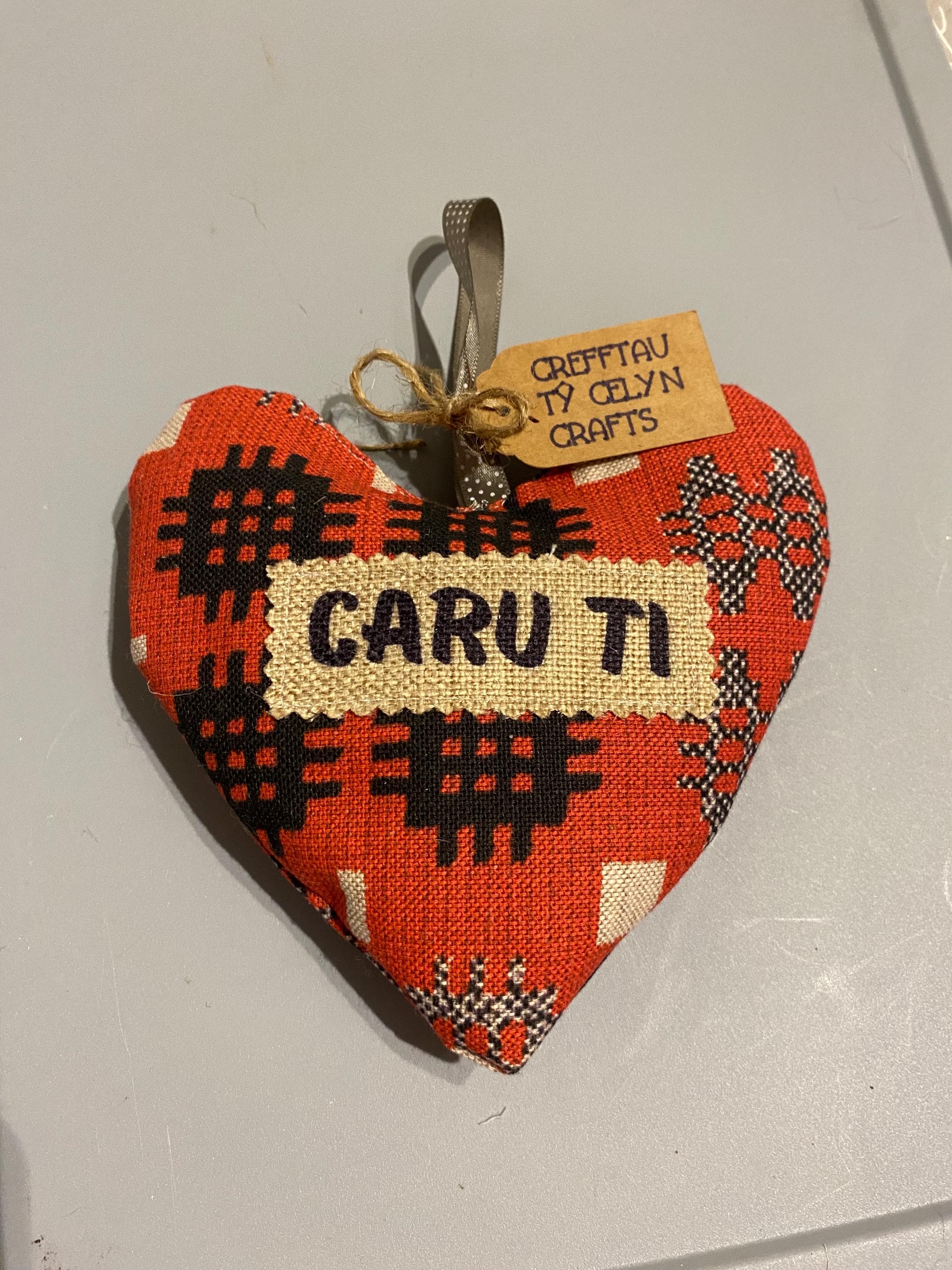 Calon ffabrig brethyn Cymreig i’w hongian efo’r geiriau‘Caru Ti ’ a arogl lafant ffres