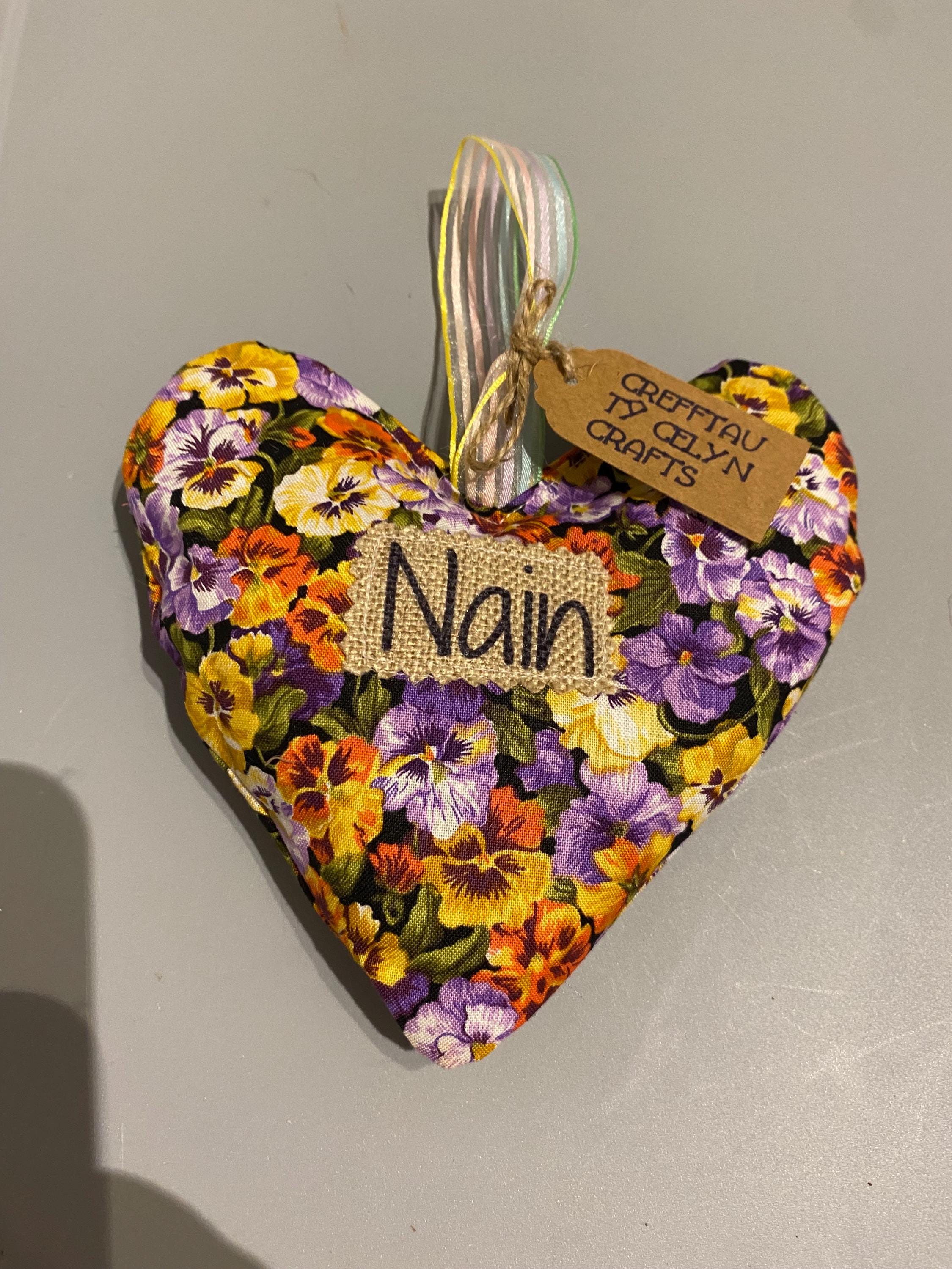 Fabric hanging heart with the word ‘Nain’ . The heart is filled with synthetic filling and is scented with fresh Lavender inside.