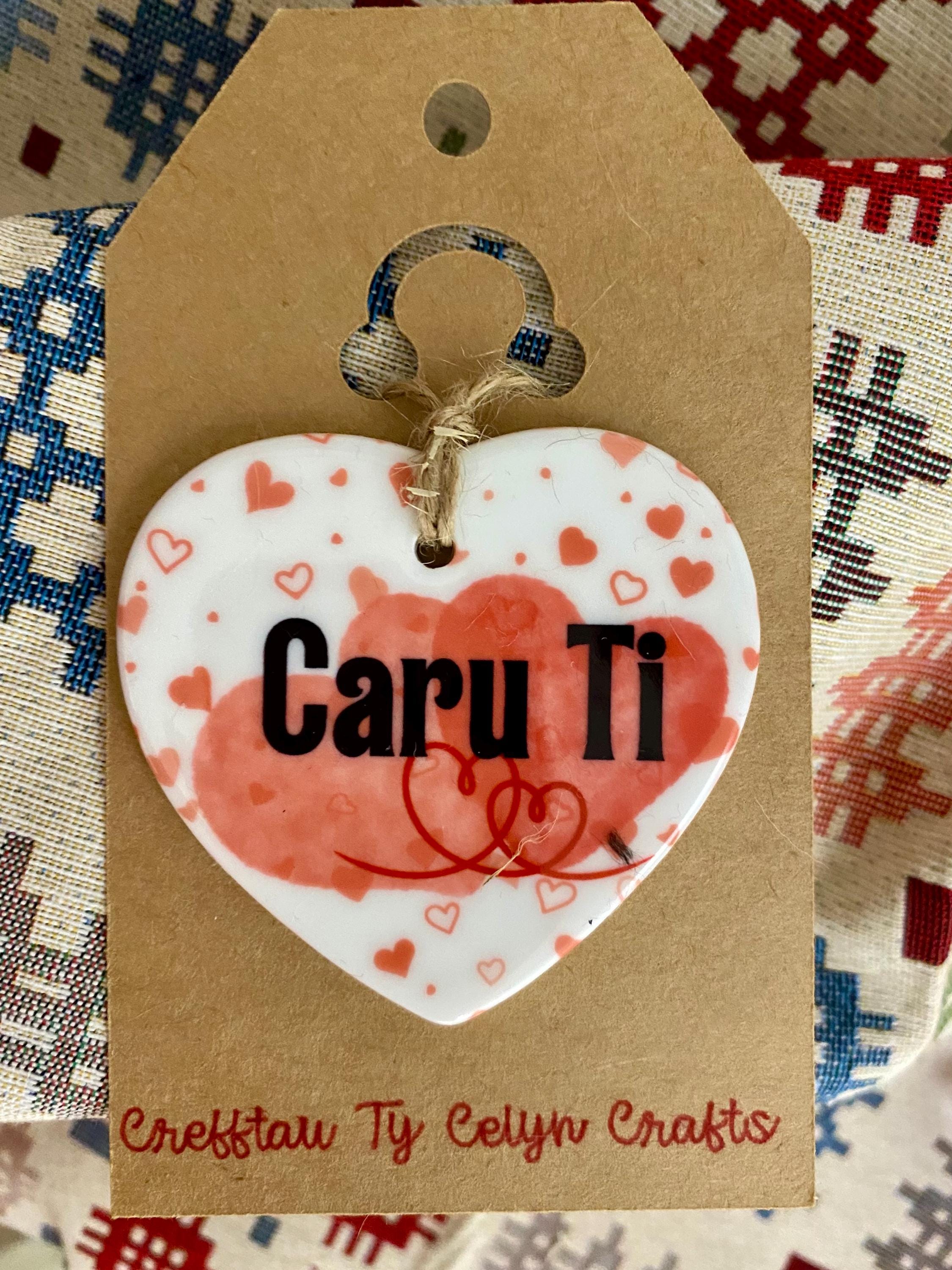 Addurn calon seramig i’w hongian ar efo dyluniad ‘Caru Ti’ ceramic hanging heart with the Welsh words ‘Caru Ti’(Love you).
