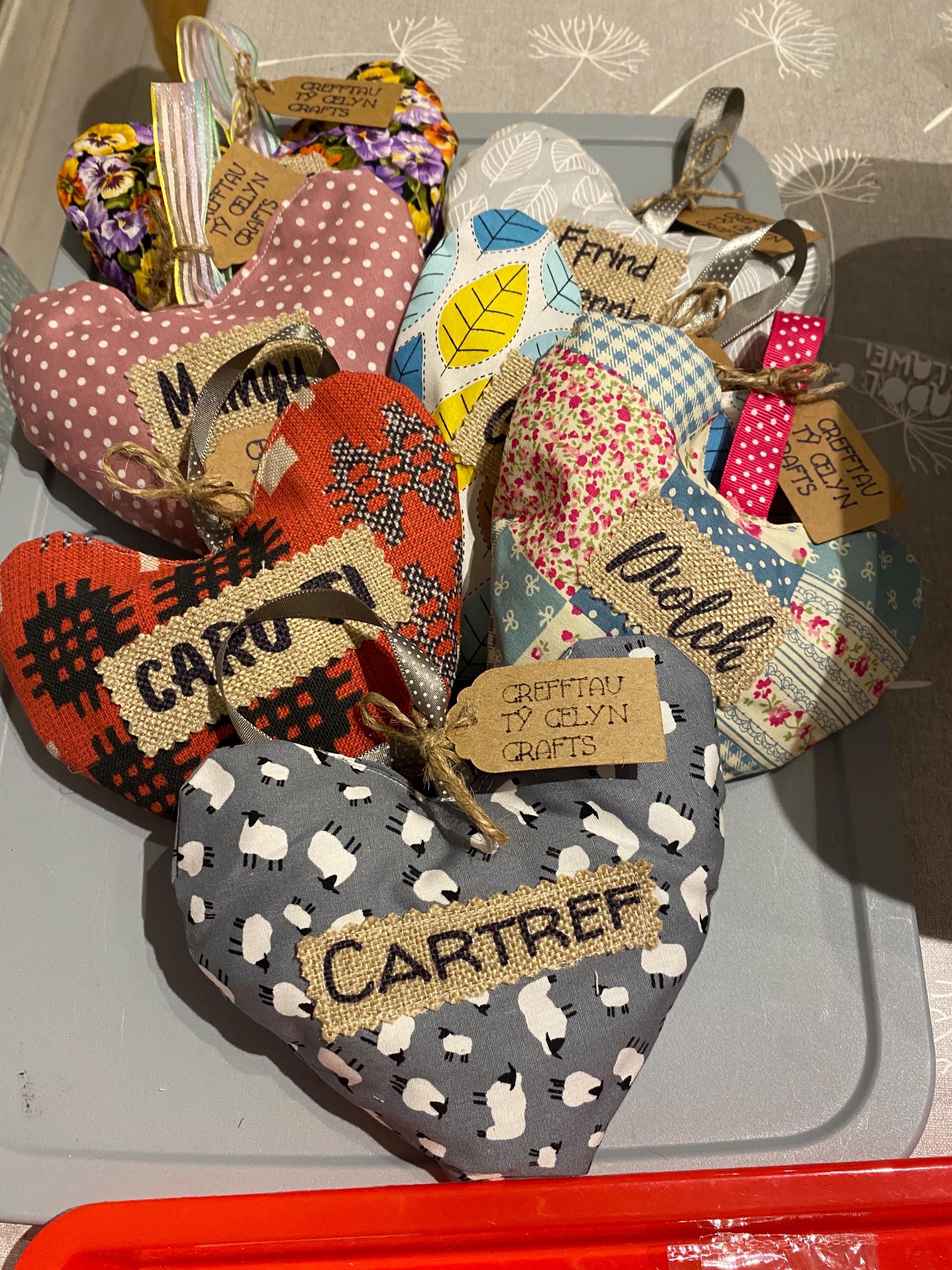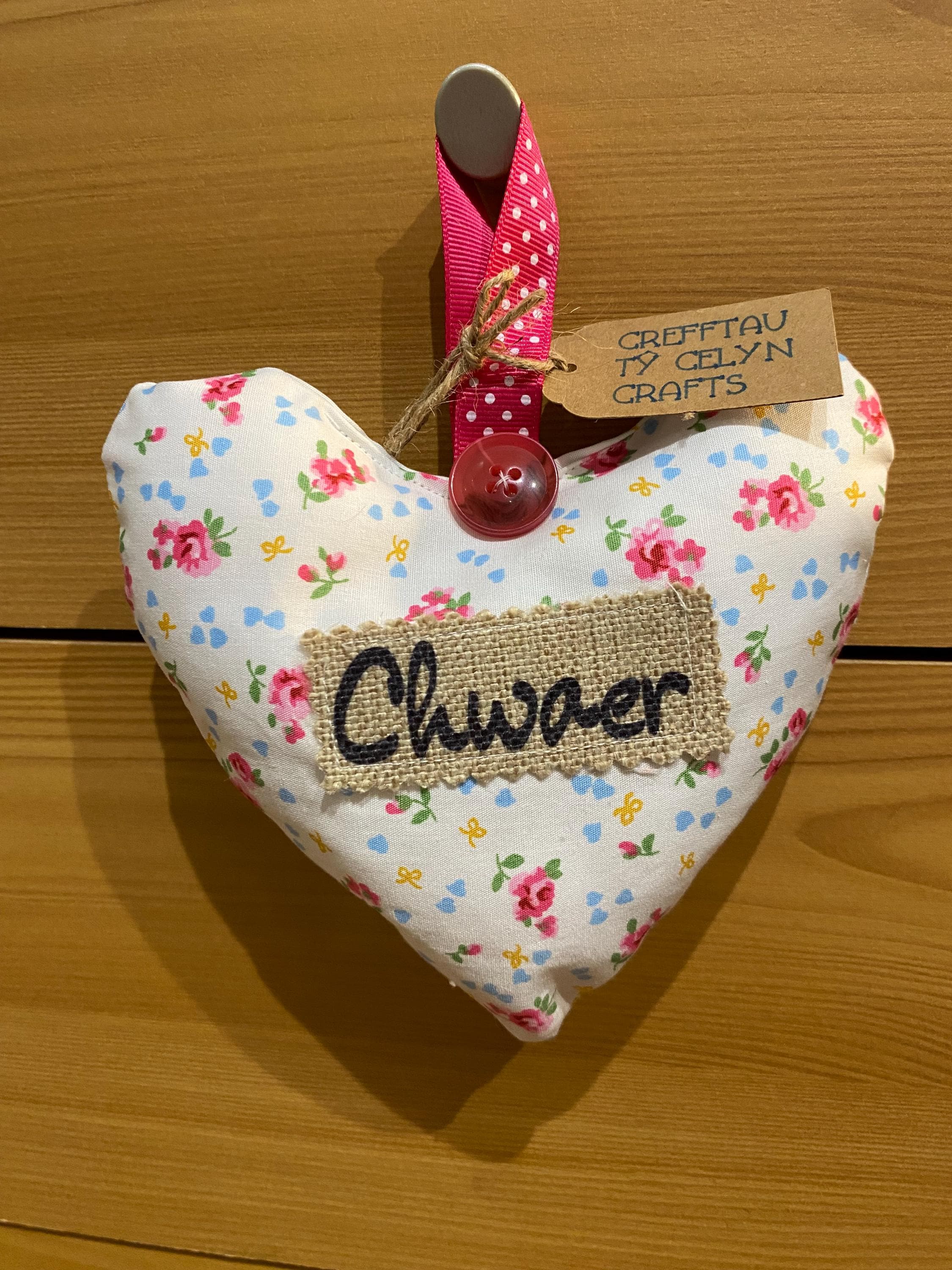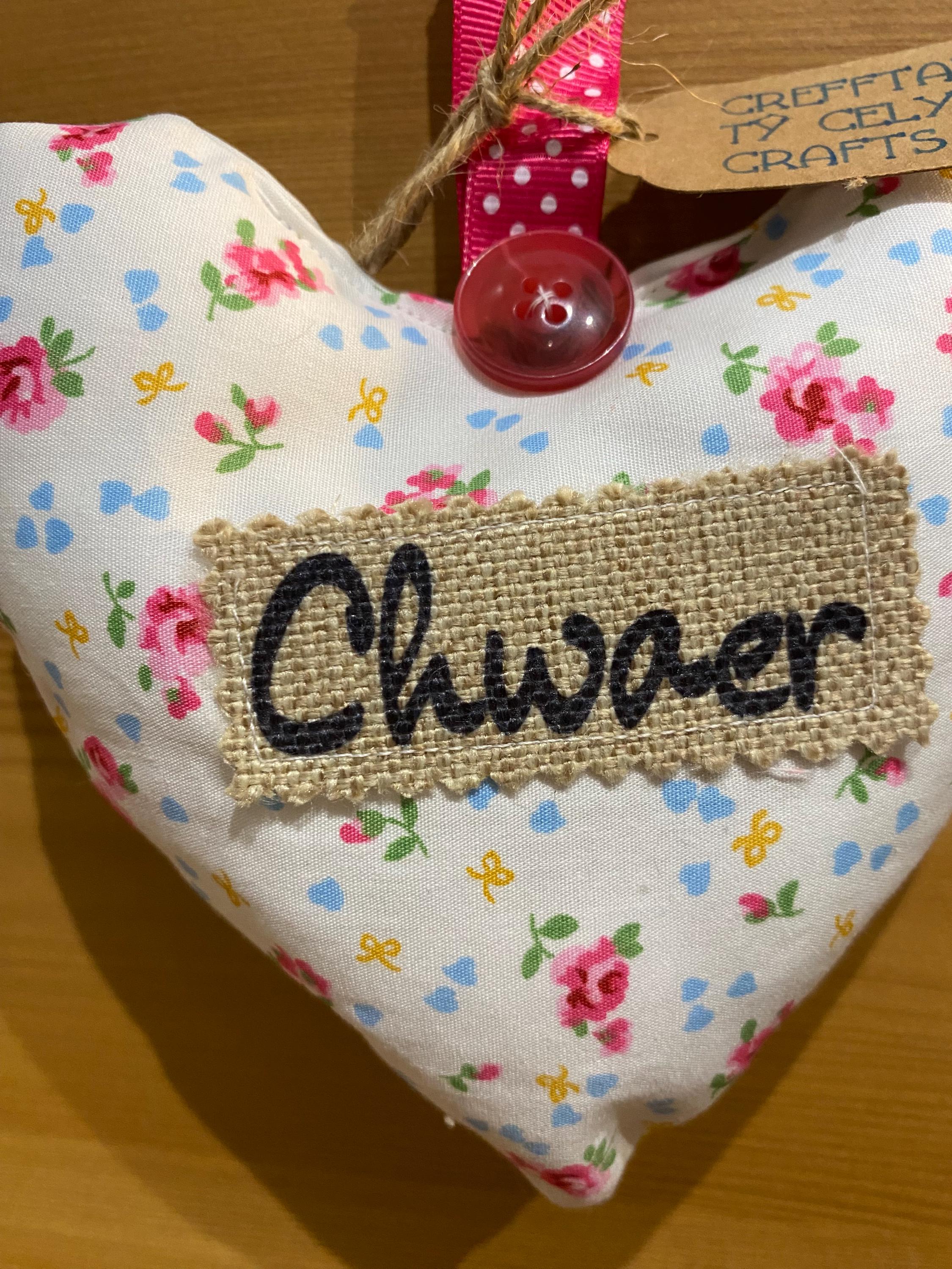 Fabric hanging heart with the word ‘CHWAER’ (Sister). The heart is filled with synthetic filling and is scented with fresh Lavender inside.