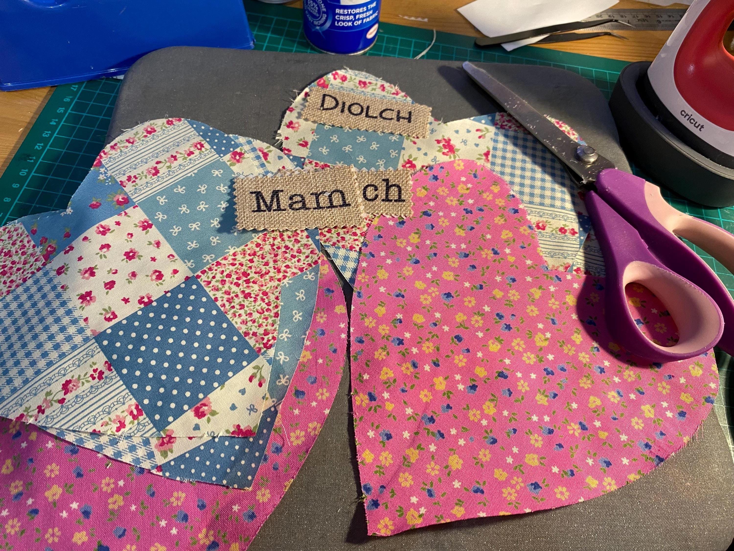 Calon ffabrig efo’r gair ‘CHWAER ’ wedi gwnio arno. Wedi ei lenwi a stwffin synthetig a lafant ffres ynddo./