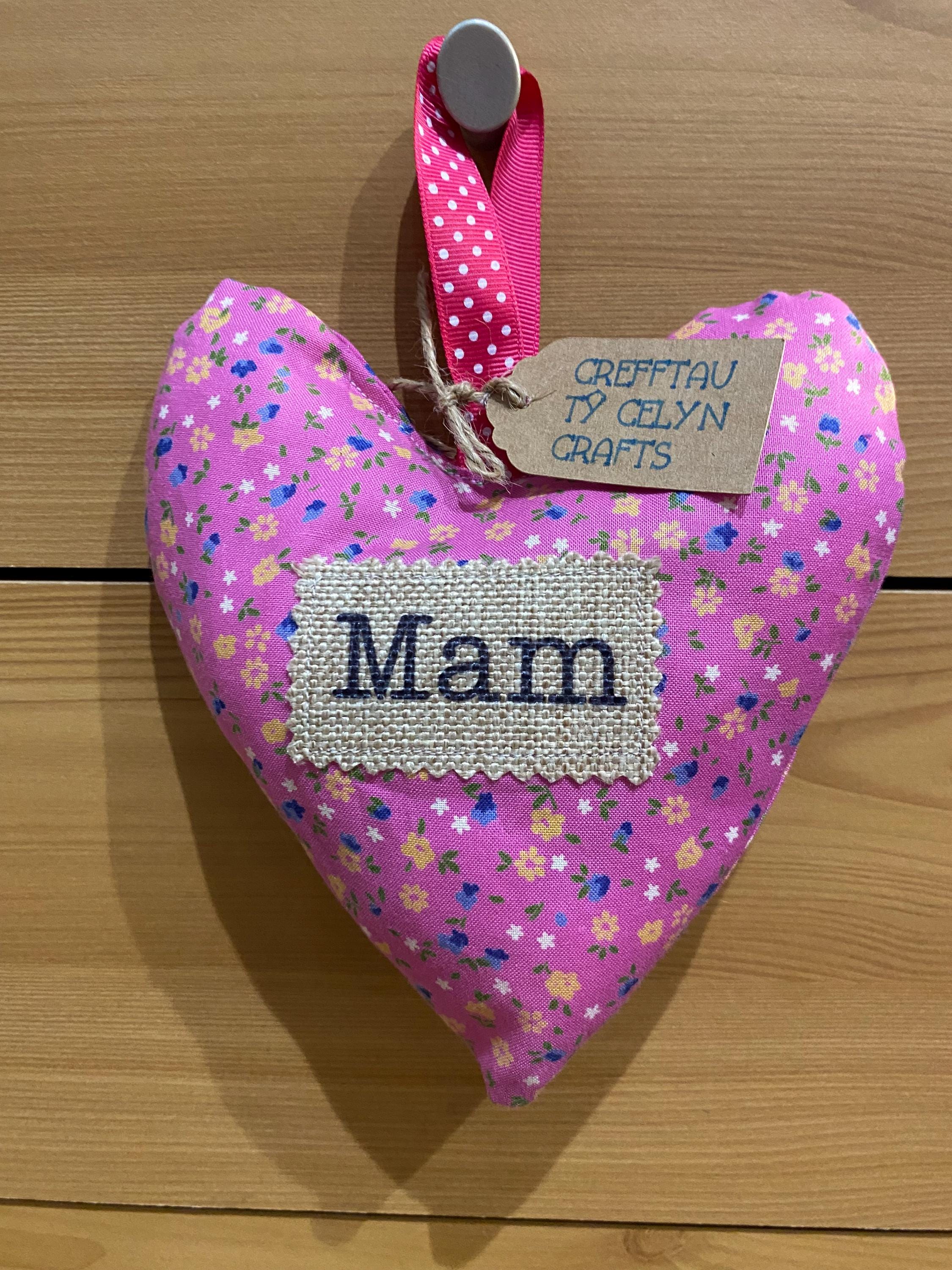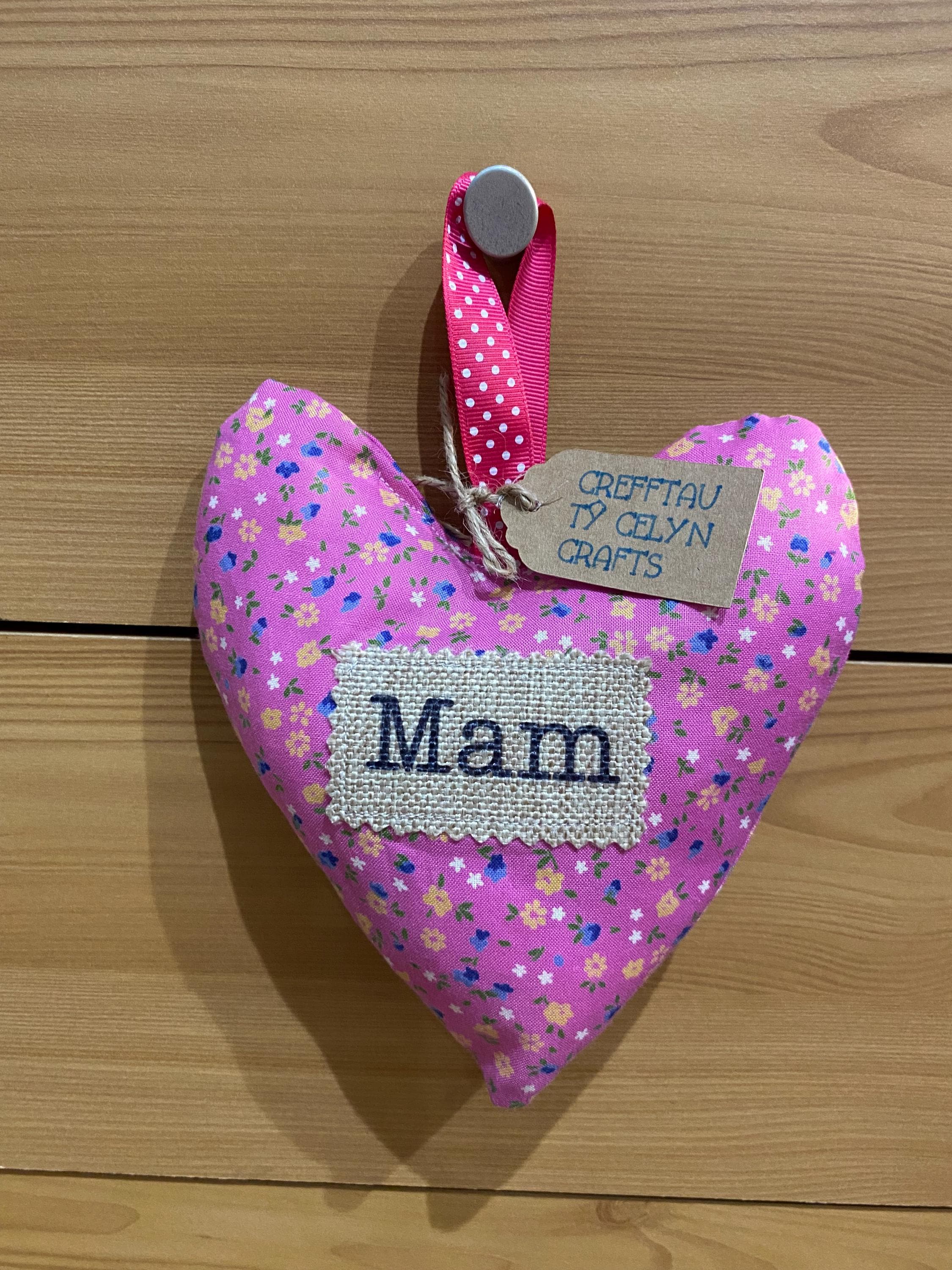 Fabric hanging heart with the word ‘MAM’ . The heart is filled with synthetic filling and is scented with fresh Lavender inside.