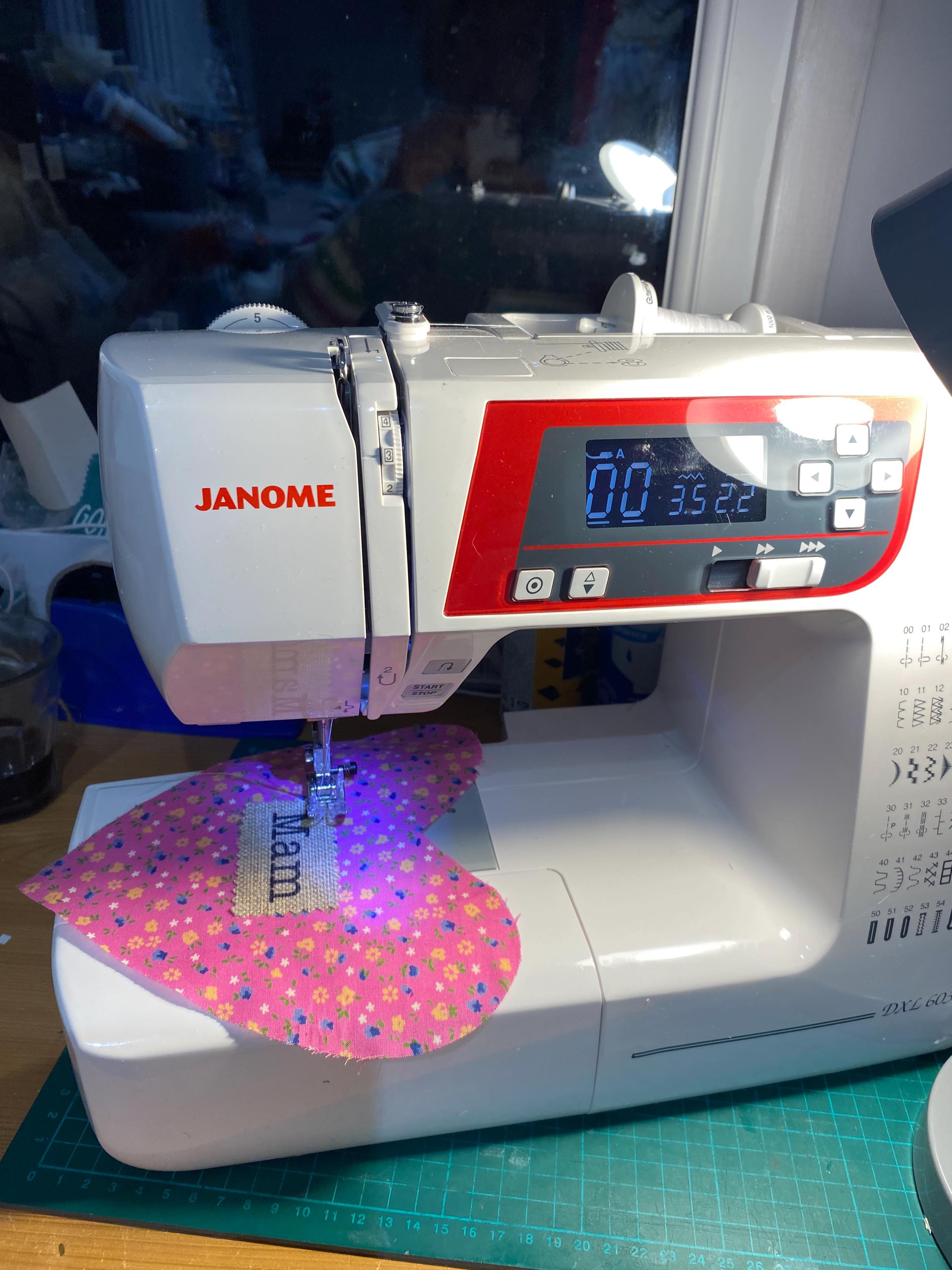Calon ffabrig efo’r gair ‘MAM ’ wedi gwnio arno. Wedi ei lenwi a stwffin synthetig a lafant ffres ynddo./