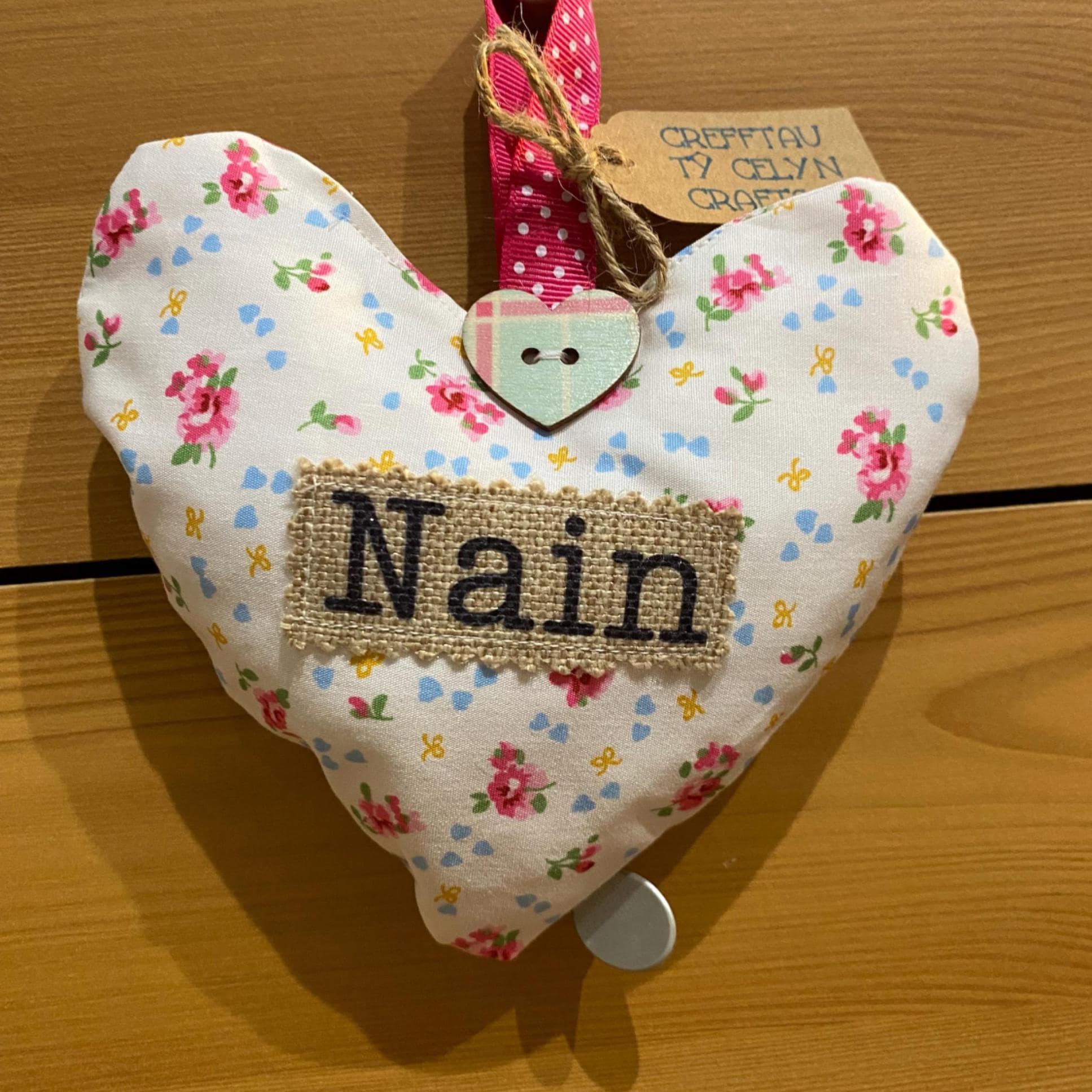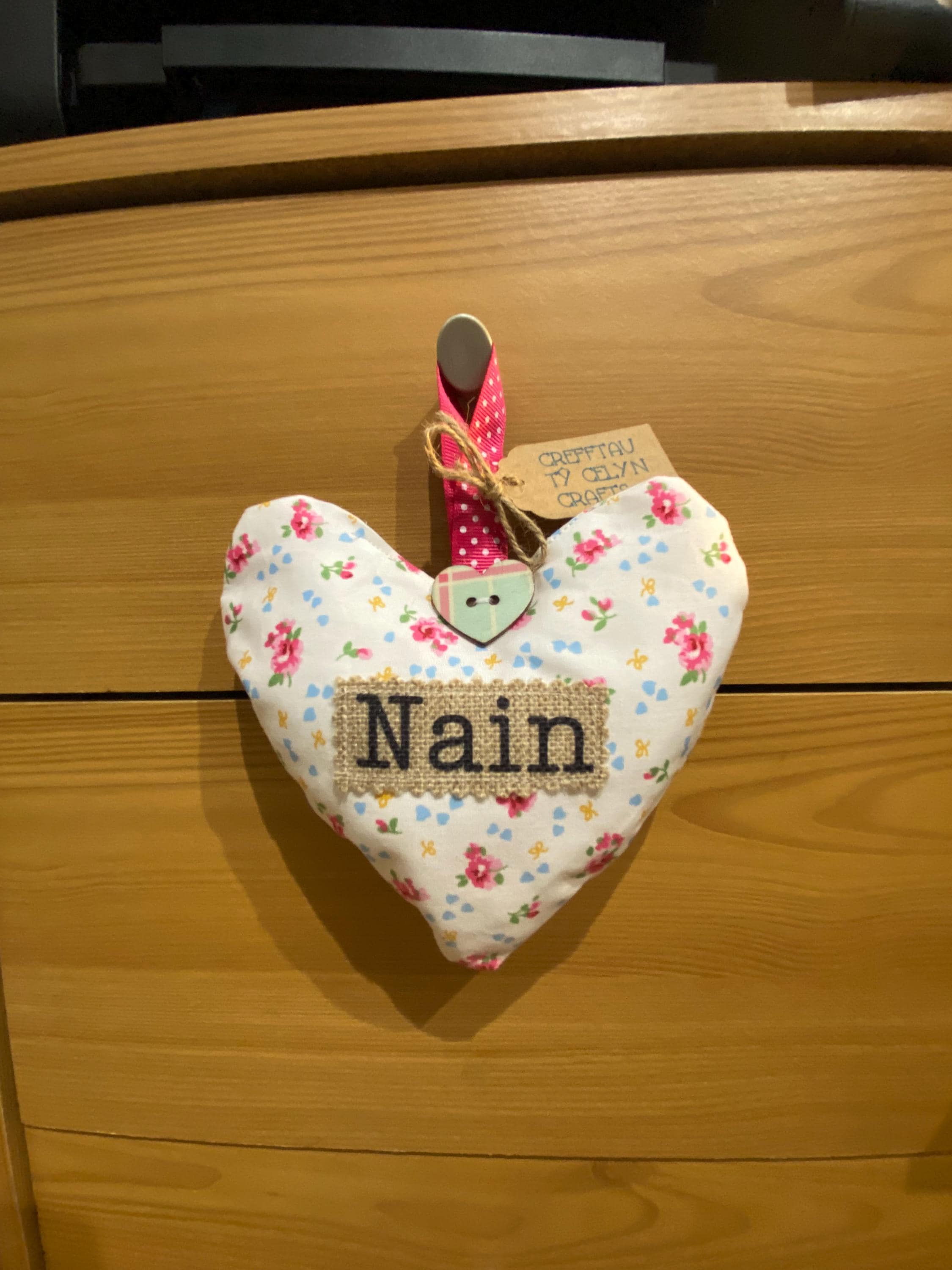 Calon ffabrg i’w hongian efo’r gair ‘NAIN’ a arogl lafant ffres