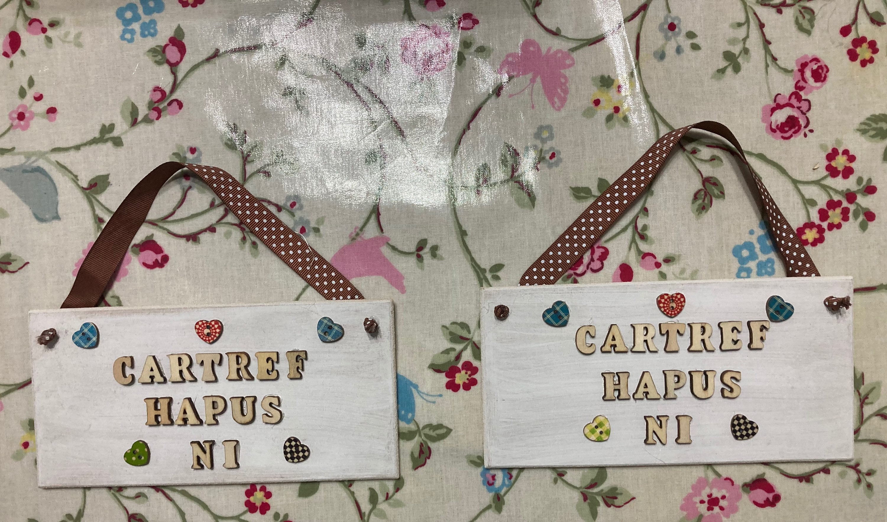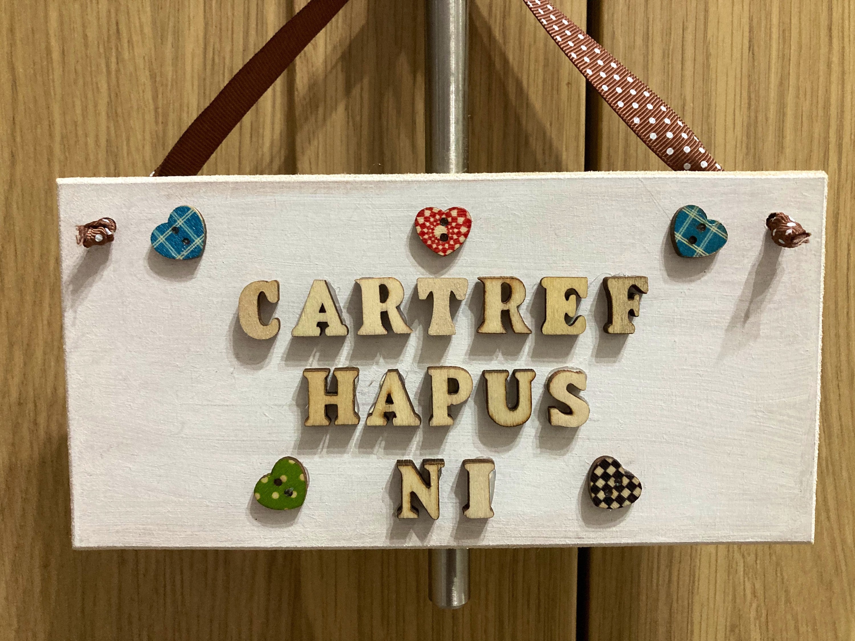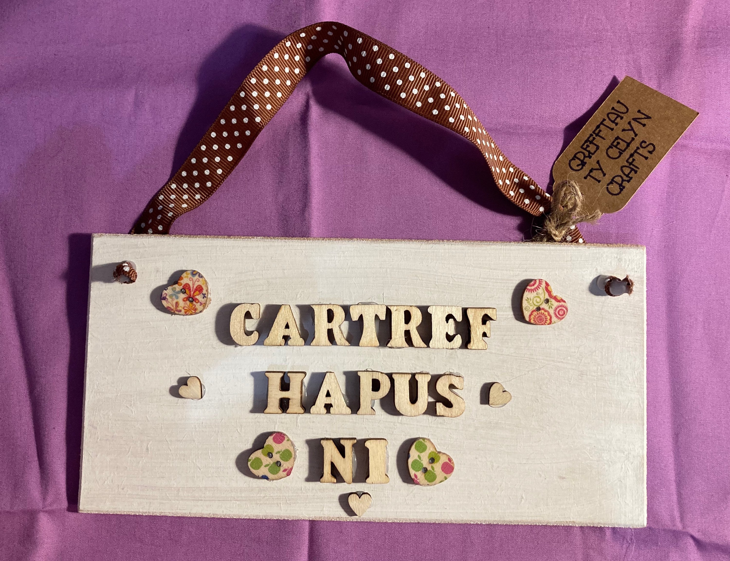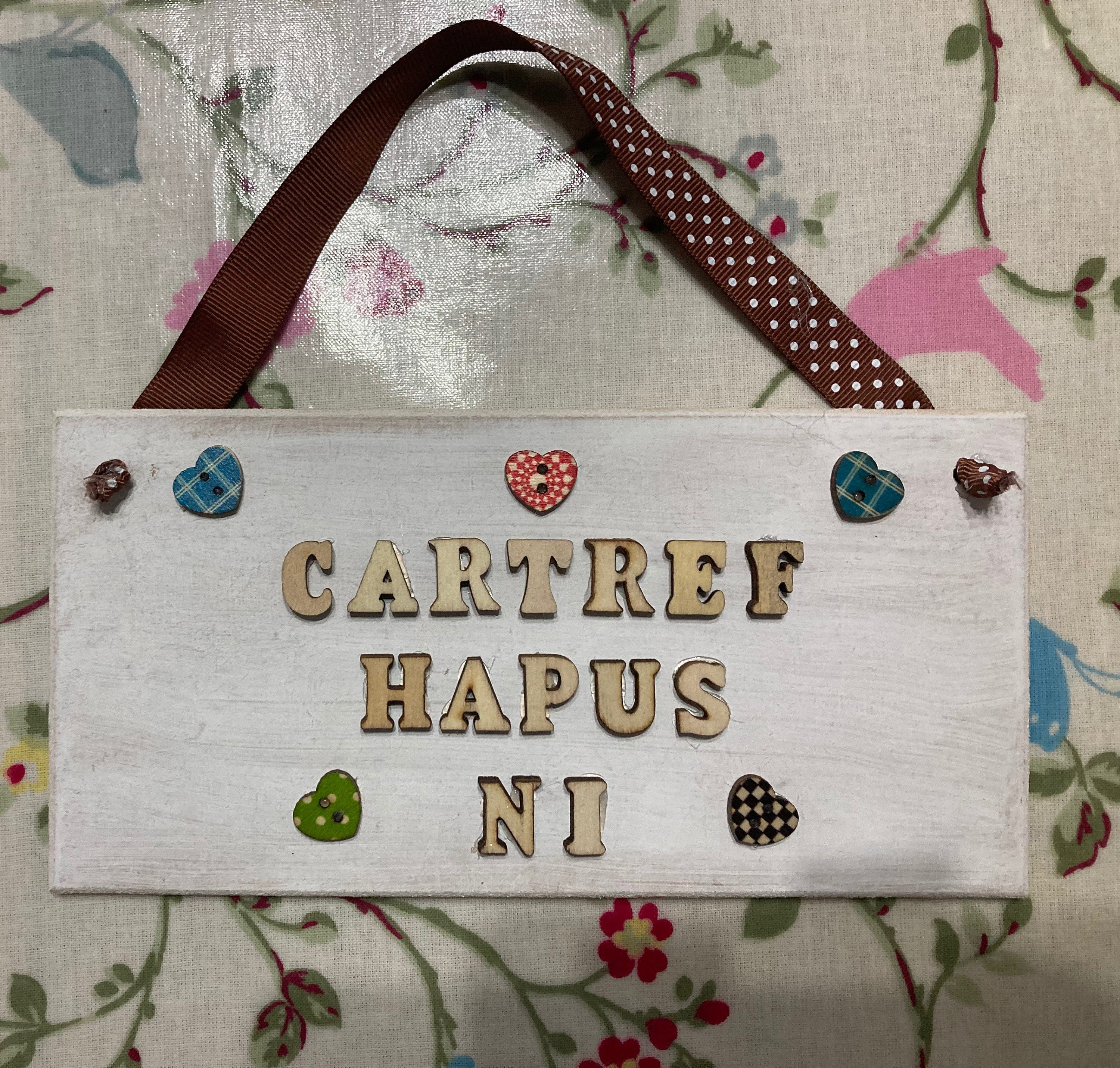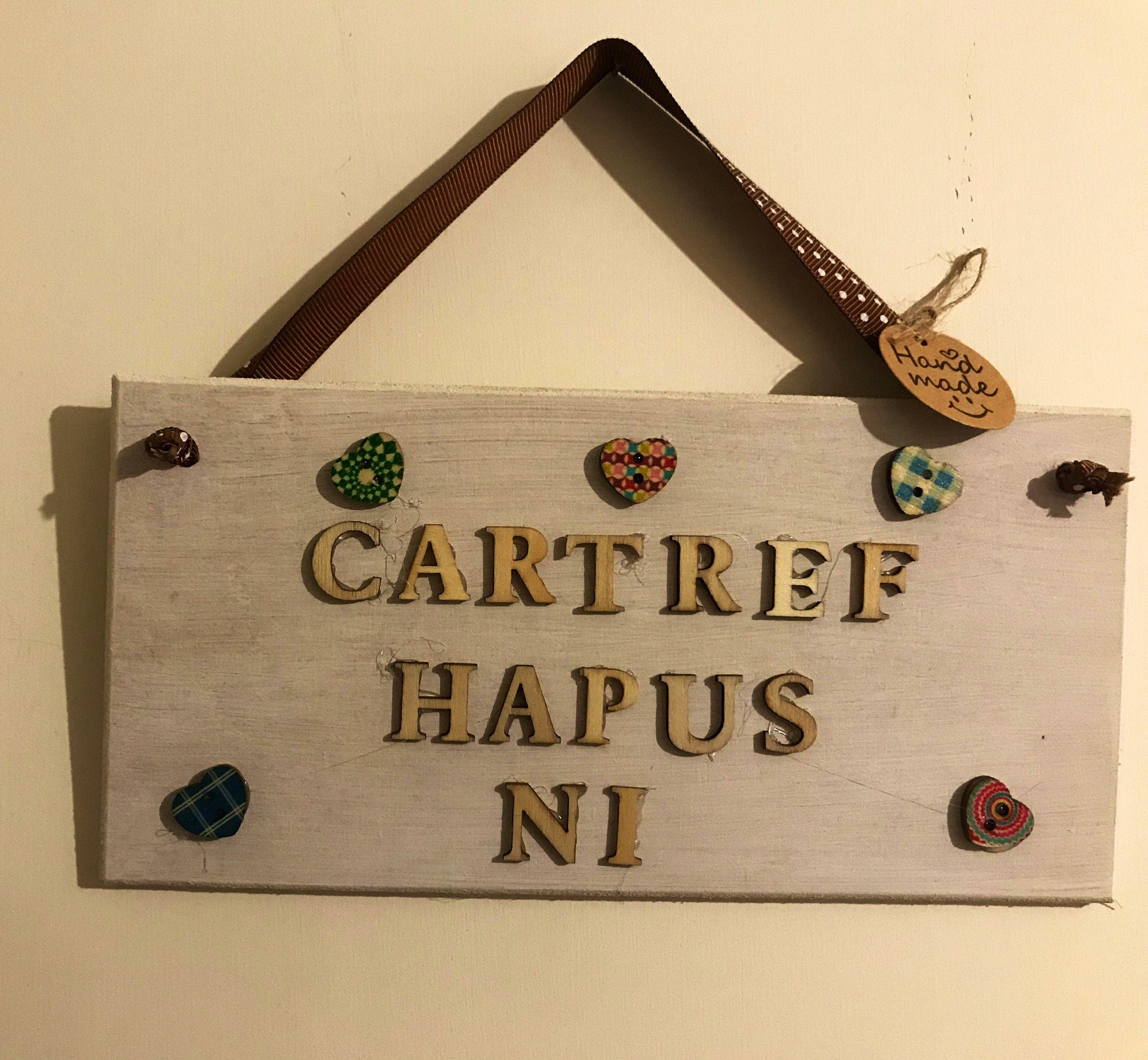 Plaque with “Cartref Hapus Ni” ,Welsh for “Our happy home”...we personalise plaques in Welsh and English ...please ask if you require a specific name or phrase & we will do our upmost to accommodate your request.