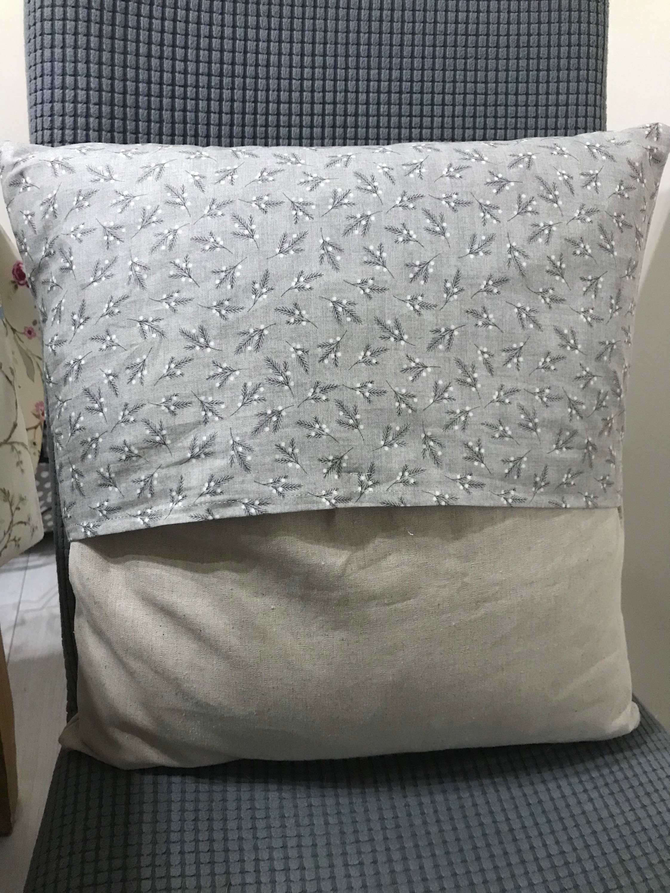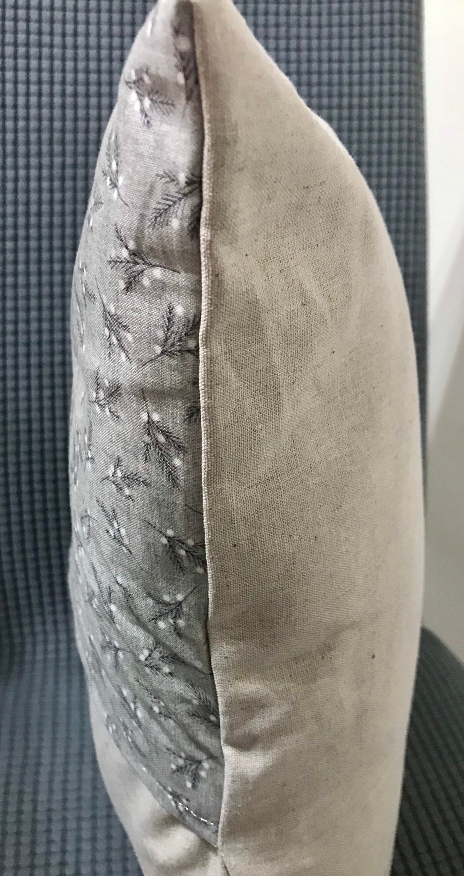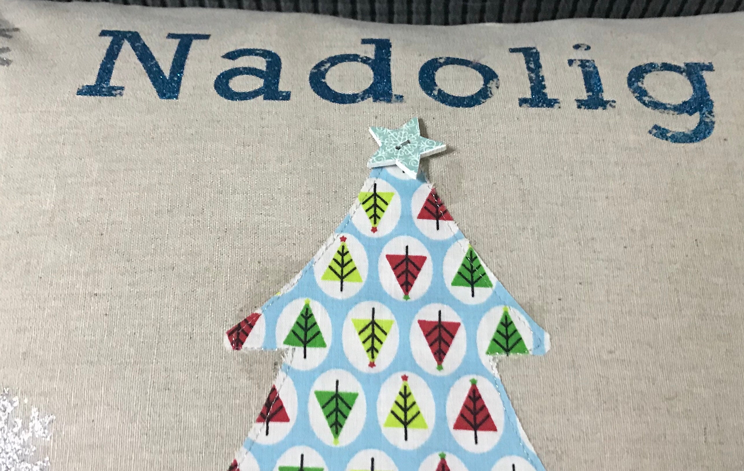 Coeden Nadolig wedi applique arno a bwtwm fel Seren ar ei ben/ Christmas tree appliquéd onto light grey linen fabric & a star button on top of the tree .