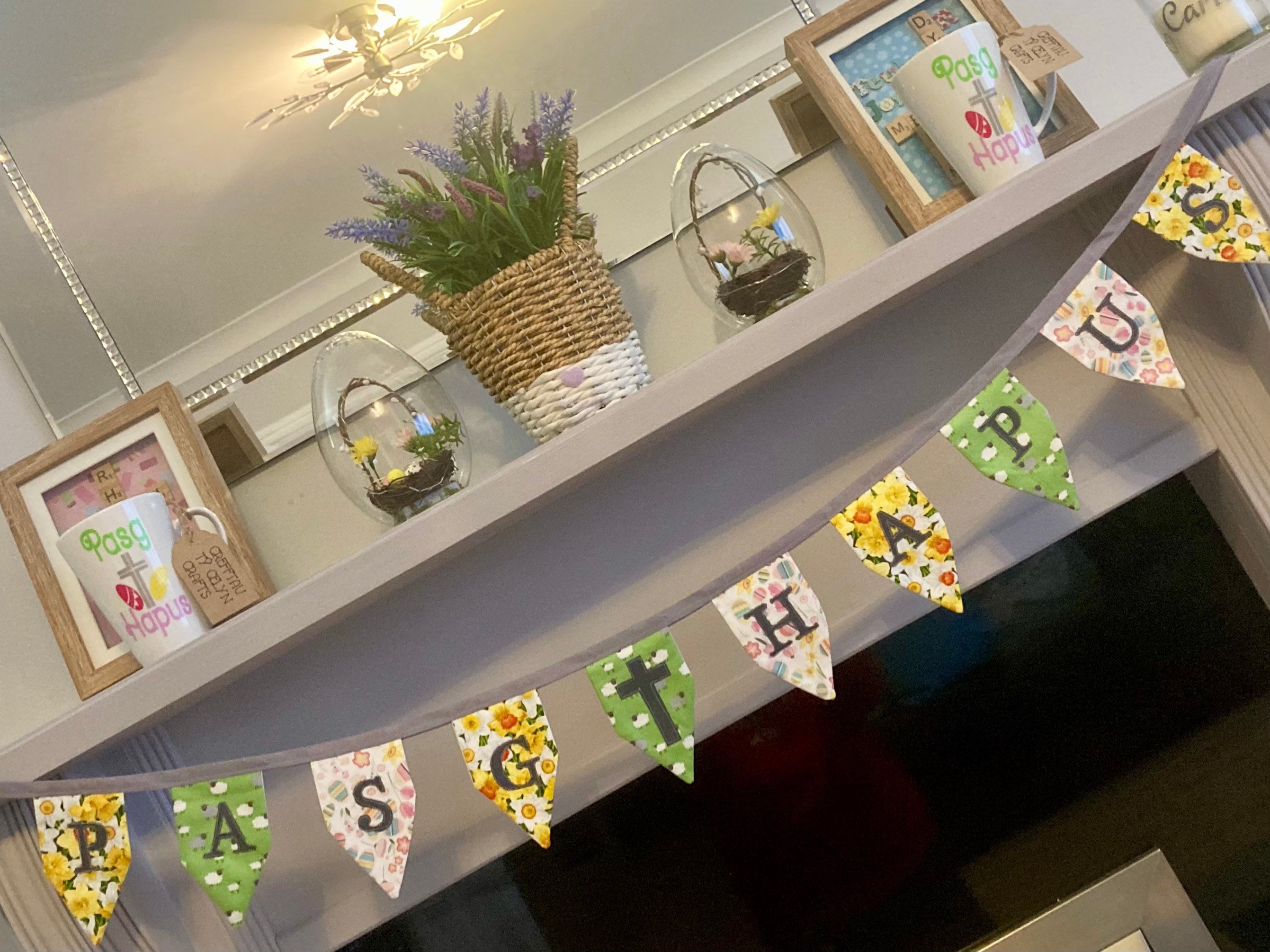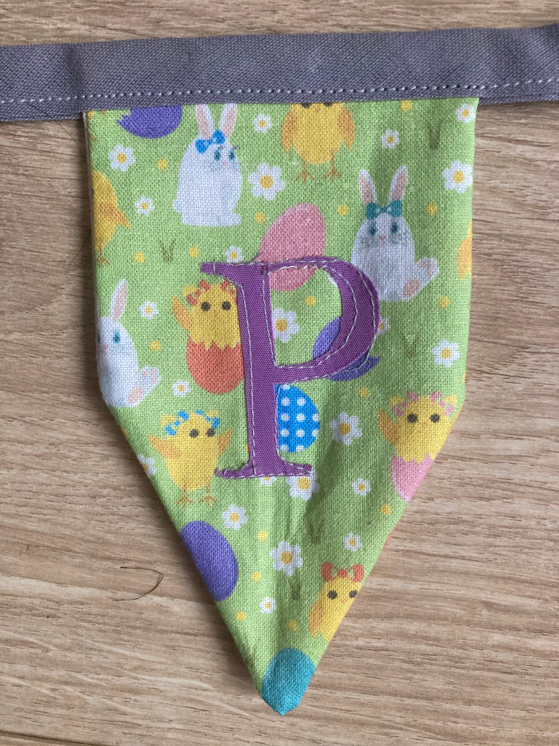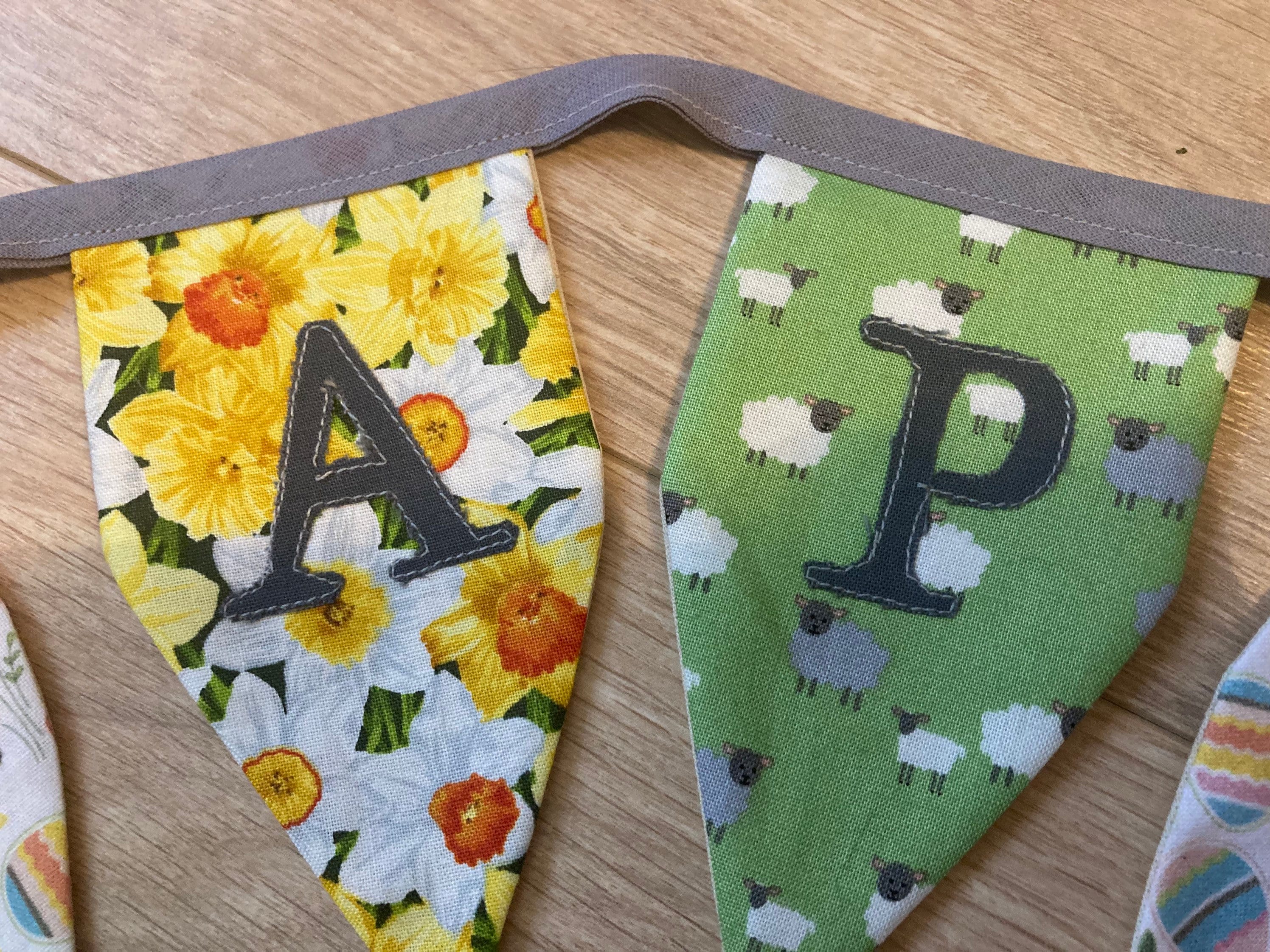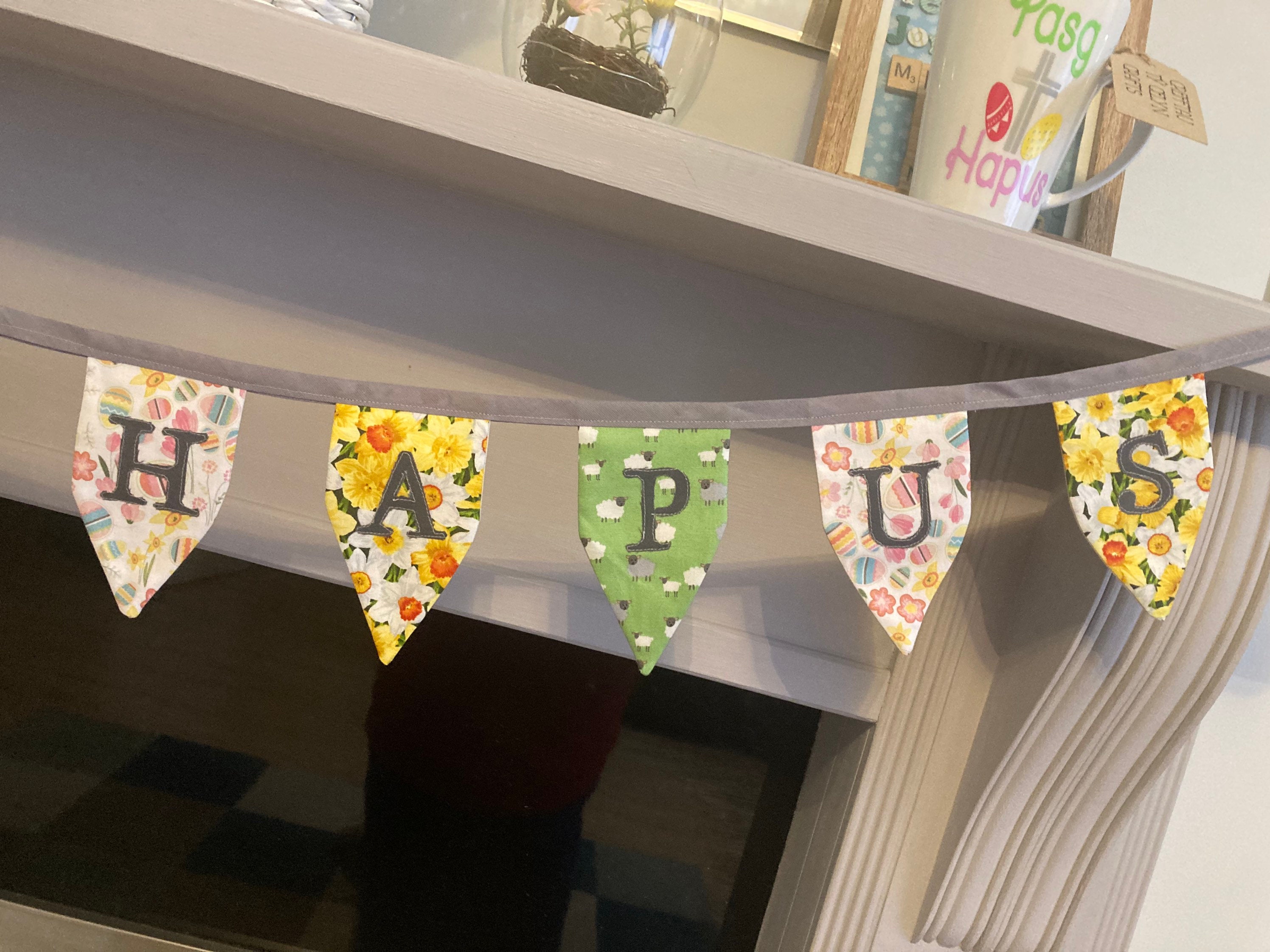 HAPPY 🐣 EASTER bunting (Welsh Pasg Hapus is shown in pictures as an example). Made with 100% cotton with springtime/ Easter patterns. Heat transfer vinyl letters on the flags.